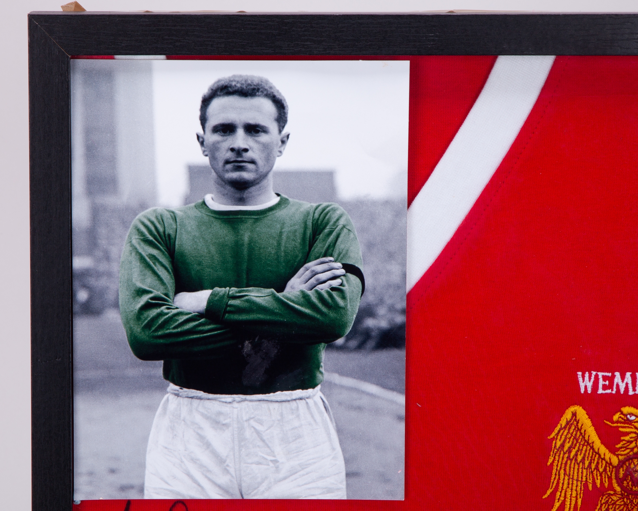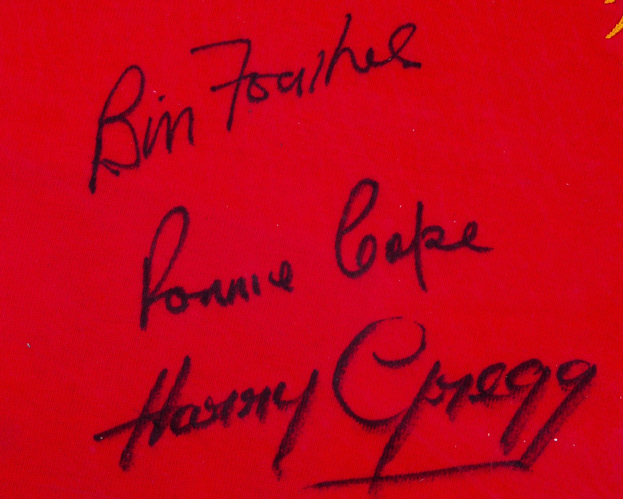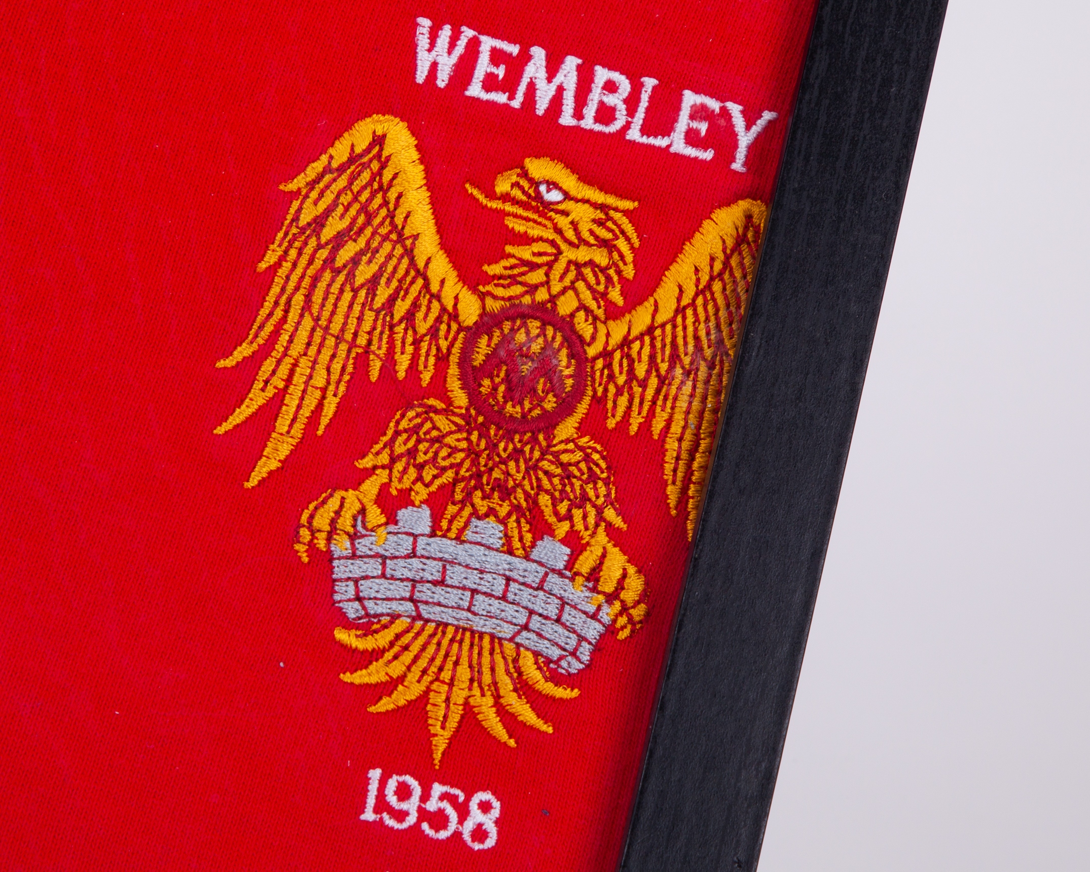 Red Manchester United Wembley 1958 autographed replica shirt, with v-neck collar and embroidered badge, with five autographs including Alex Dawson, Bill Foulkes, Ronnie Cope, Harry Greg and Stan Crowther, framed and glazed, 32 x 42cm, loose and taped at the back