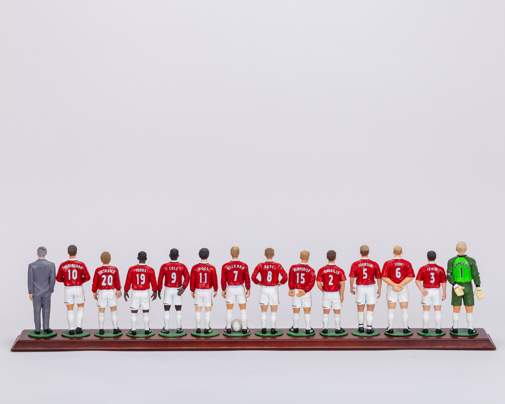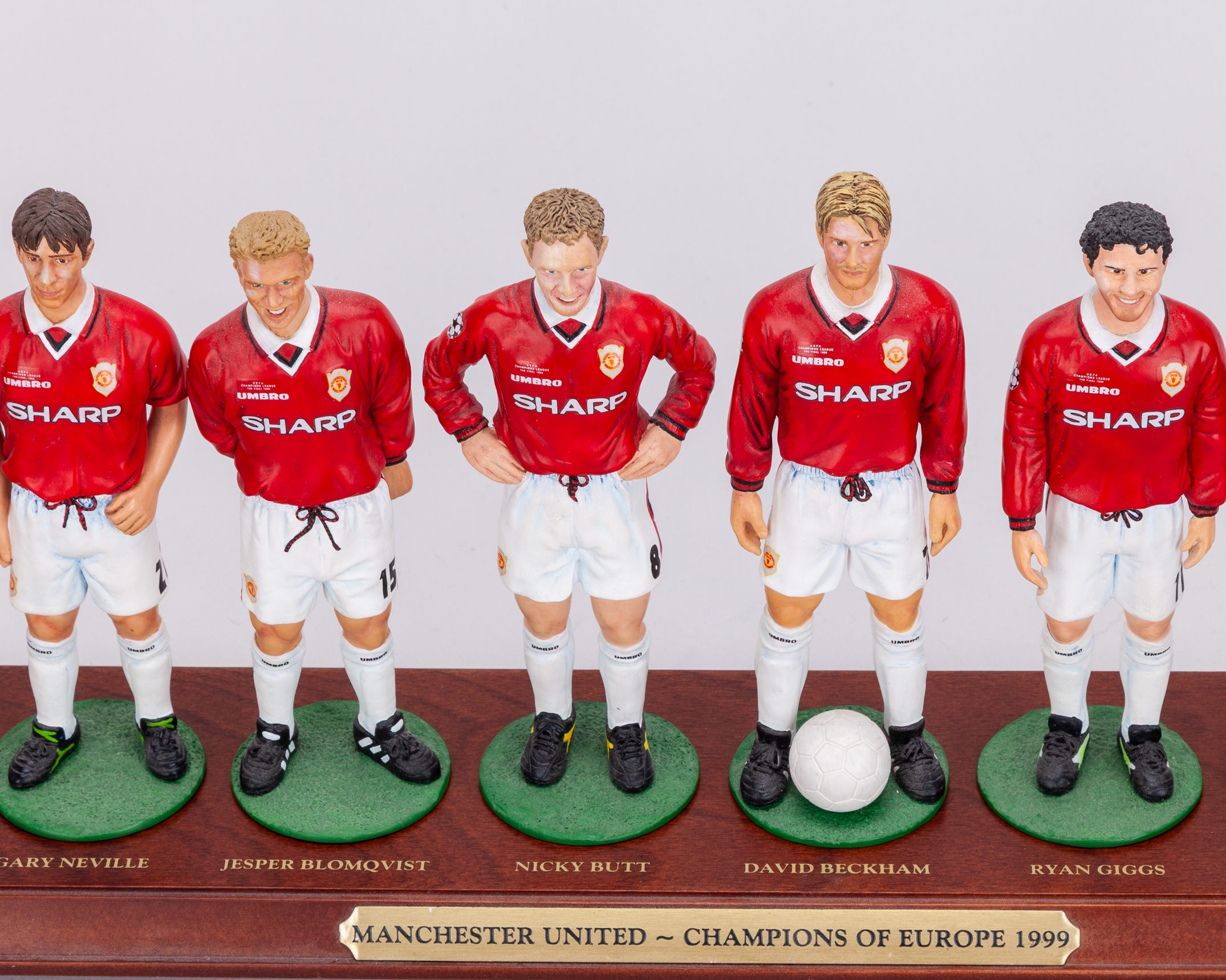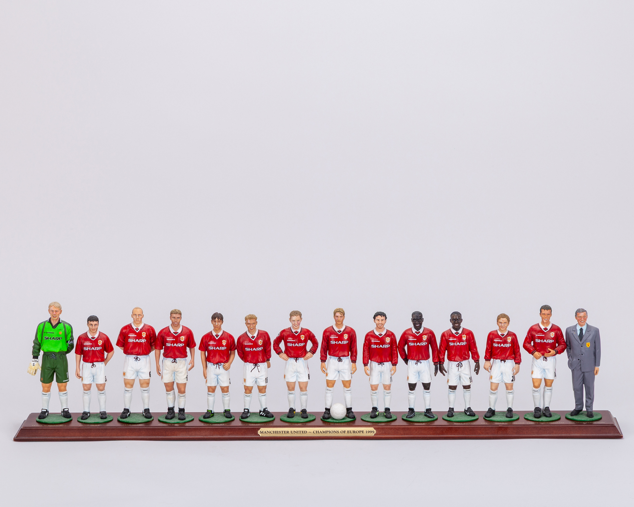 Rare set of Danbury Mint 1999 Champions League Final Manchester United final squad figures, the porcelain figures wearing Champion League final shirts, with original plinth, Giggs with a crack to the knee