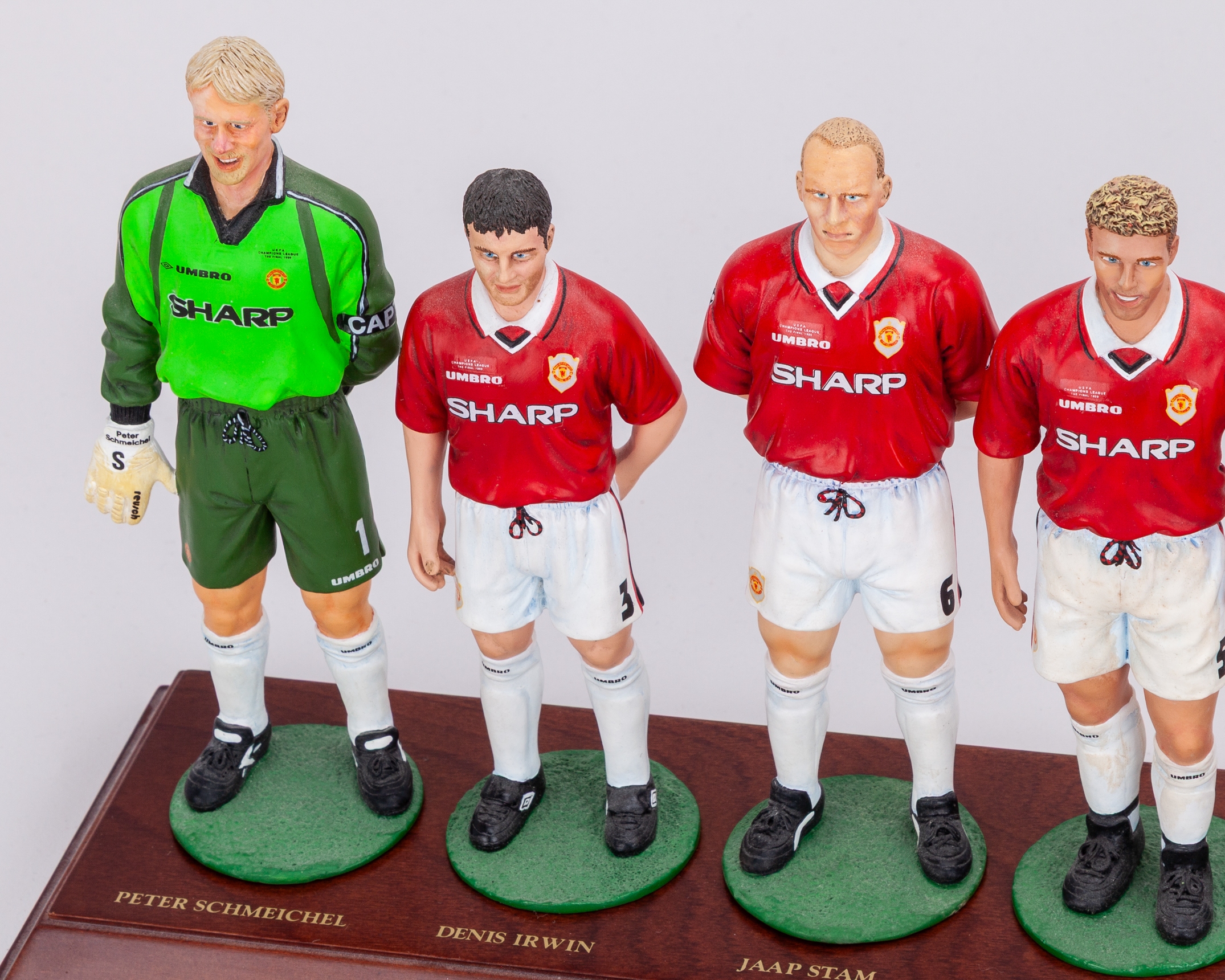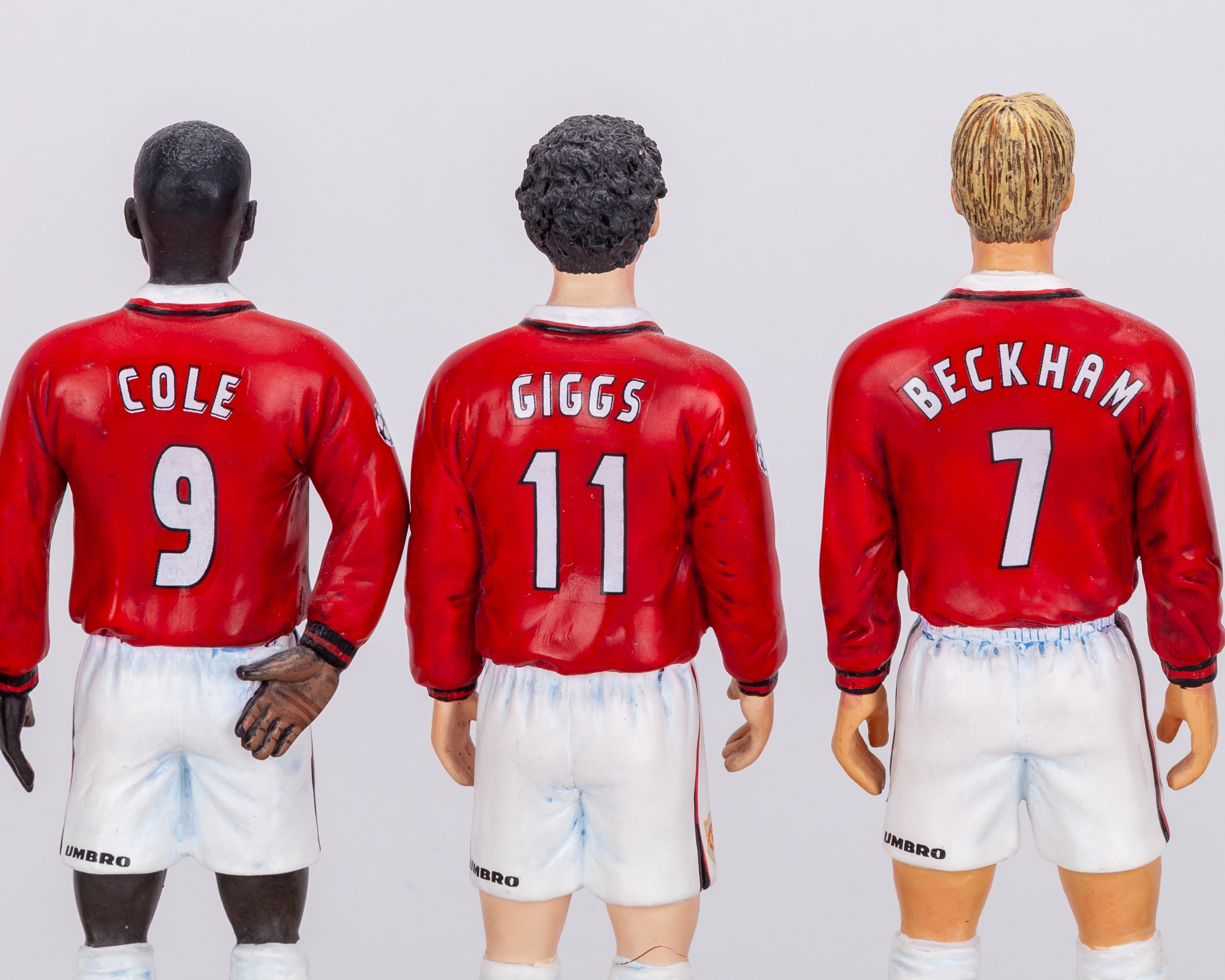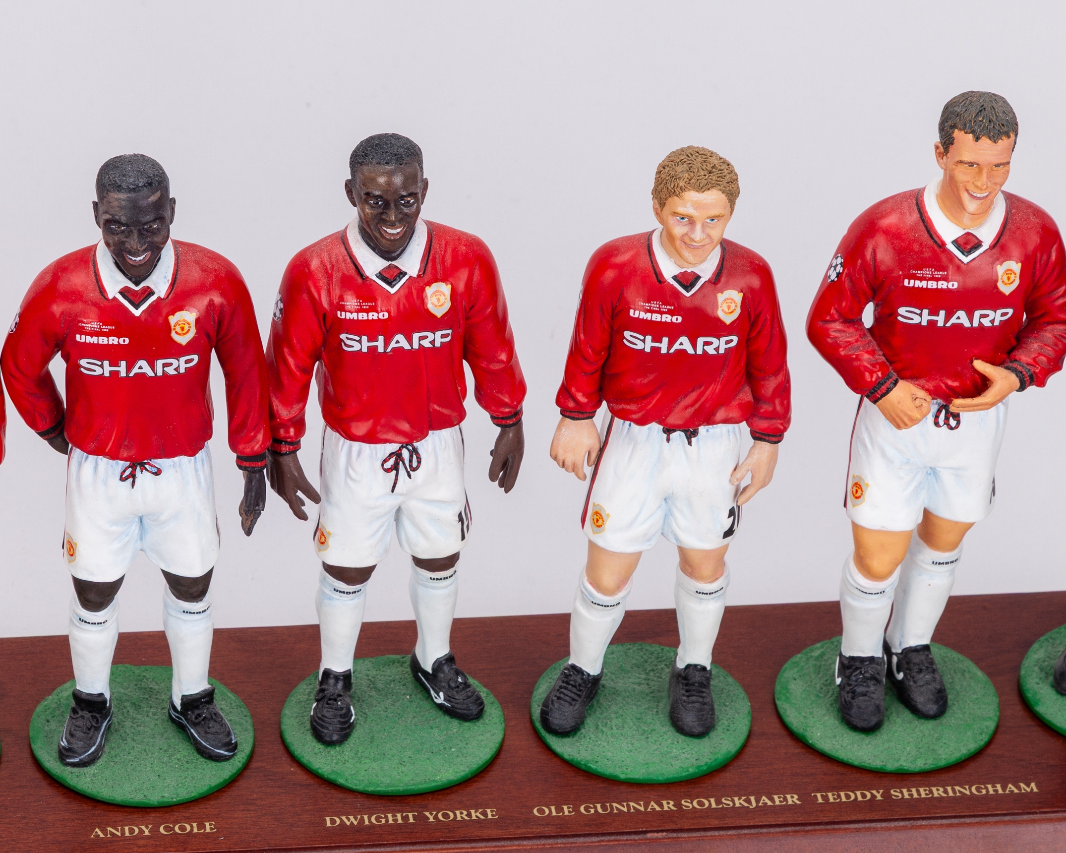 Rare set of Danbury Mint 1999 Champions League Final Manchester United final squad figures, the porcelain figures wearing Champion League final shirts, with original plinth, Giggs with a crack to the knee