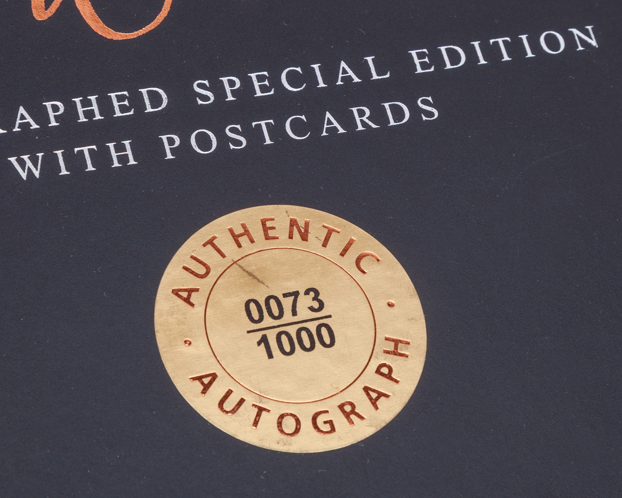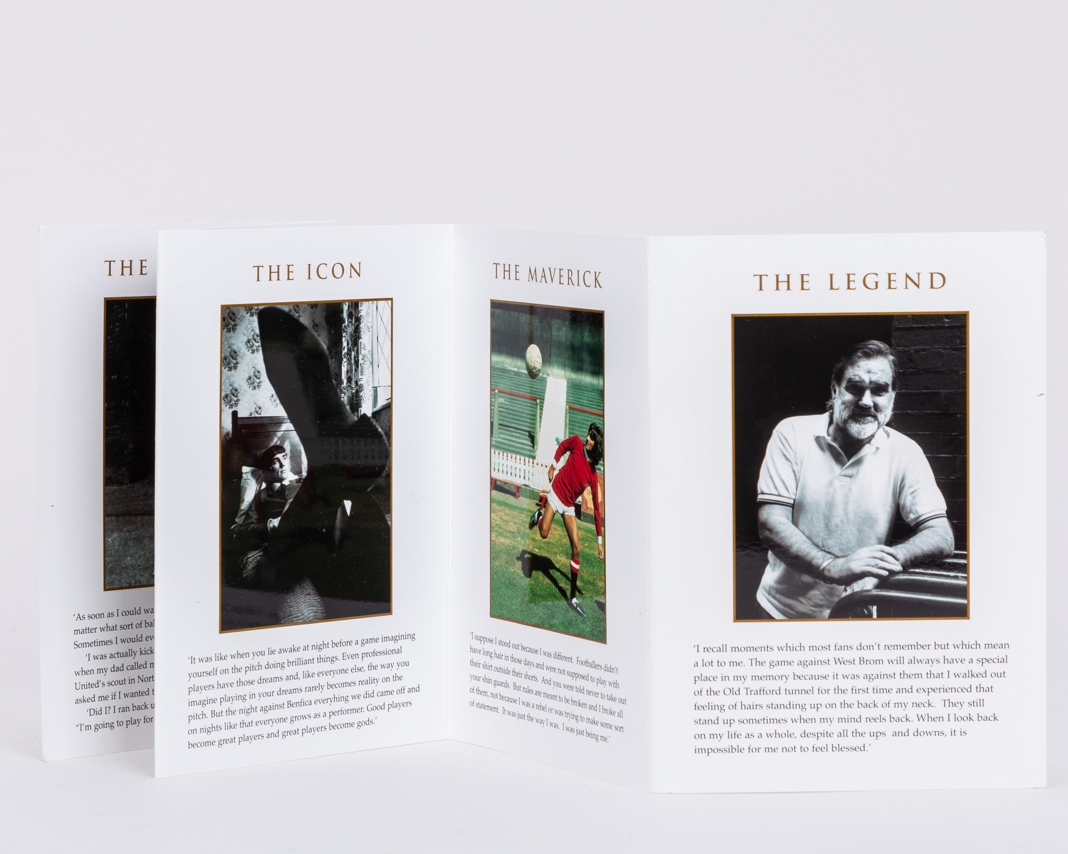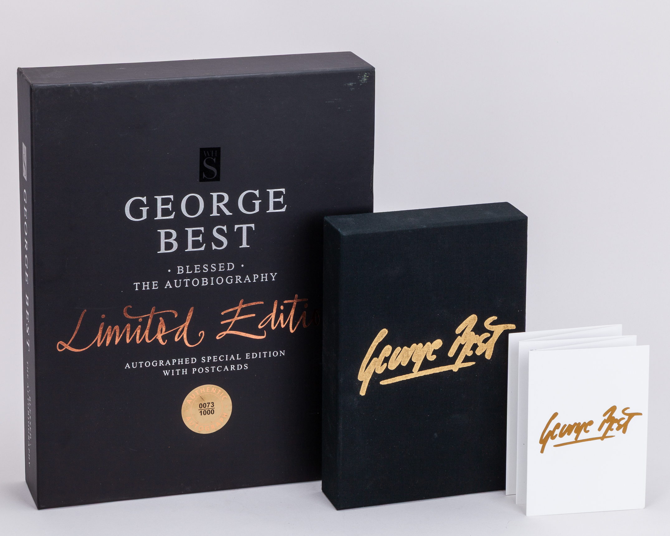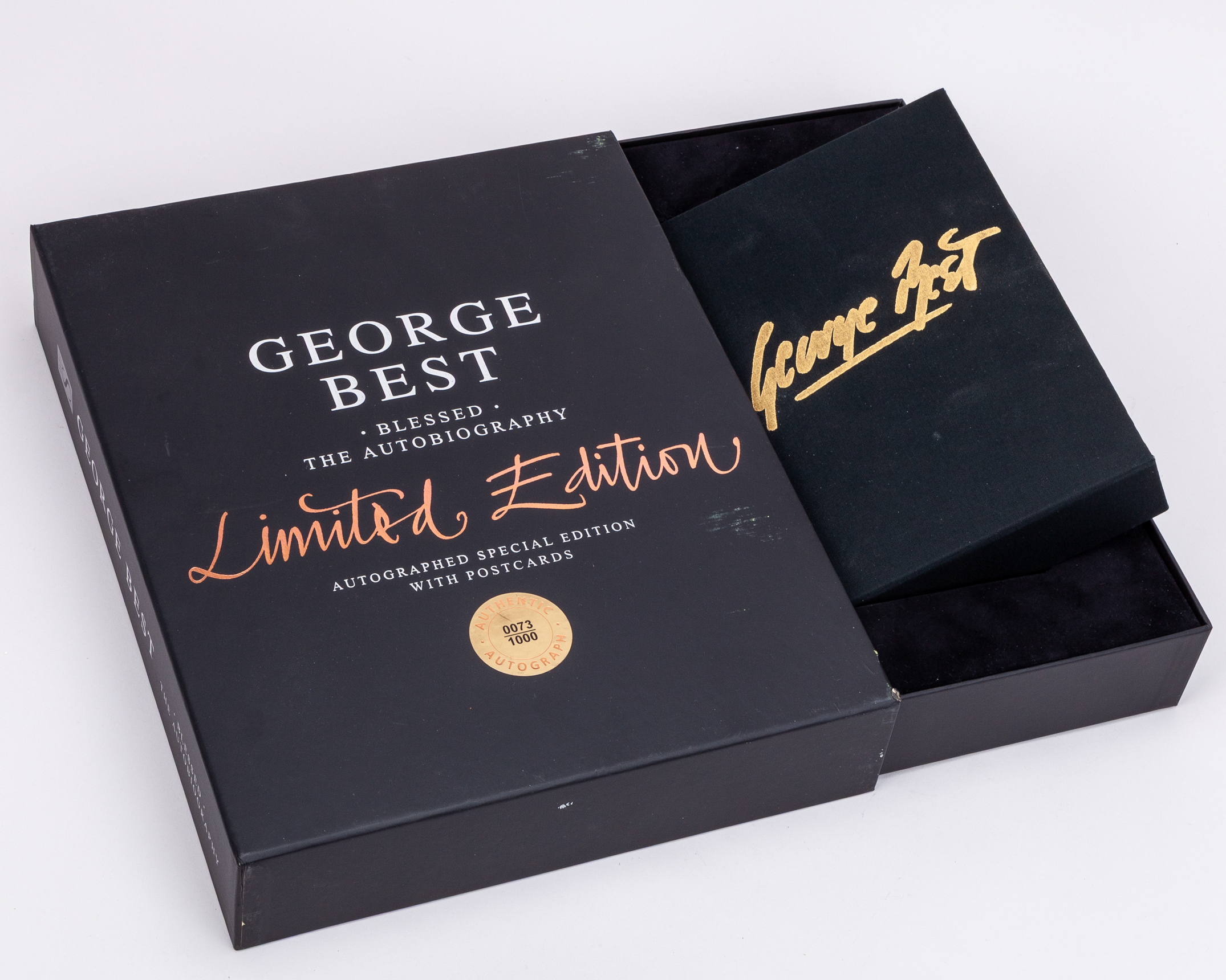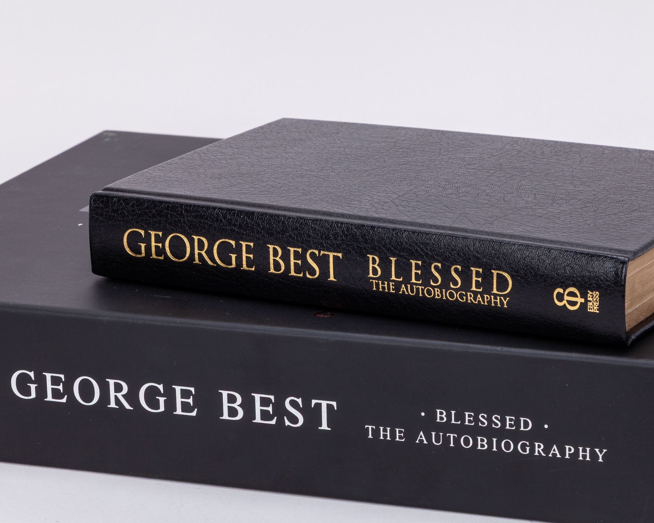 George Best "Blessed" the autobiography cased special edition leather bound hardback, with George Best autograph in black pen on title page, in a fitted hardback sleeve, a fold-out card with images of George Best, contained in a hardback sleeve, bearing authentic autograph 0073 of 1000 sticker, protective case marked with some damage