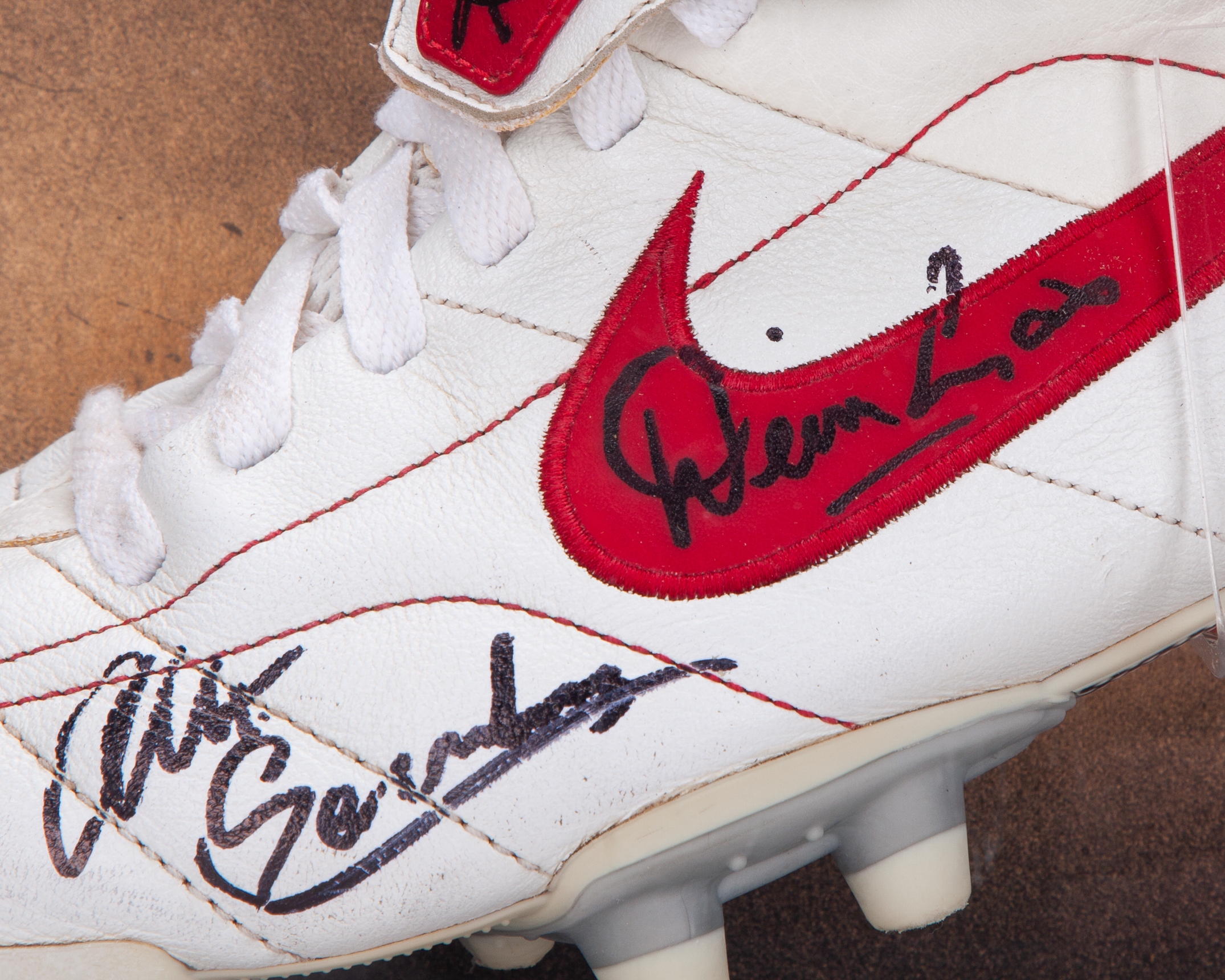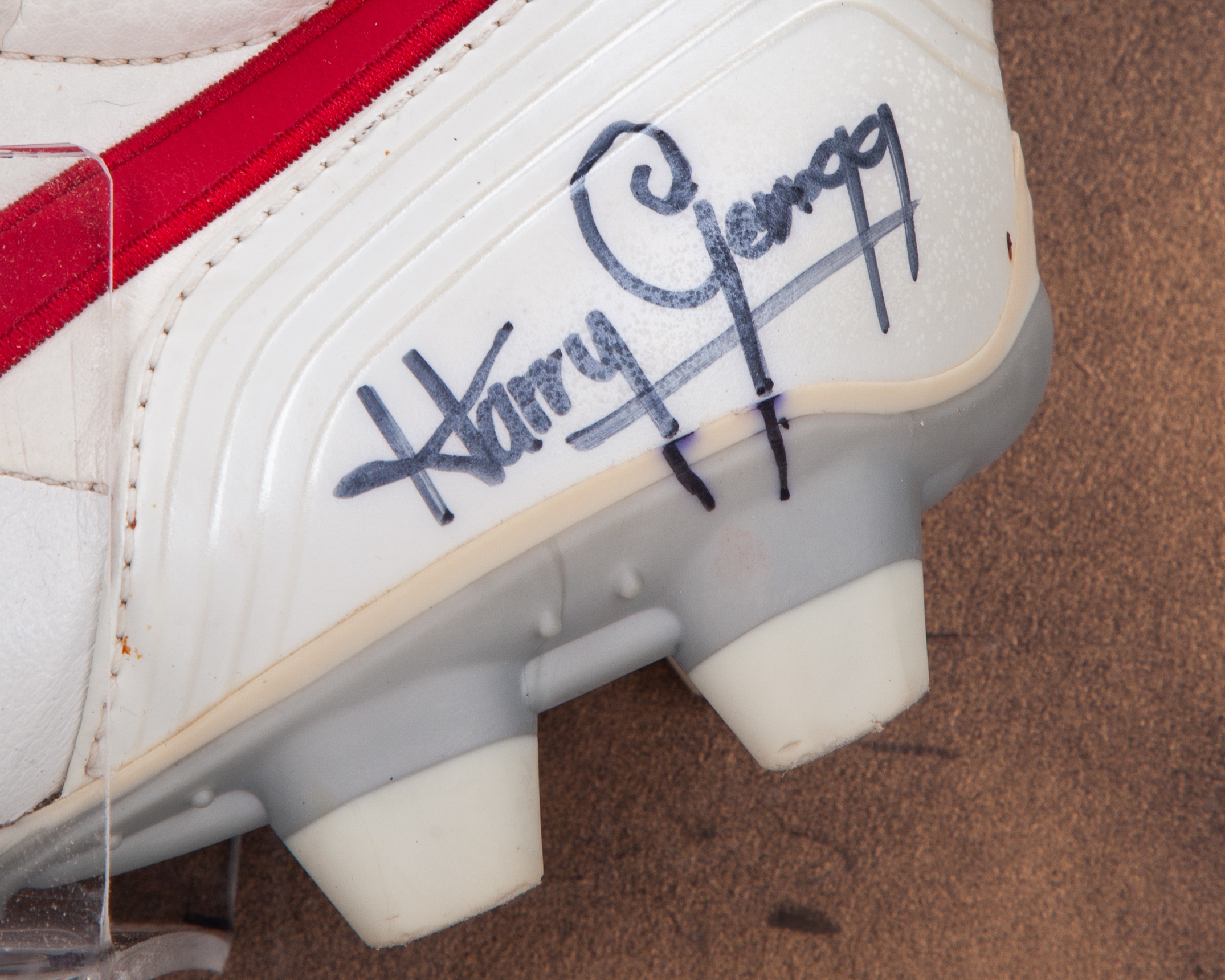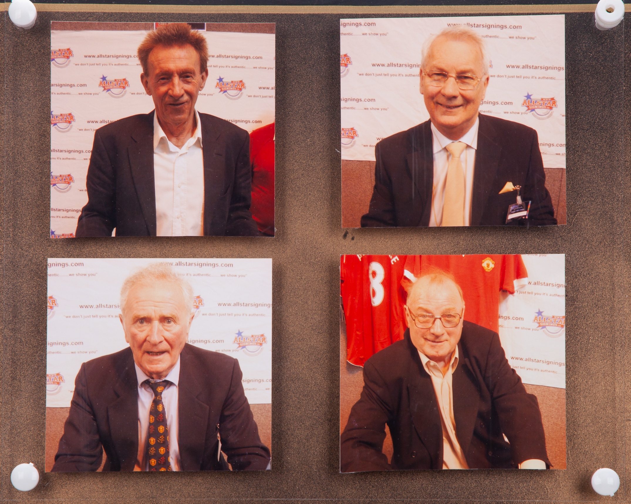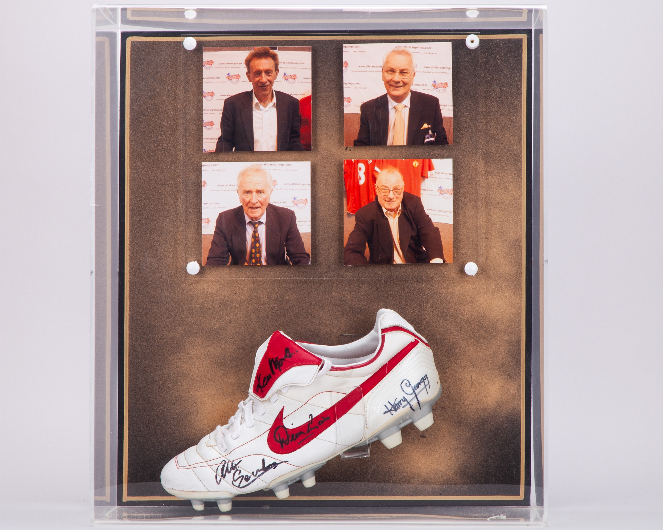 Denis Law, Harry Gregg, Albert Scanlon and Ken Morgan autographed Nike football boot display
