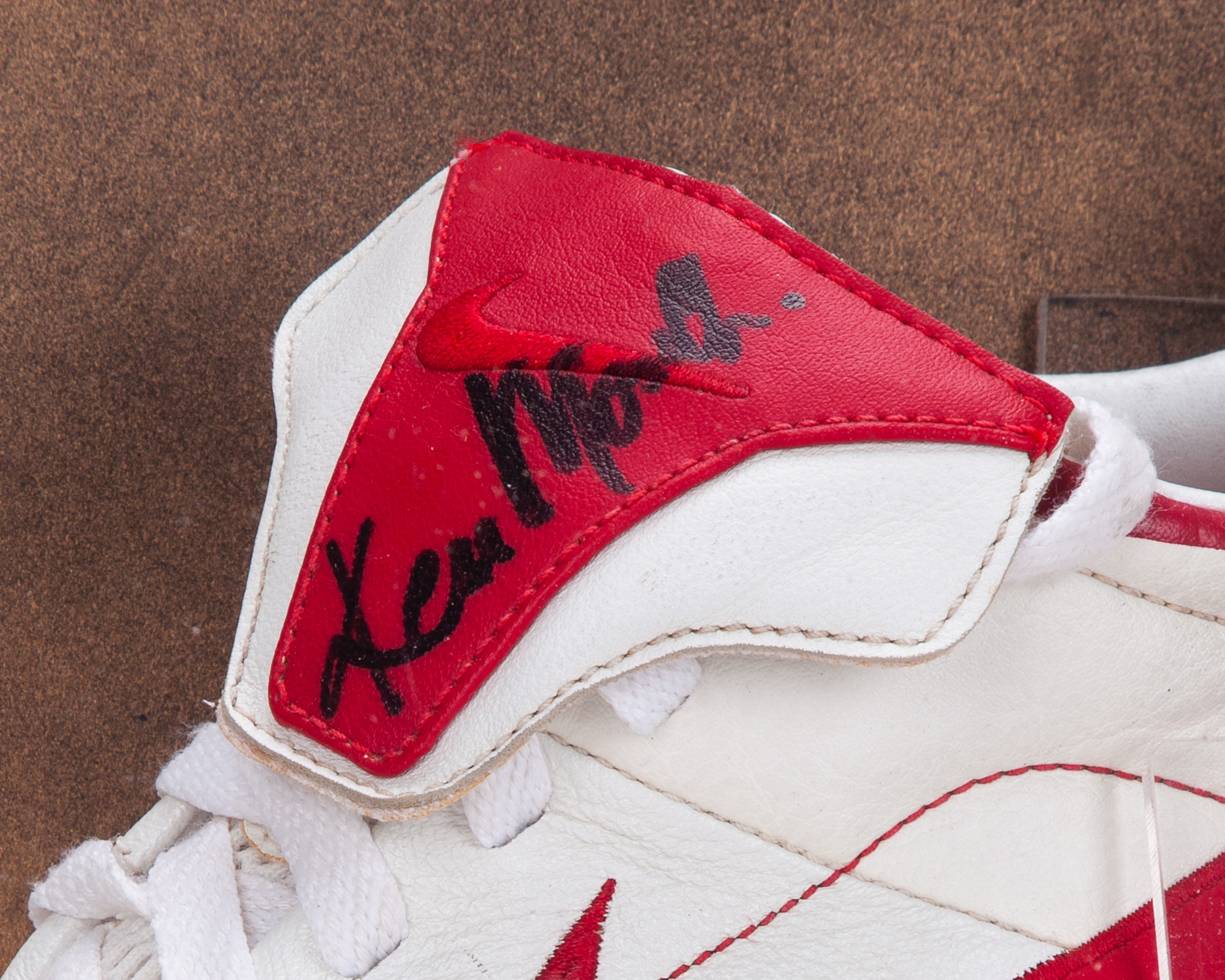 Denis Law, Harry Gregg, Albert Scanlon and Ken Morgan autographed white and red Nike football boot display, with four pictures of the former footballers at a signing event, in a display case, 40 x 45 x 18cm