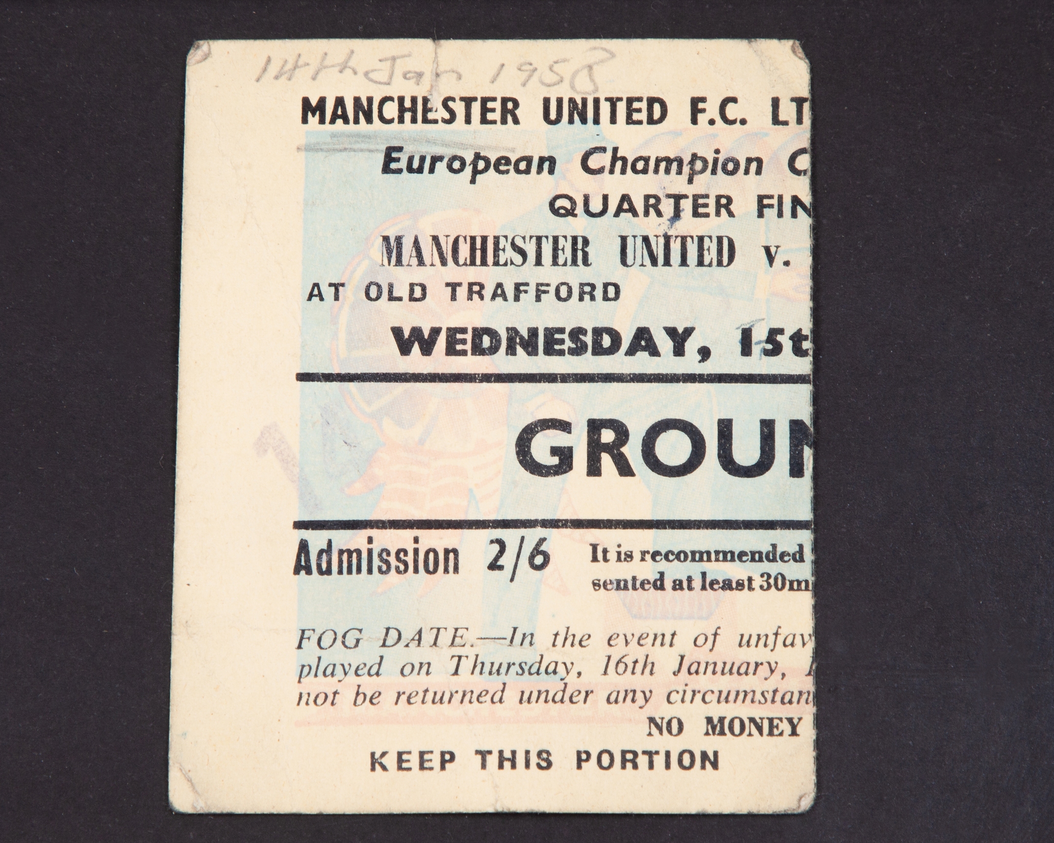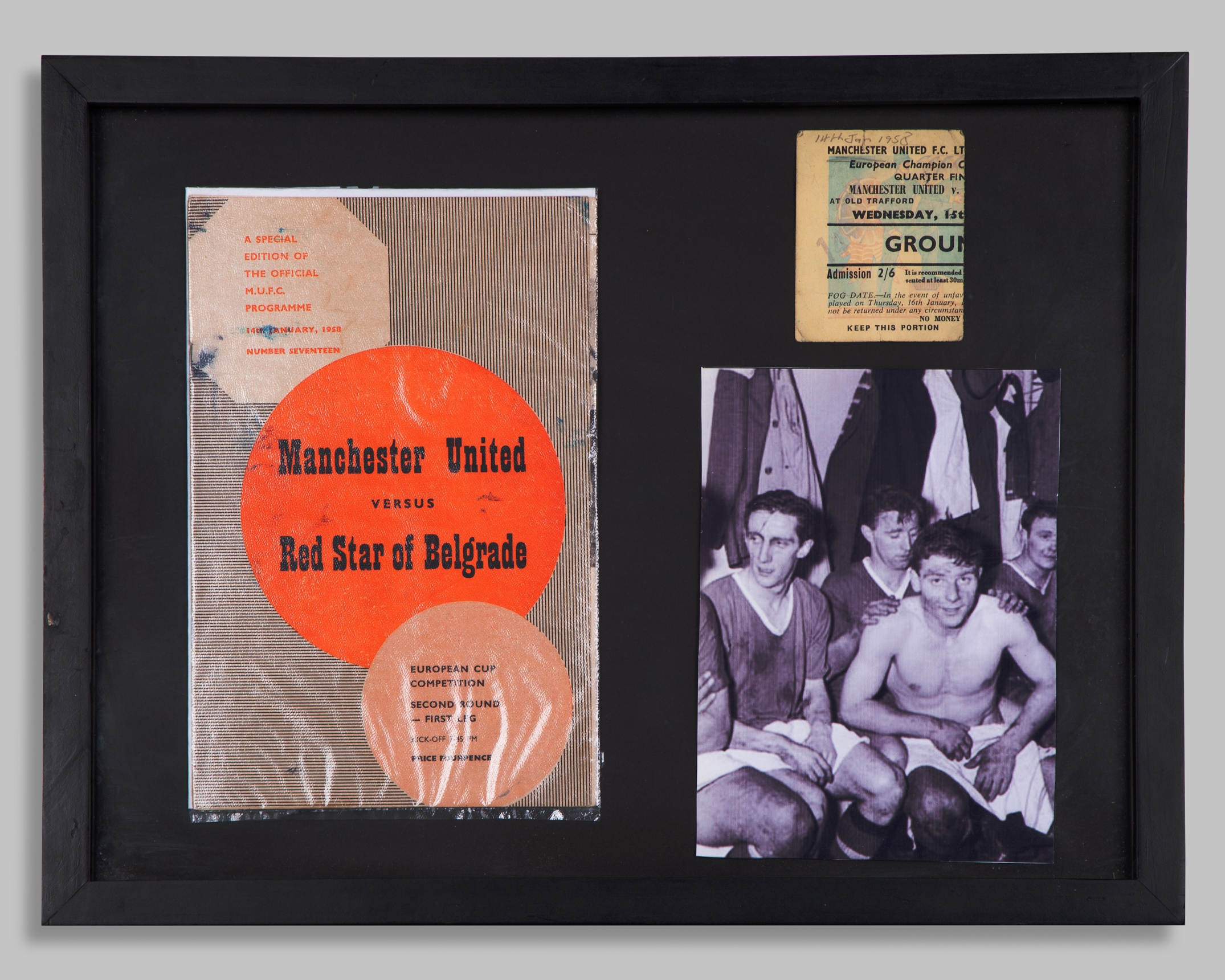 Manchester United v. Red Star Belgrade European Cup programme and ticket stub display, 1958
