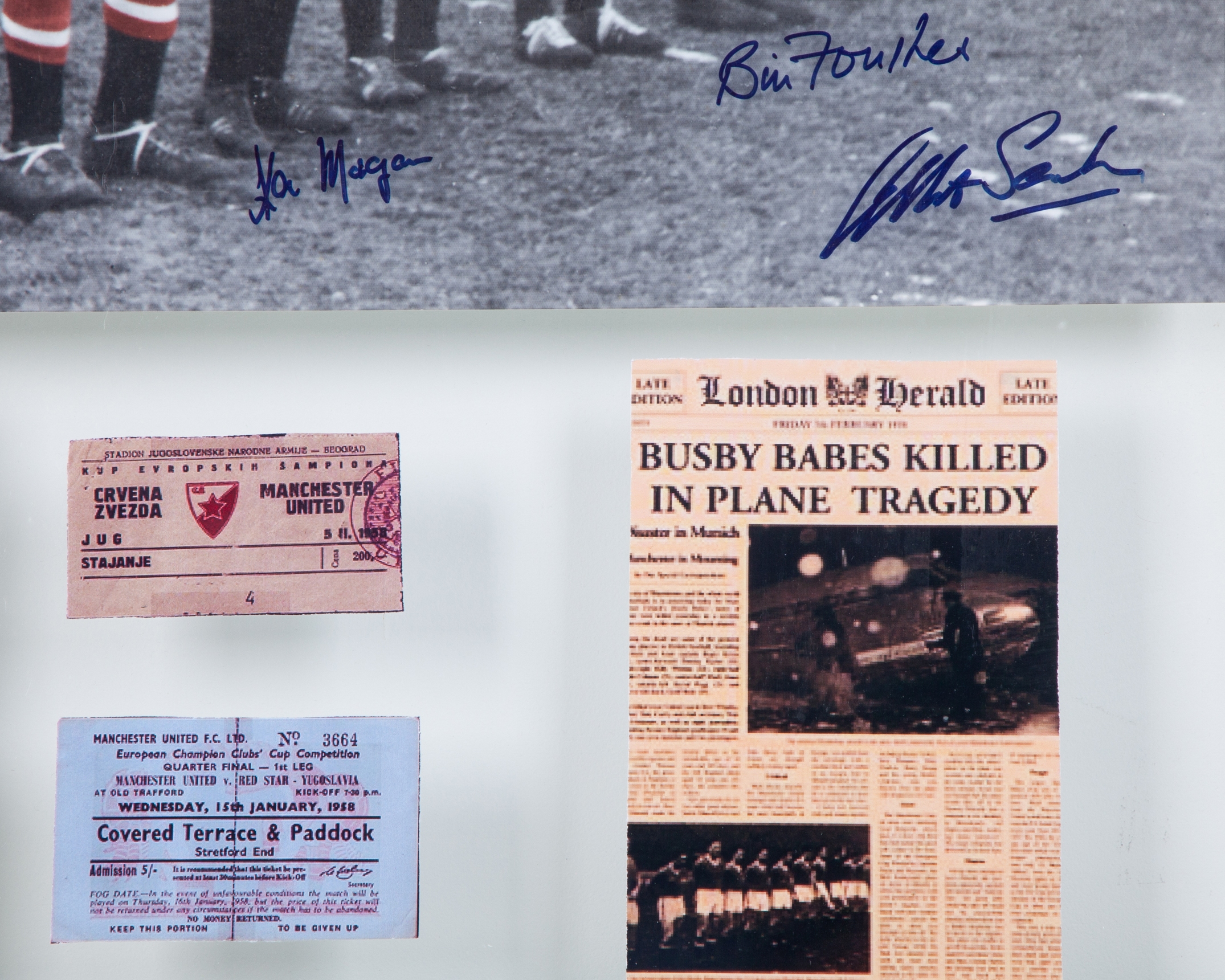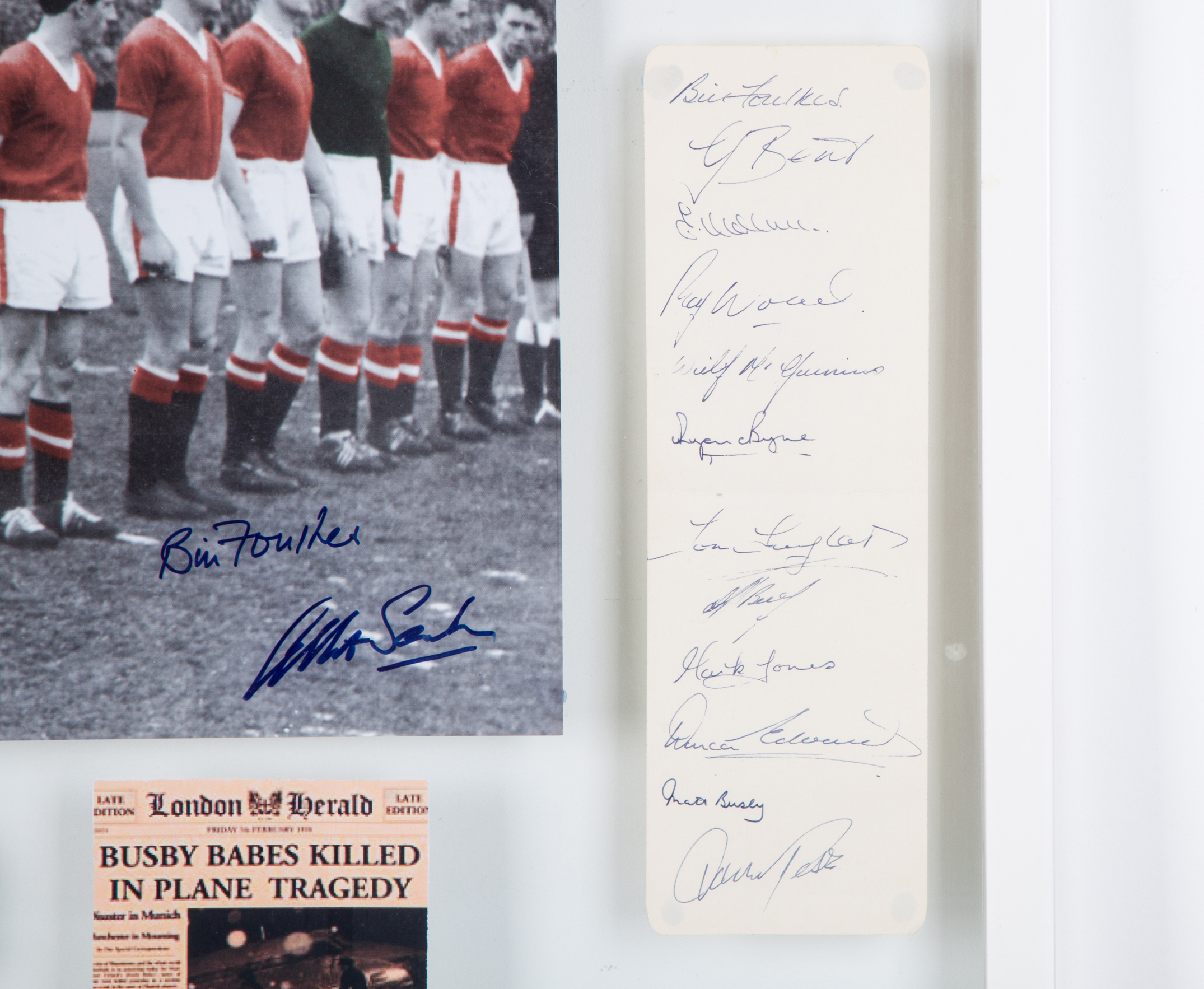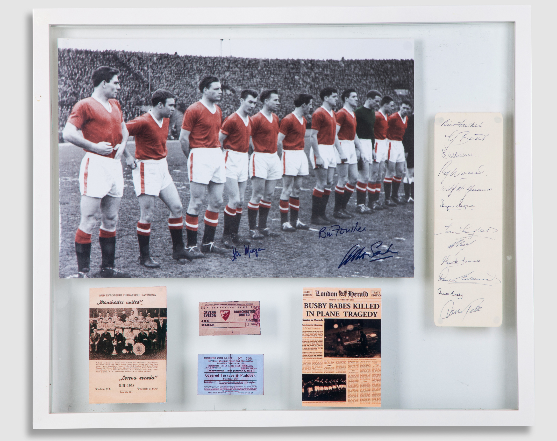 Manchester United Busby Babes autographed page spread display, with twelve autographs including Bill Foulkes, Duncan Edwards, Matt Busby and Roger Byrne etc., including a photograph of the on the pitch line-up with three autographs, framed and glazed, 63 x 53cm