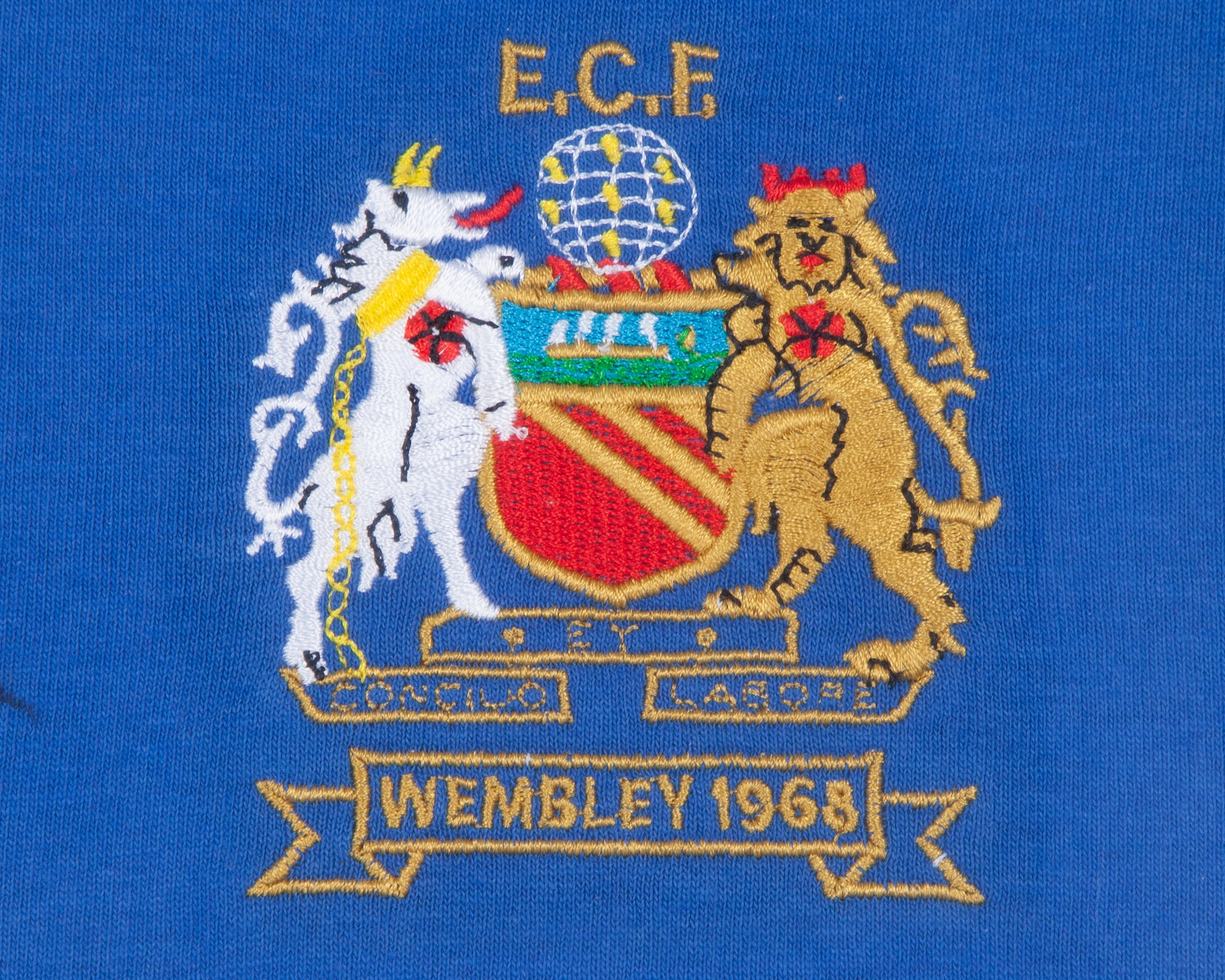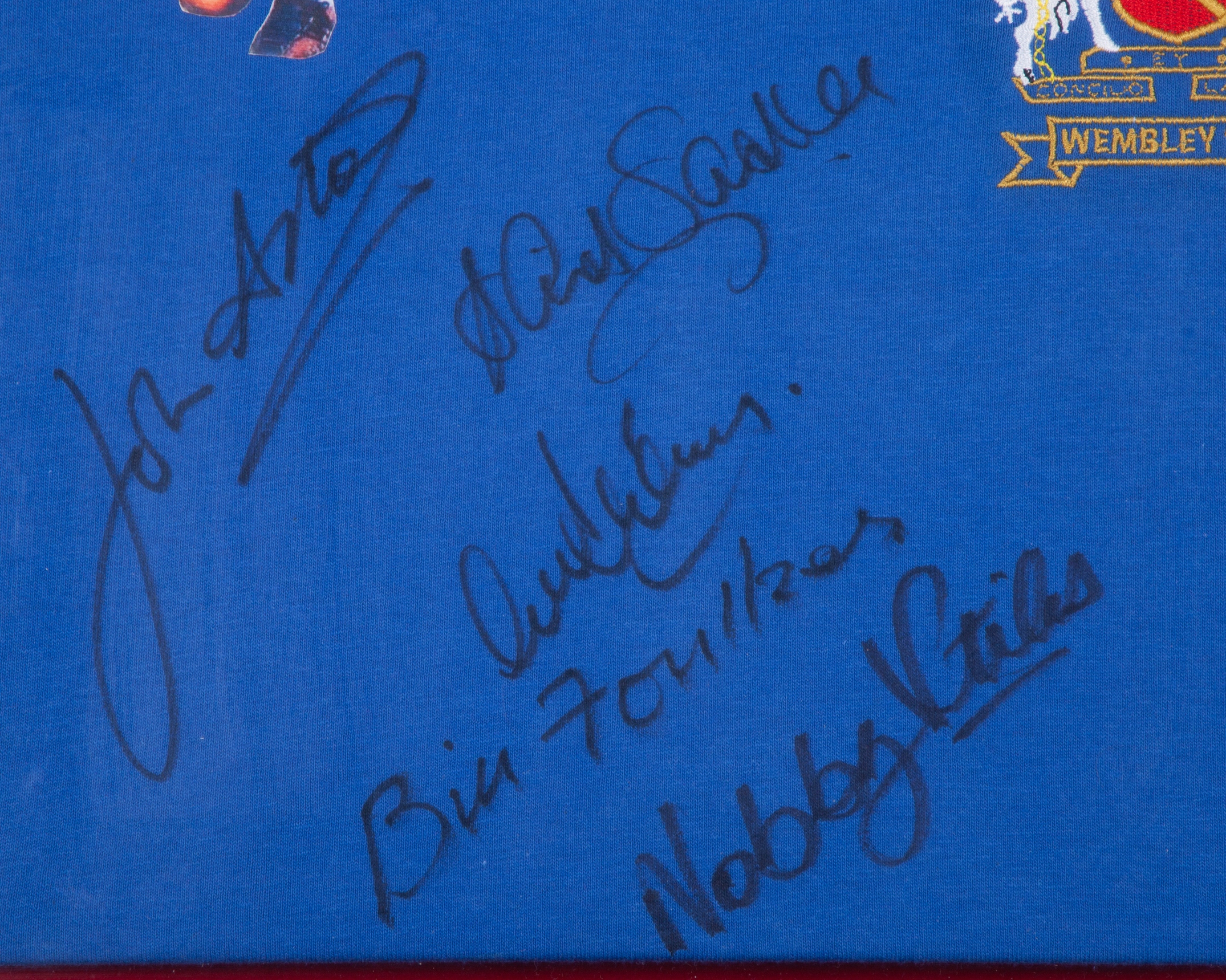 Blue Manchester United autographed Wembley 1968 shirt display, with five autographs including Nobby Stiles, Bill Foulkes and John Aston etc., with a cutout picture of George Best on the shirt, framed and glazed, 47 x 53cm