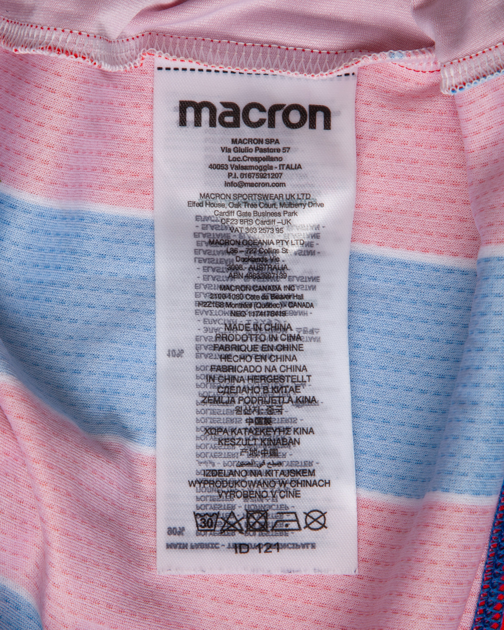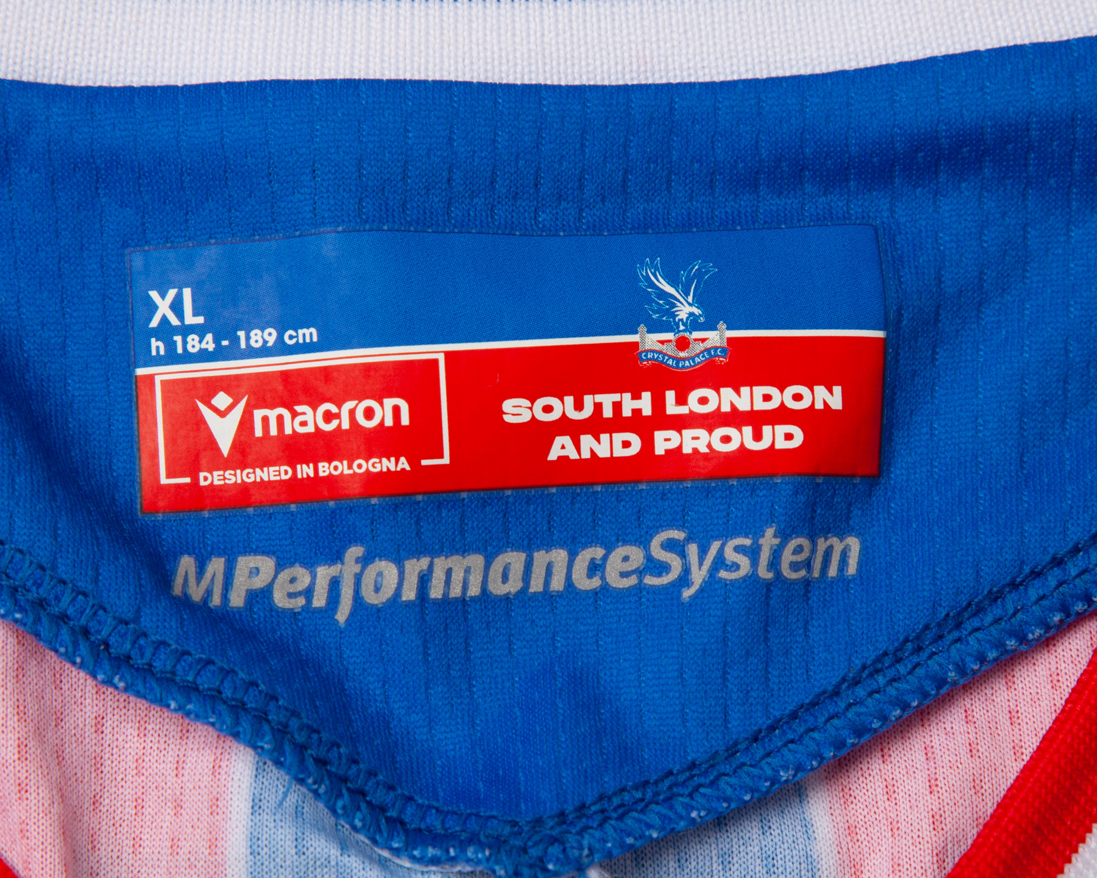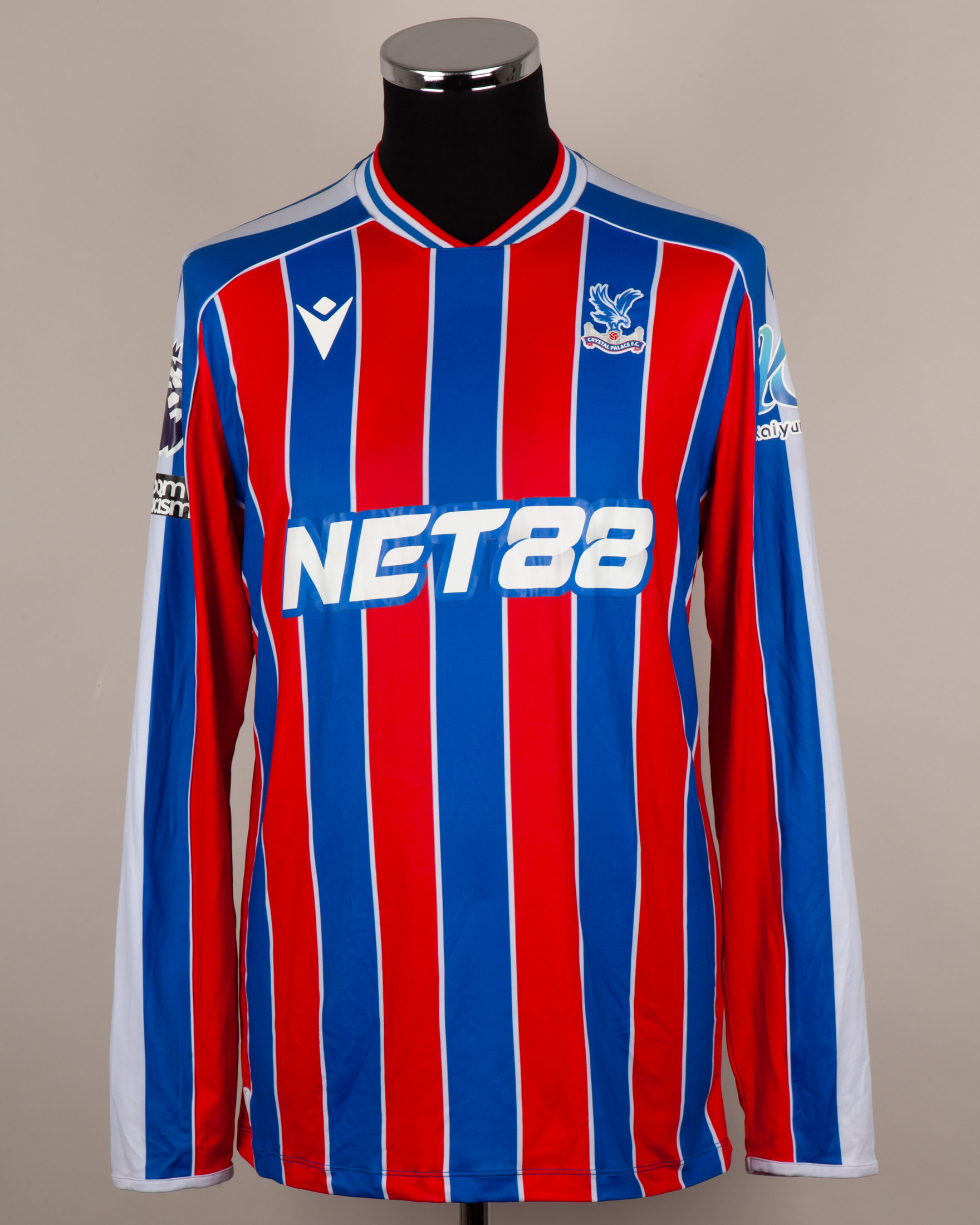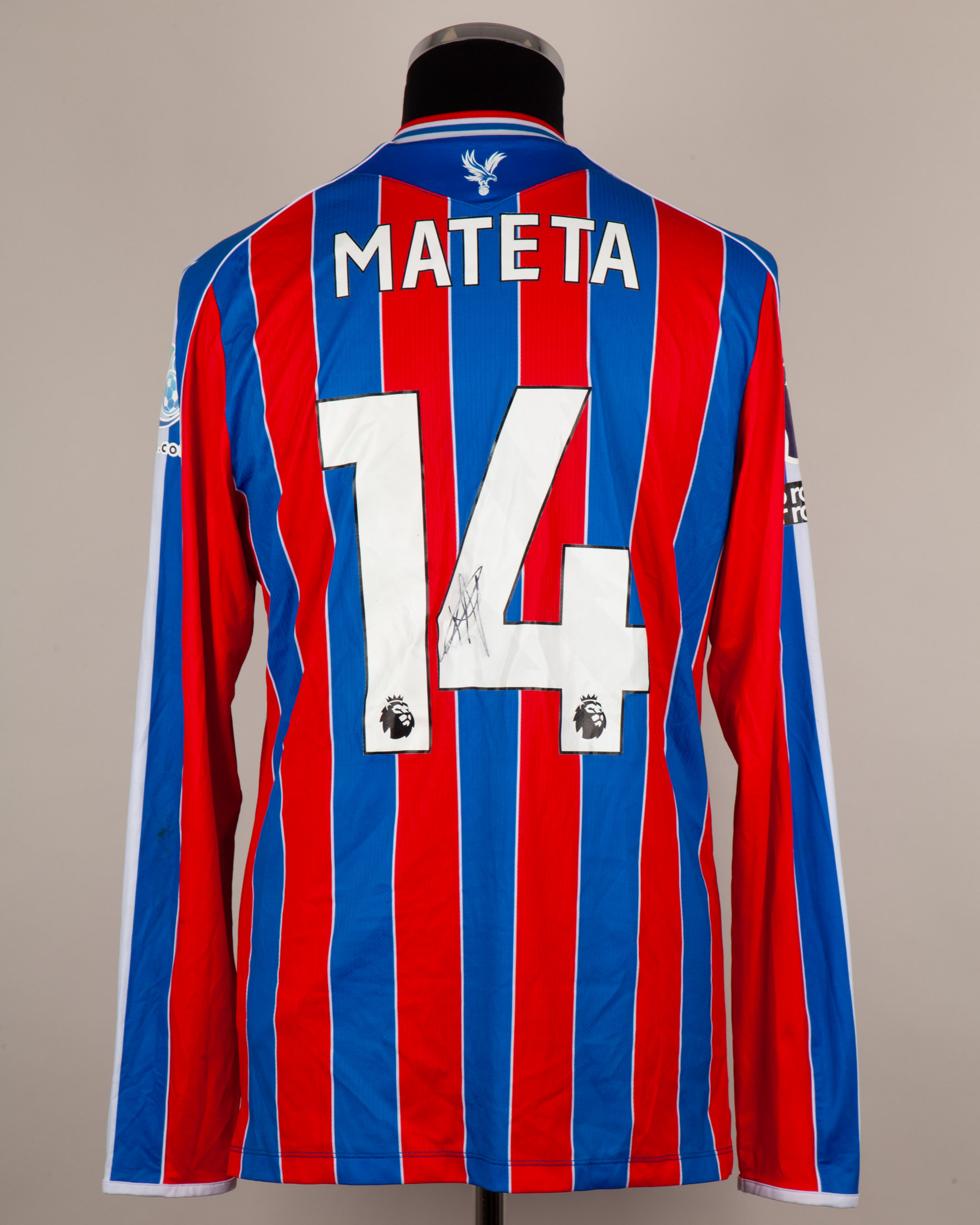 Jean-Philippe Mateta red and blue No.14 Crystal Palace v. Sunderland match worn shirt, Premier League 2025, Macron, with crew-neck collar and printed badge, the reverse lettered MATETA, the number autographed, the right sleeve with Premier League logo
