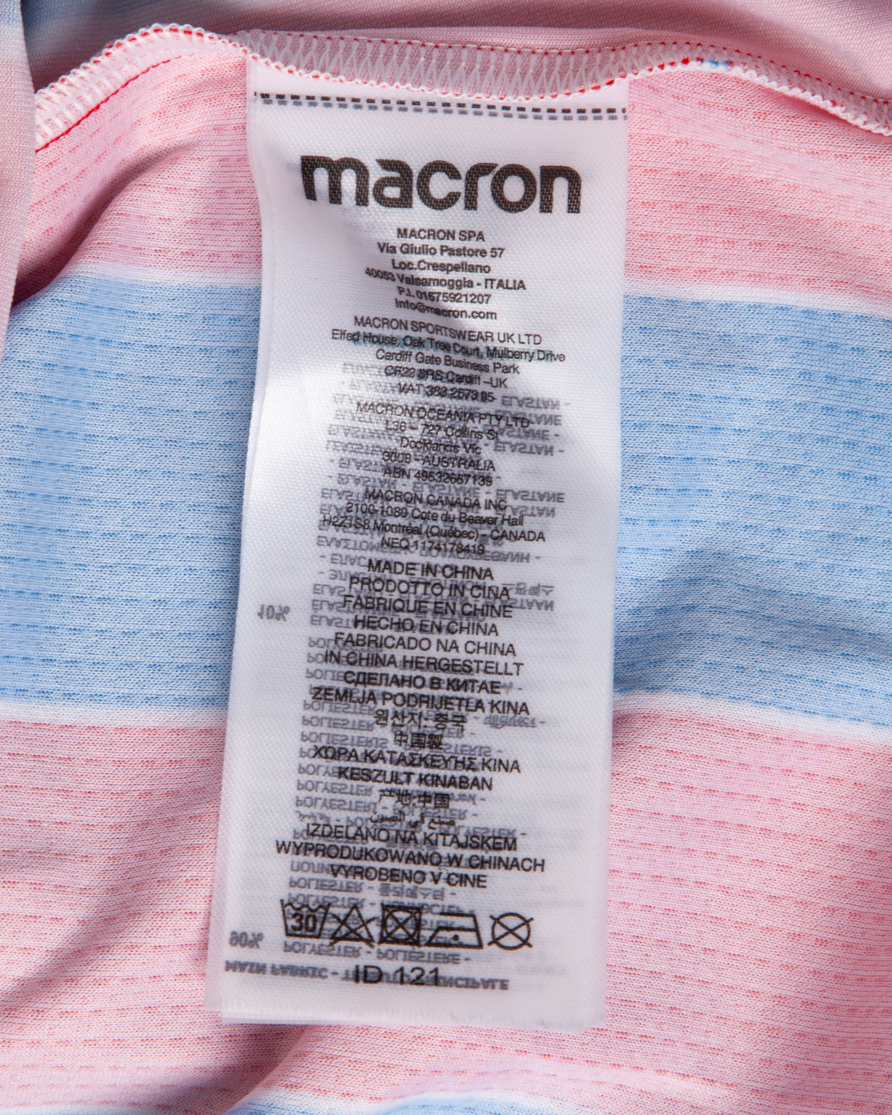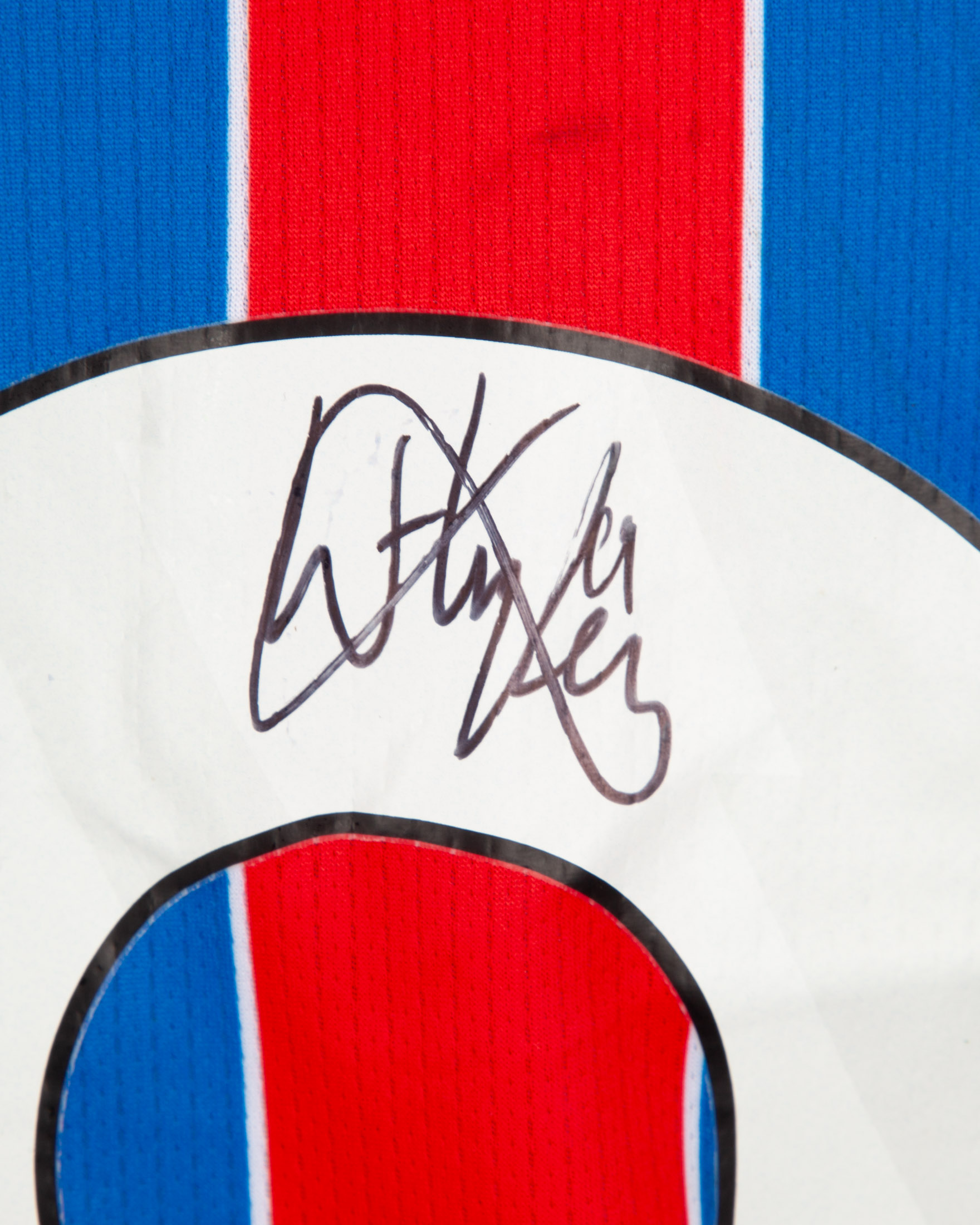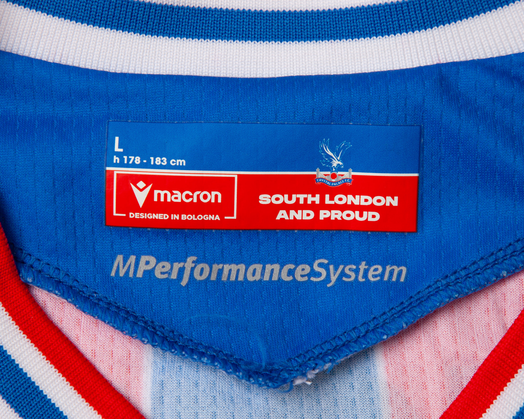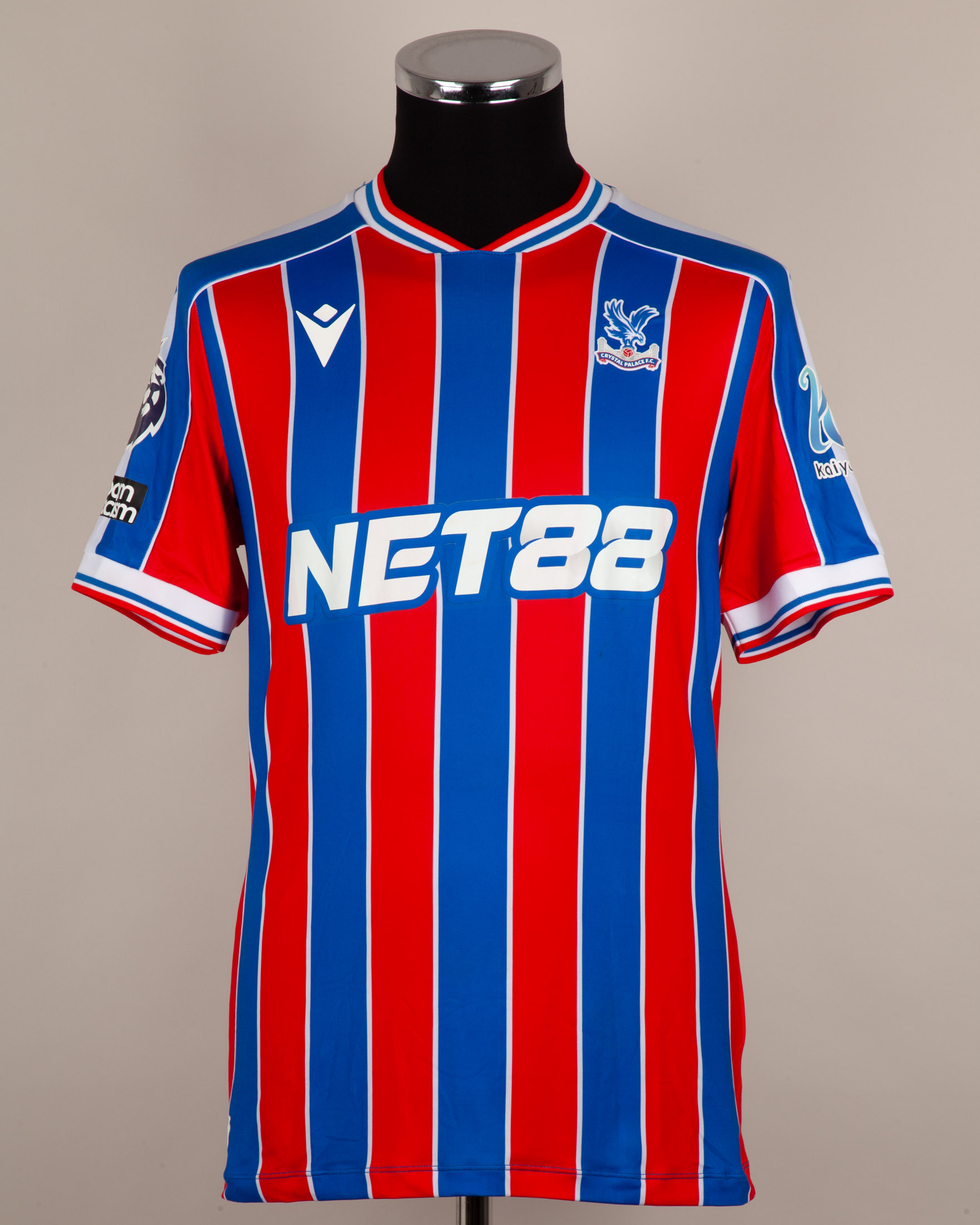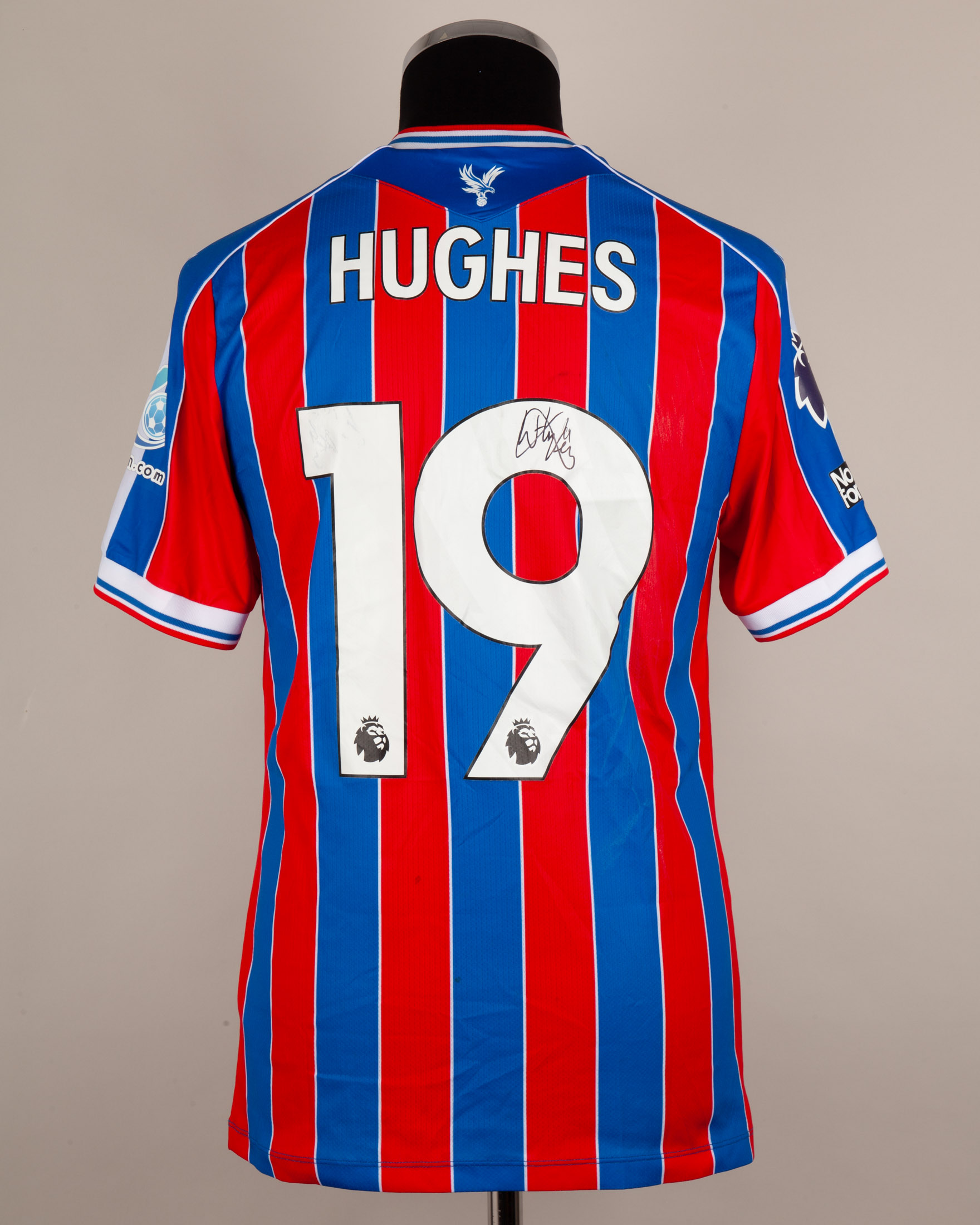 Will Hughes red and blue No.19 Crystal Palace v. Sunderland match worn shirt, Premier League 2025, Macron, with crew-neck collar and printed badge, the reverse lettered HUGHES, the number autographed, the right sleeve with Premier League logo