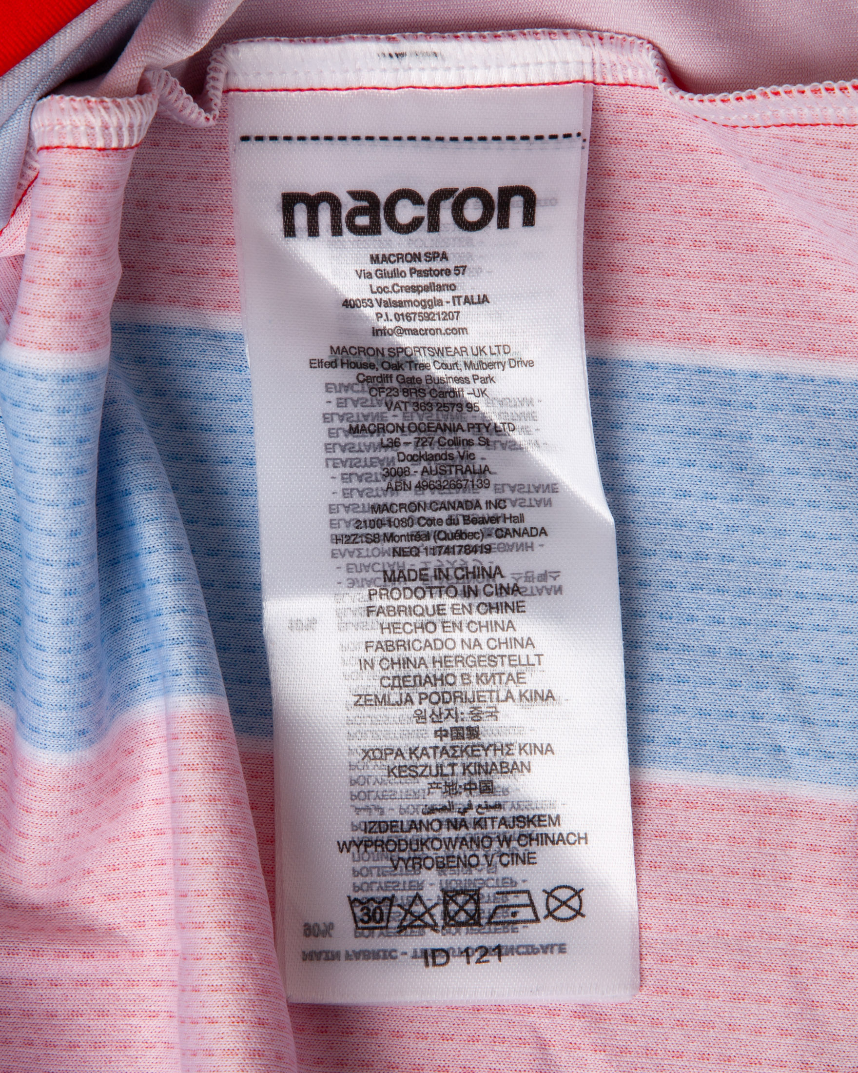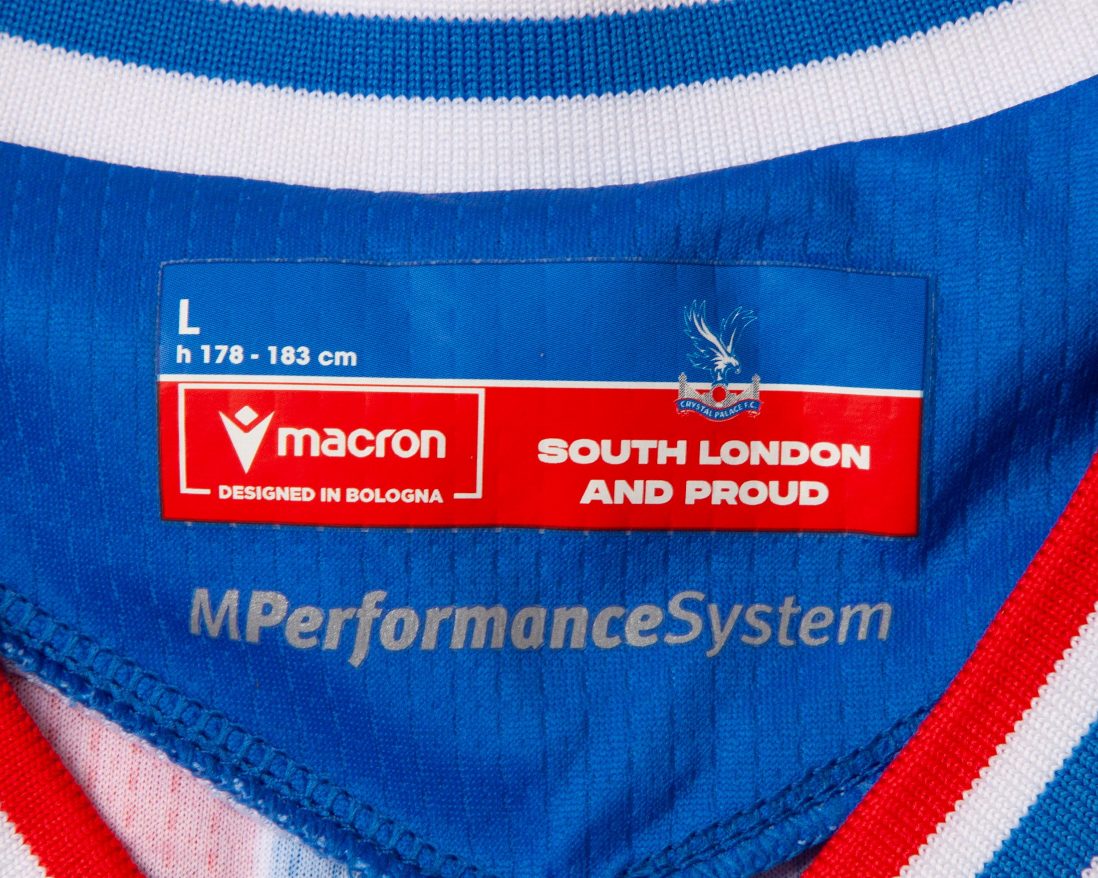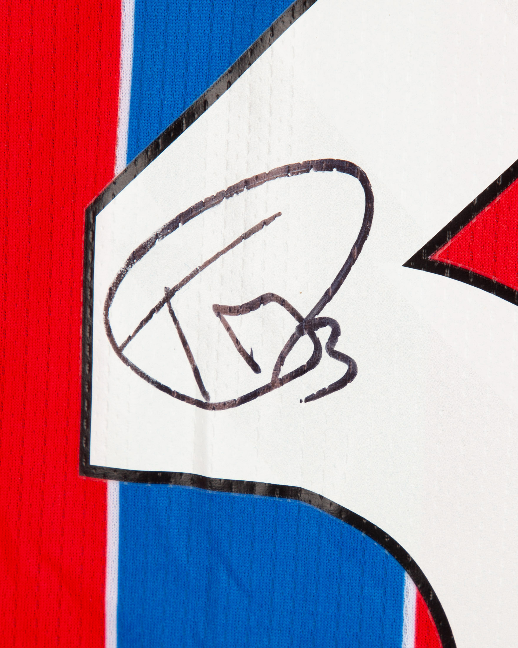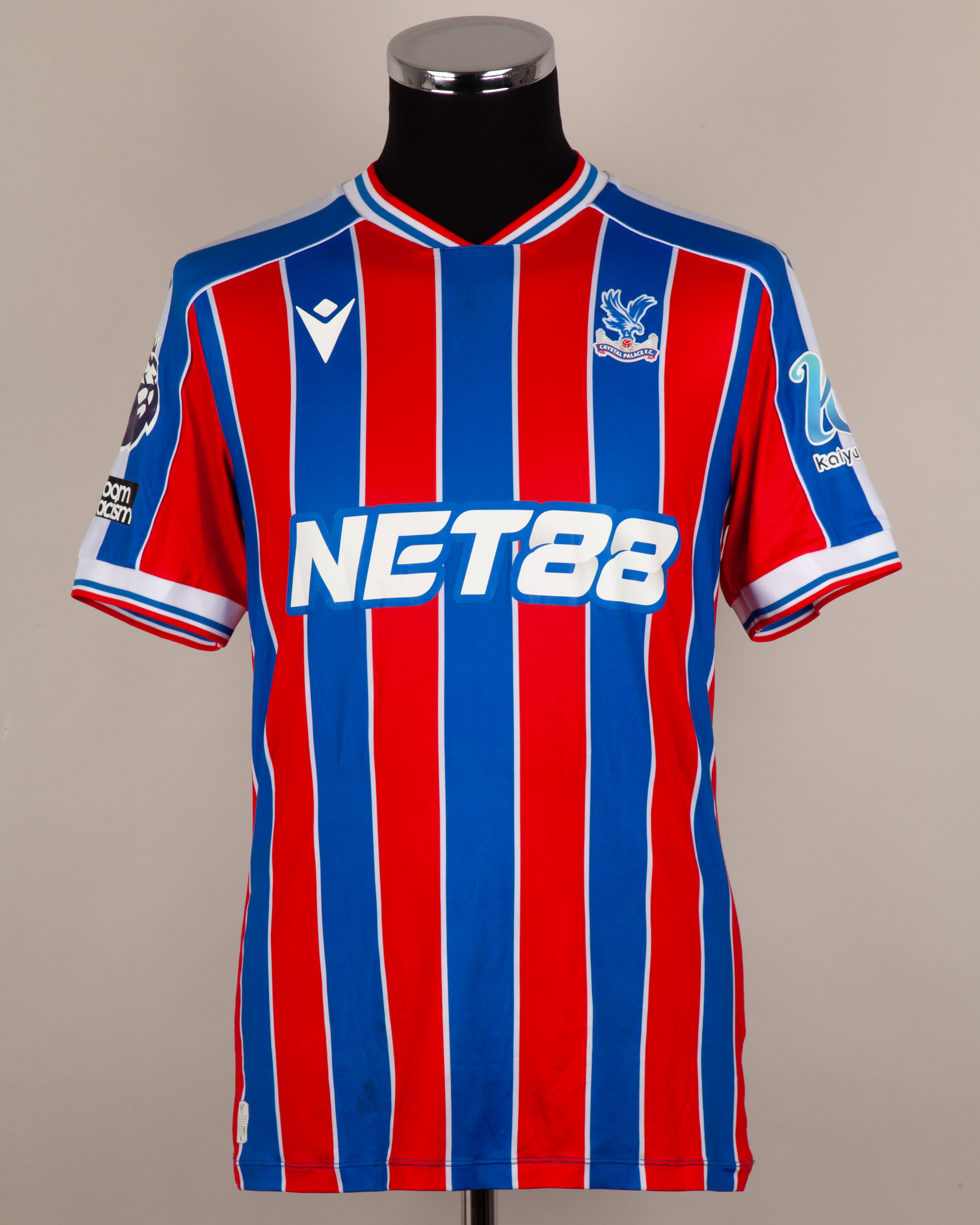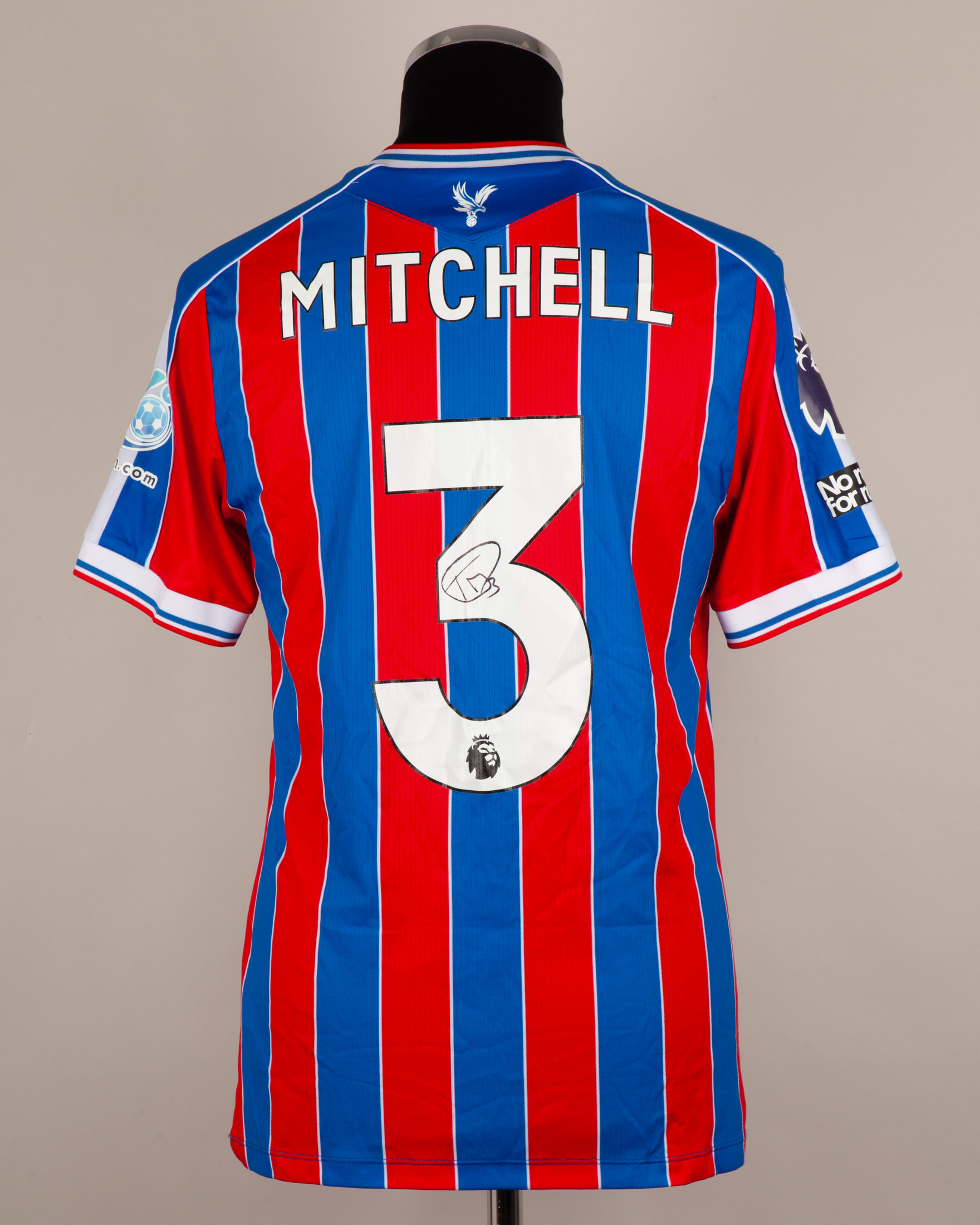 Tyrick Mitchell red and blue No.3 Crystal Palace v. Sunderland match worn shirt, Premier League 2025, Macron, with crew-neck collar and printed badge, the reverse lettered MITCHELL, the number autographed, the right sleeve with Premier League logo