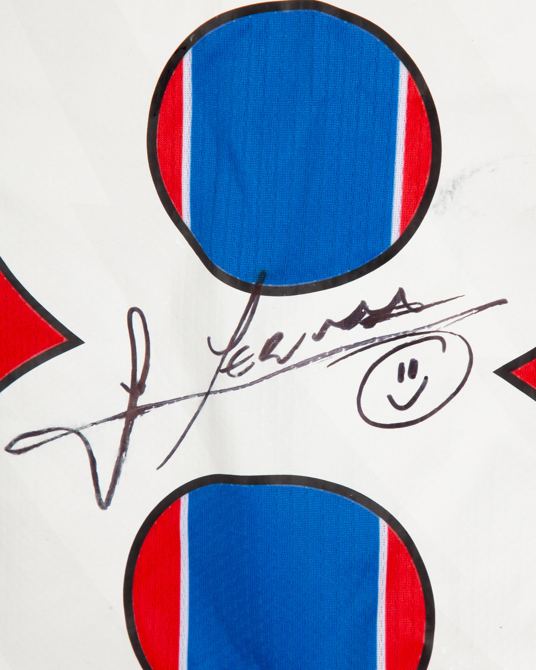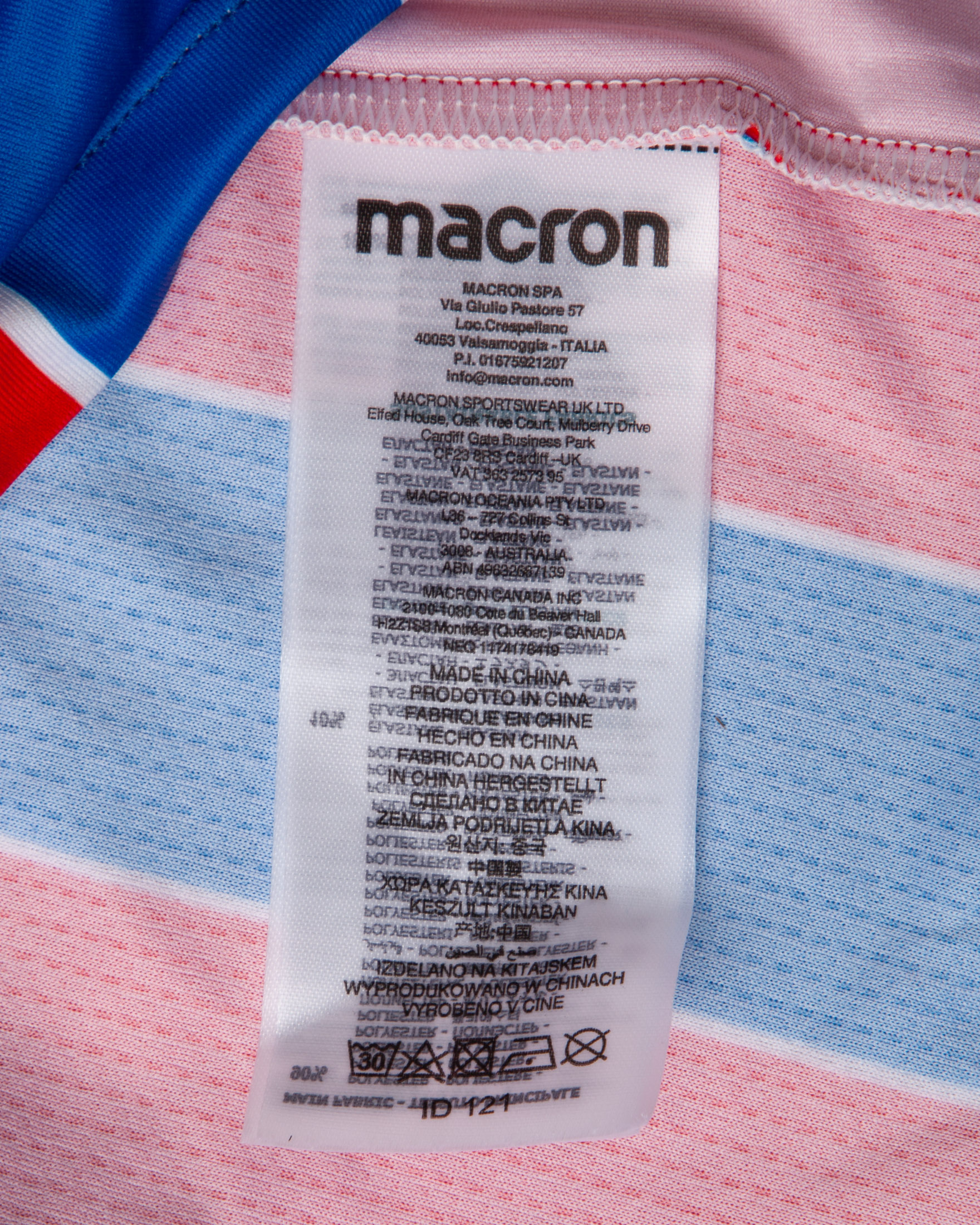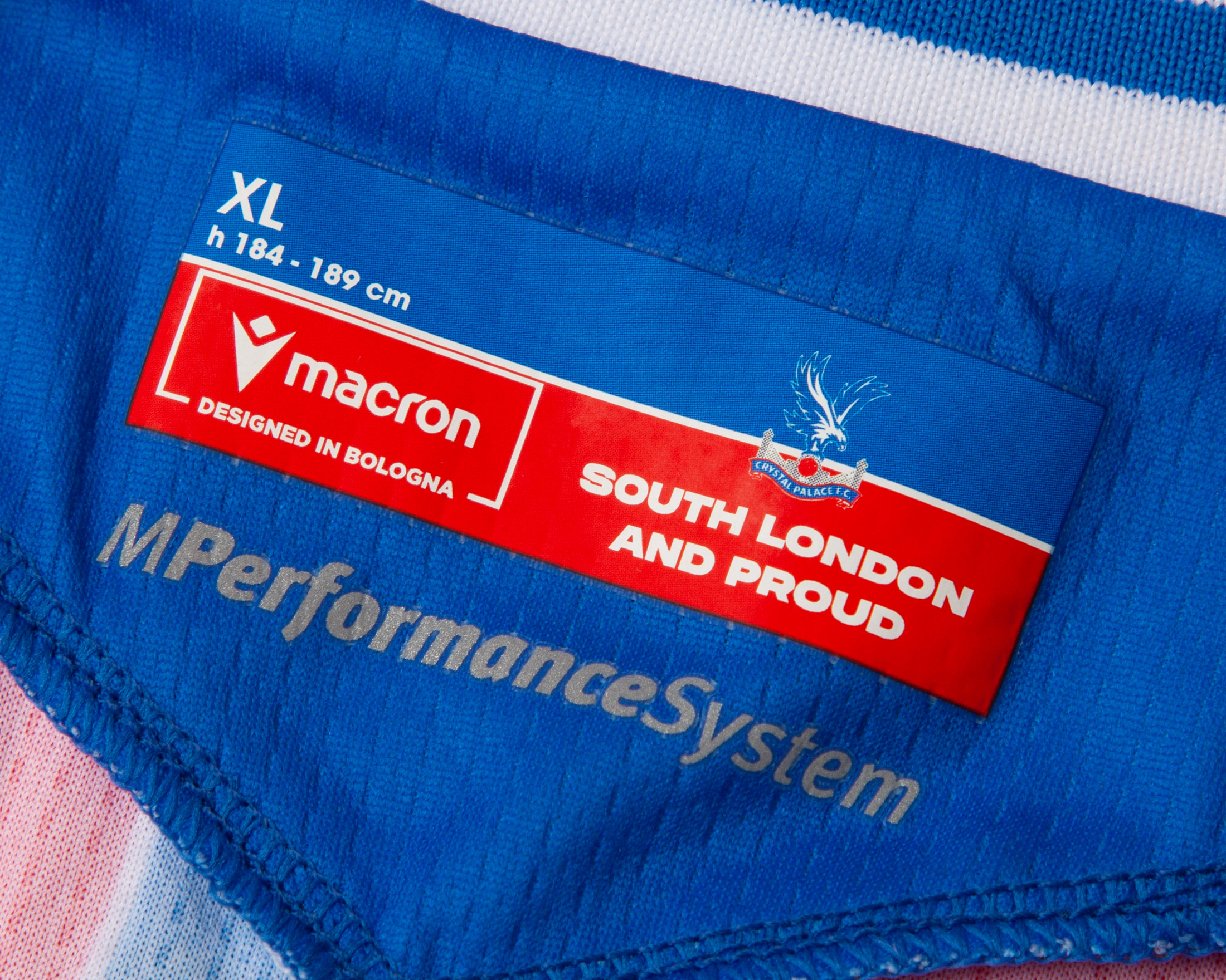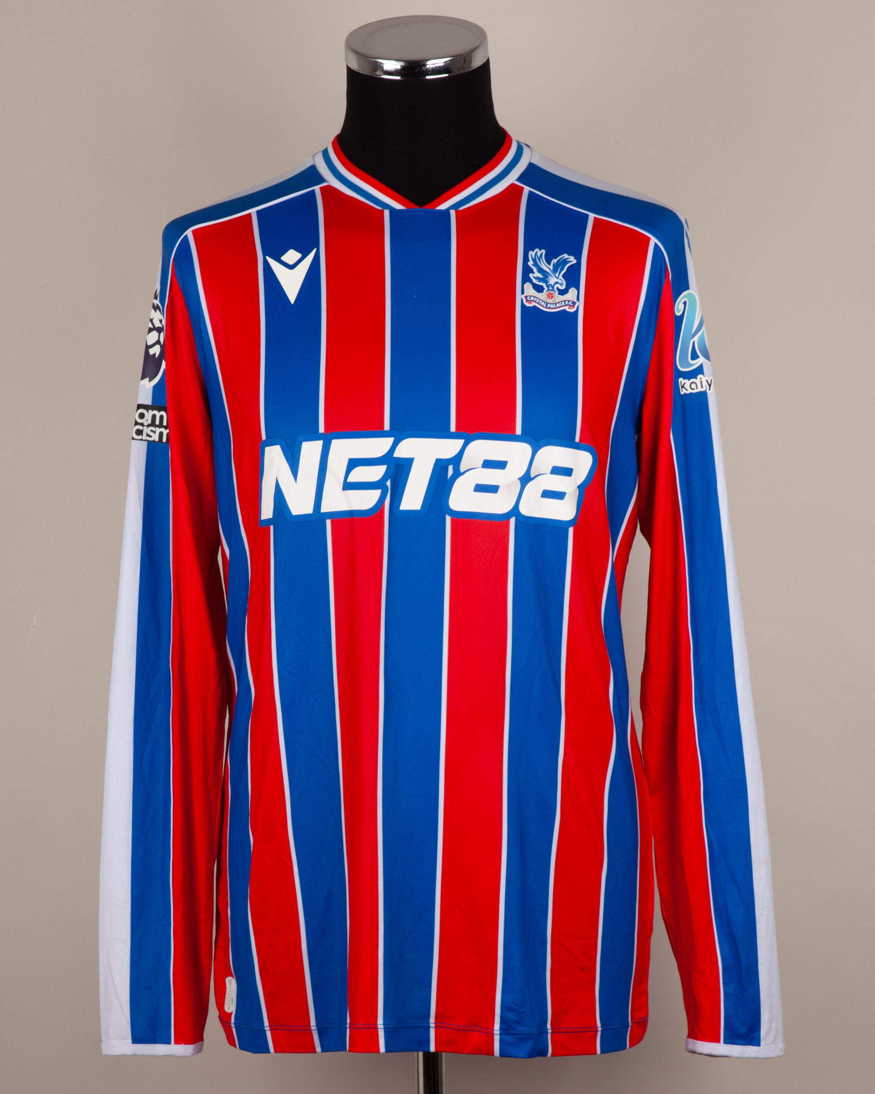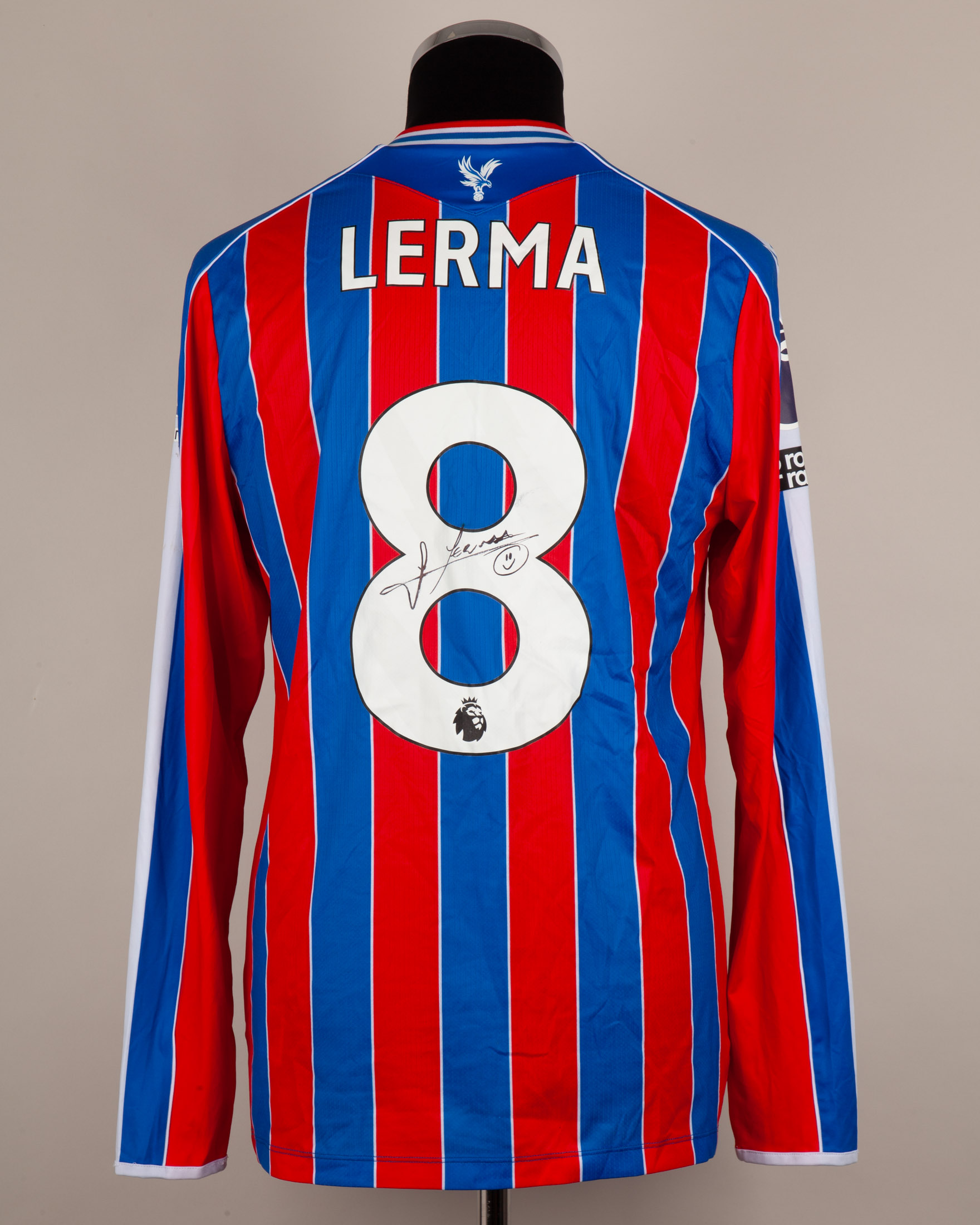 Jefferson Lerma red and blue No.8 Crystal Palace v. Sunderland match worn shirt, Premier League 2025, Macron, with crew-neck collar and printed badge, the reverse lettered LERMA, the number autographed, the right sleeve with Premier League logo