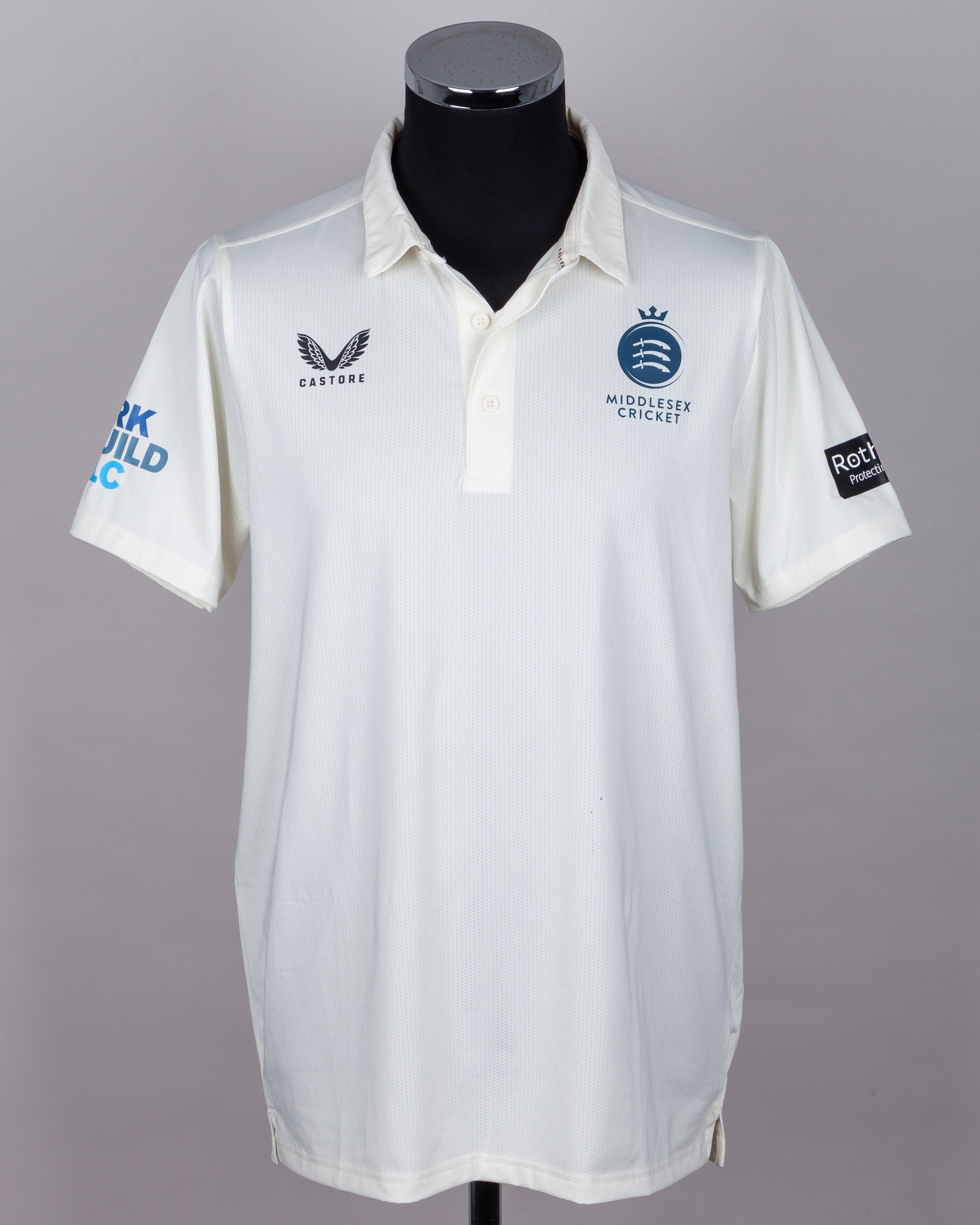 The shirt was worn for the fixture against Gloucestershire CCC at Lord's - The Home of Cricket, 24th September 2025, and was personally signed by the player. Scoring a well made half century but falling agonisingly short of a century to be stumped on 97. With Middlesex winning their final game of the season beating Gloucestershire by an innings and 67 runs