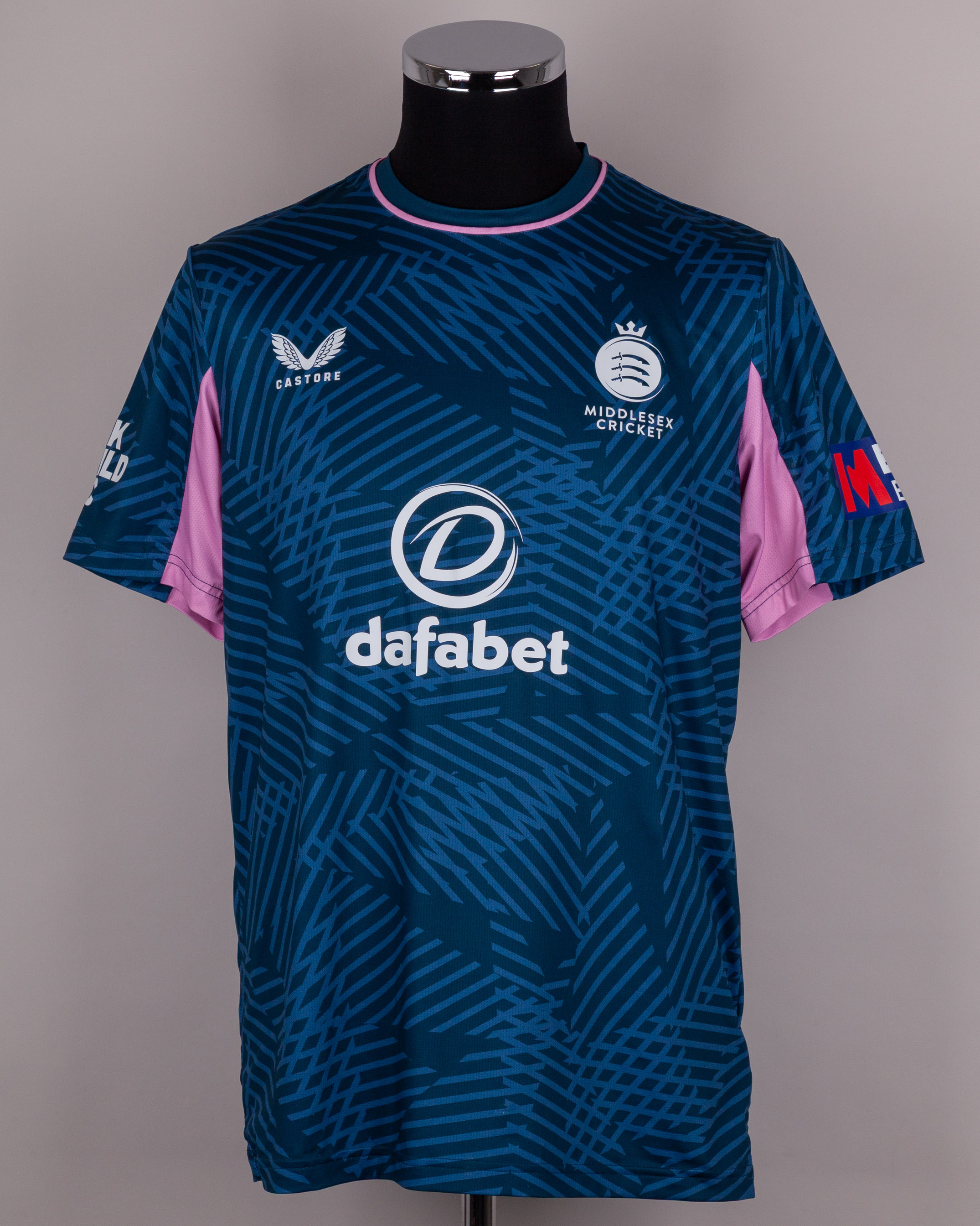 The shirt was worn for the fixture against Lancashire CCC at Old Trafford on 26th August 2025, and was personally signed by the player. This was a memorable game with Middlesex winning by one wicket with a ball to spare and therefore qualifying for the quarter finals.