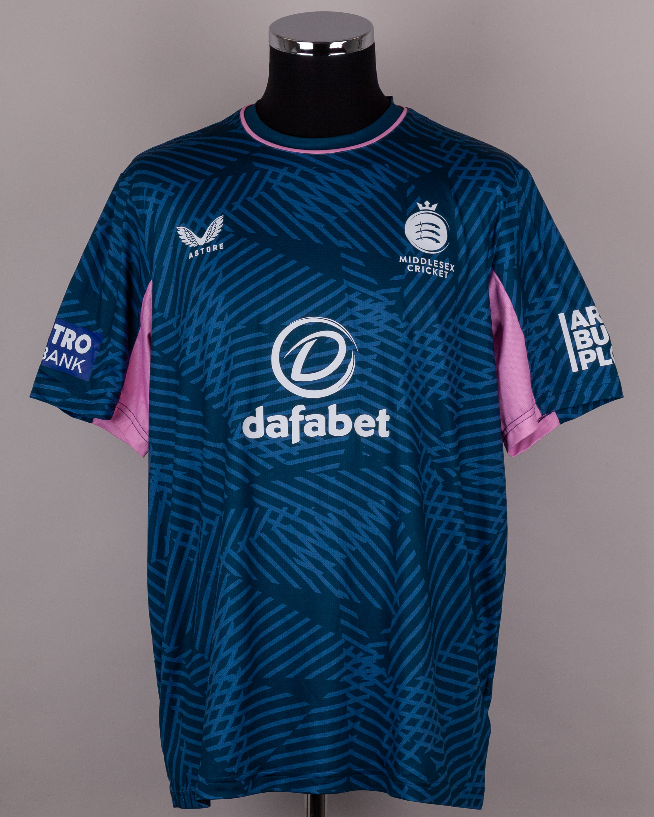 The shirt was worn for the fixture against Lancashire CCC at Old Trafford on 26th August 2025, and was personally signed by the player. This was a memorable game with Middlesex winning by one wicket with a ball to spare and therefore qualifying for the quarter finals.