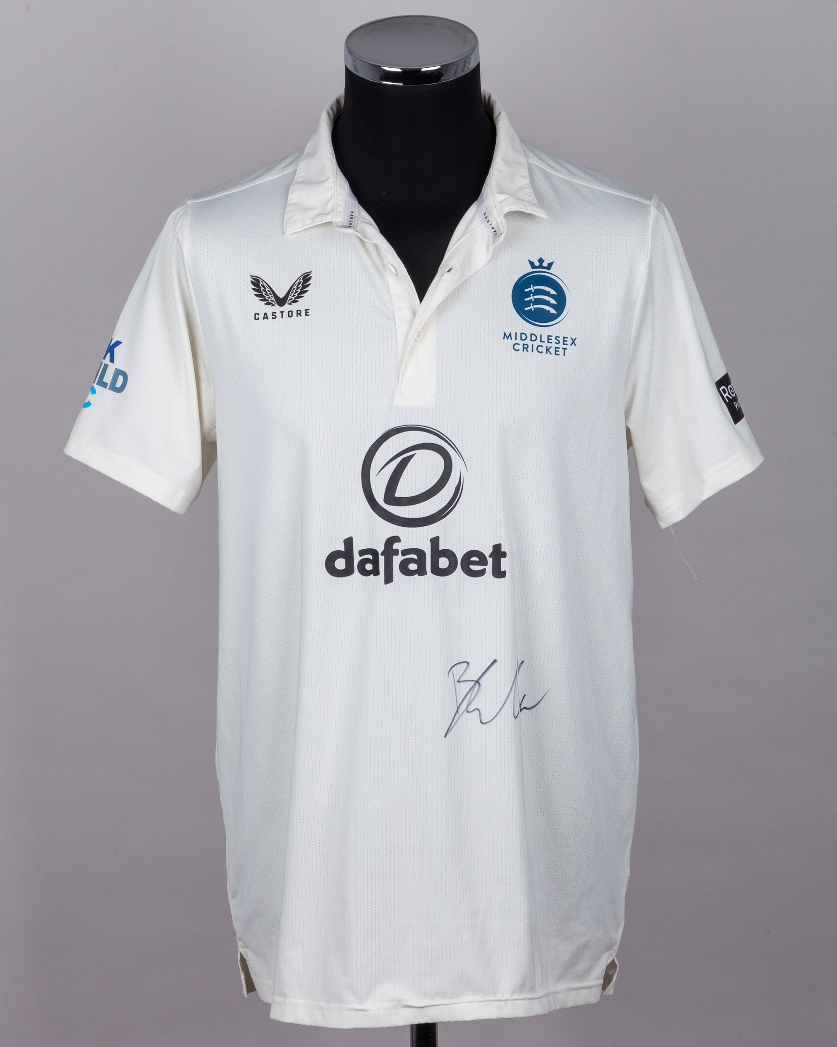 The shirt was worn for the fixture against Gloucestershire CCC at Lord's - The Home of Cricket, 24th September 2025, and was personally signed by the player. Scoring a well made half century in the 1st innings. With Middlesex winning their final game of the season beating Gloucestershire by an innings and 67 runs