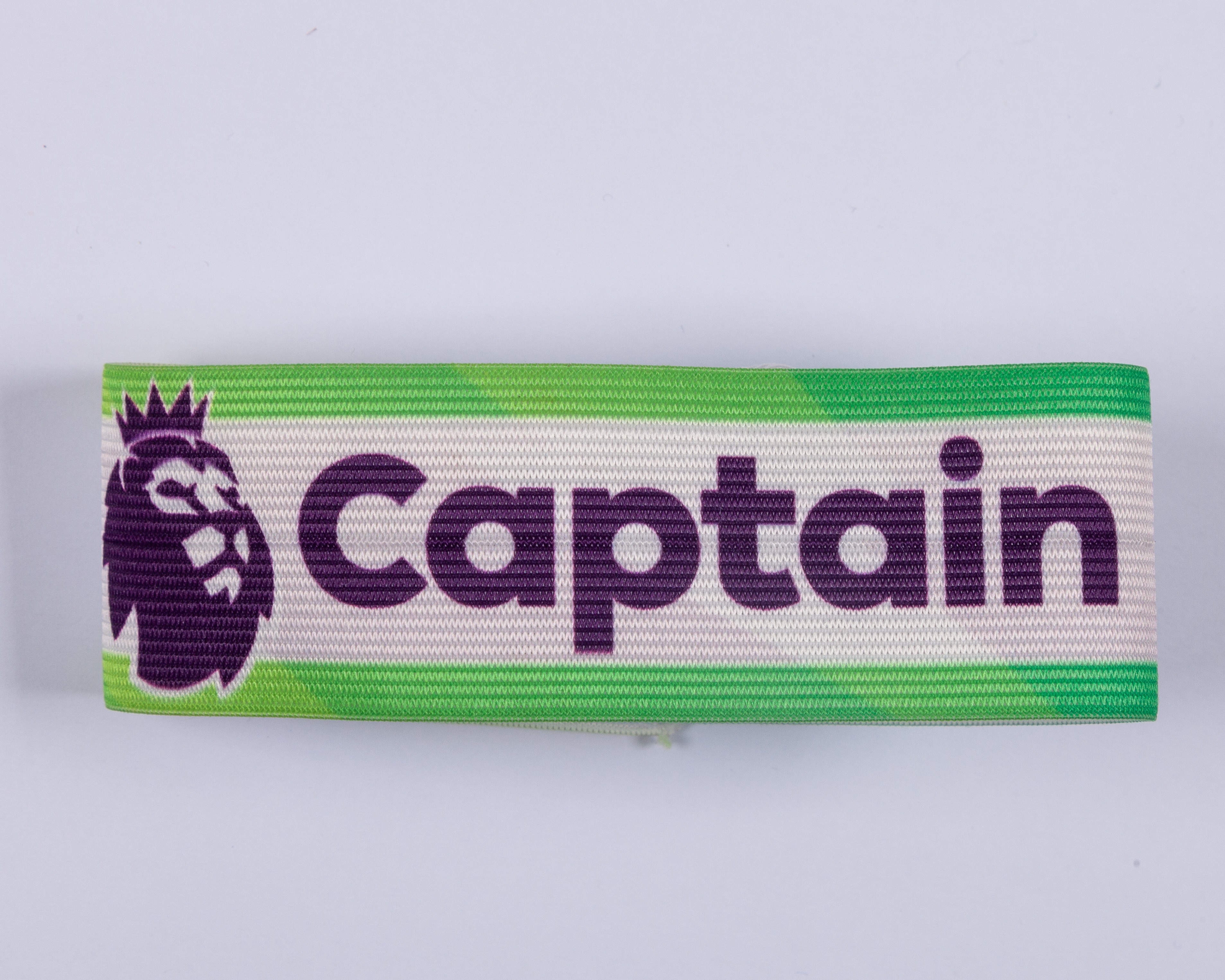 Marc Guéhi match worn captain's armband Crystal Palace v. Liverpool, Premier League 2025, white and green with CAPTAIN in purple and Premier League Logo