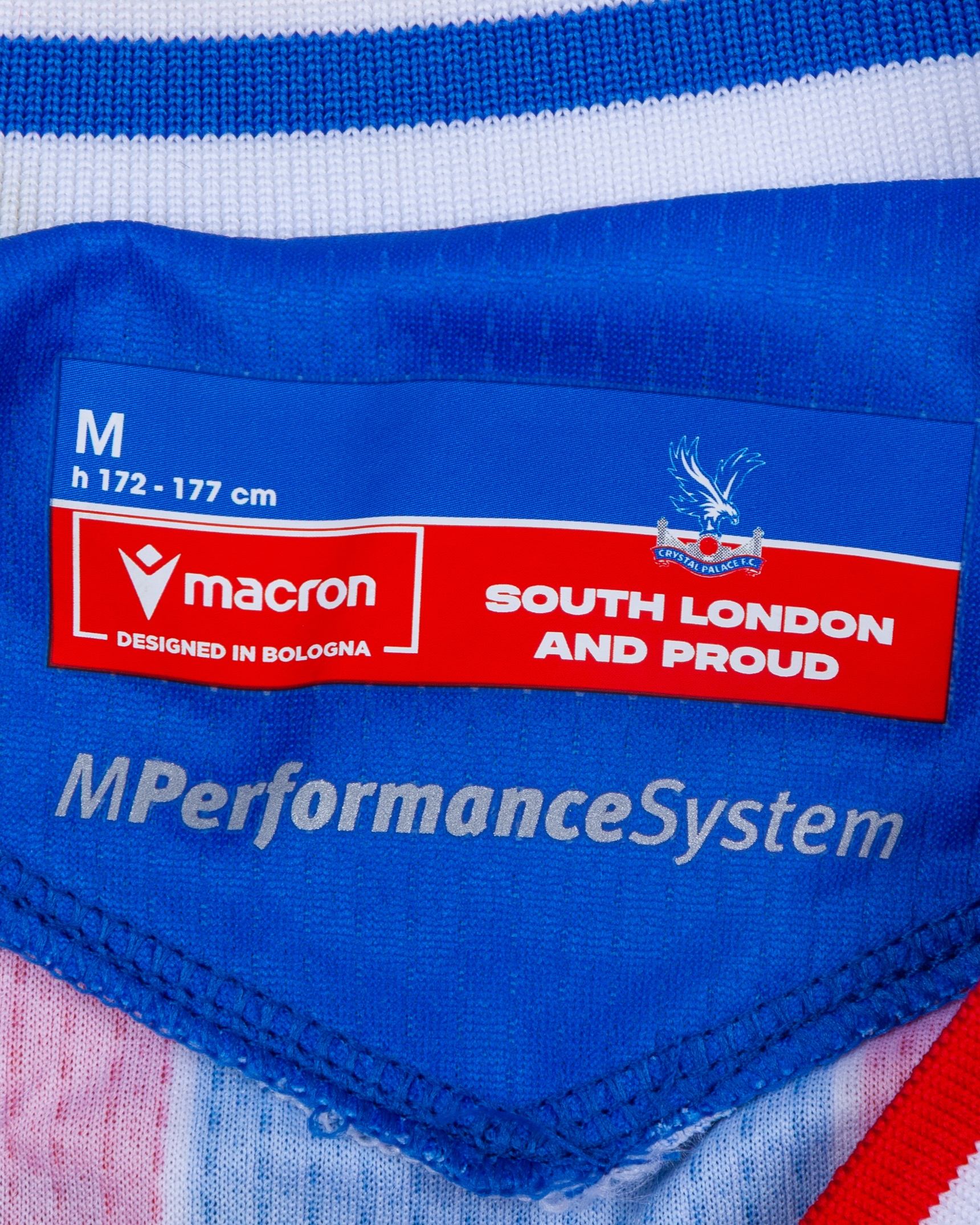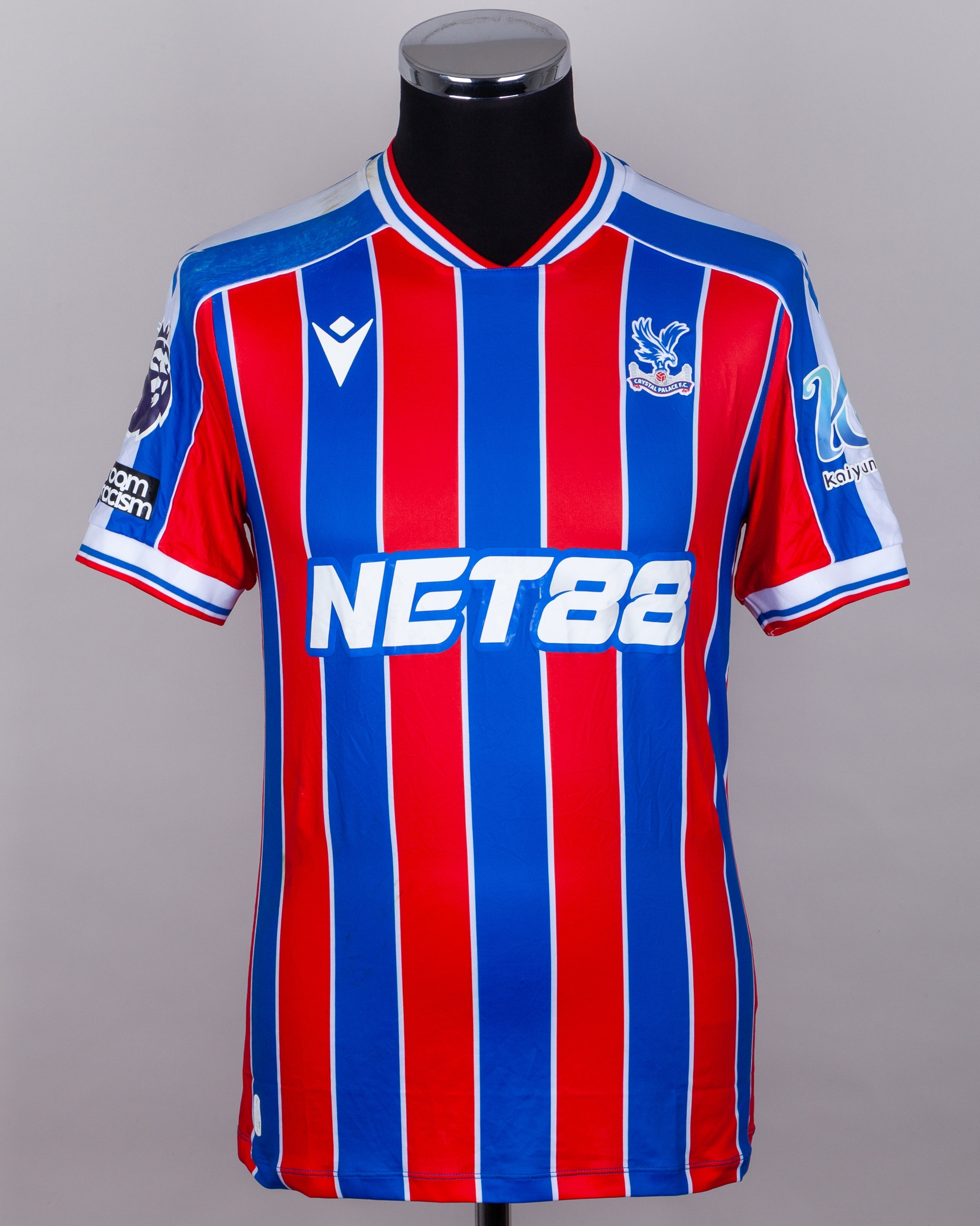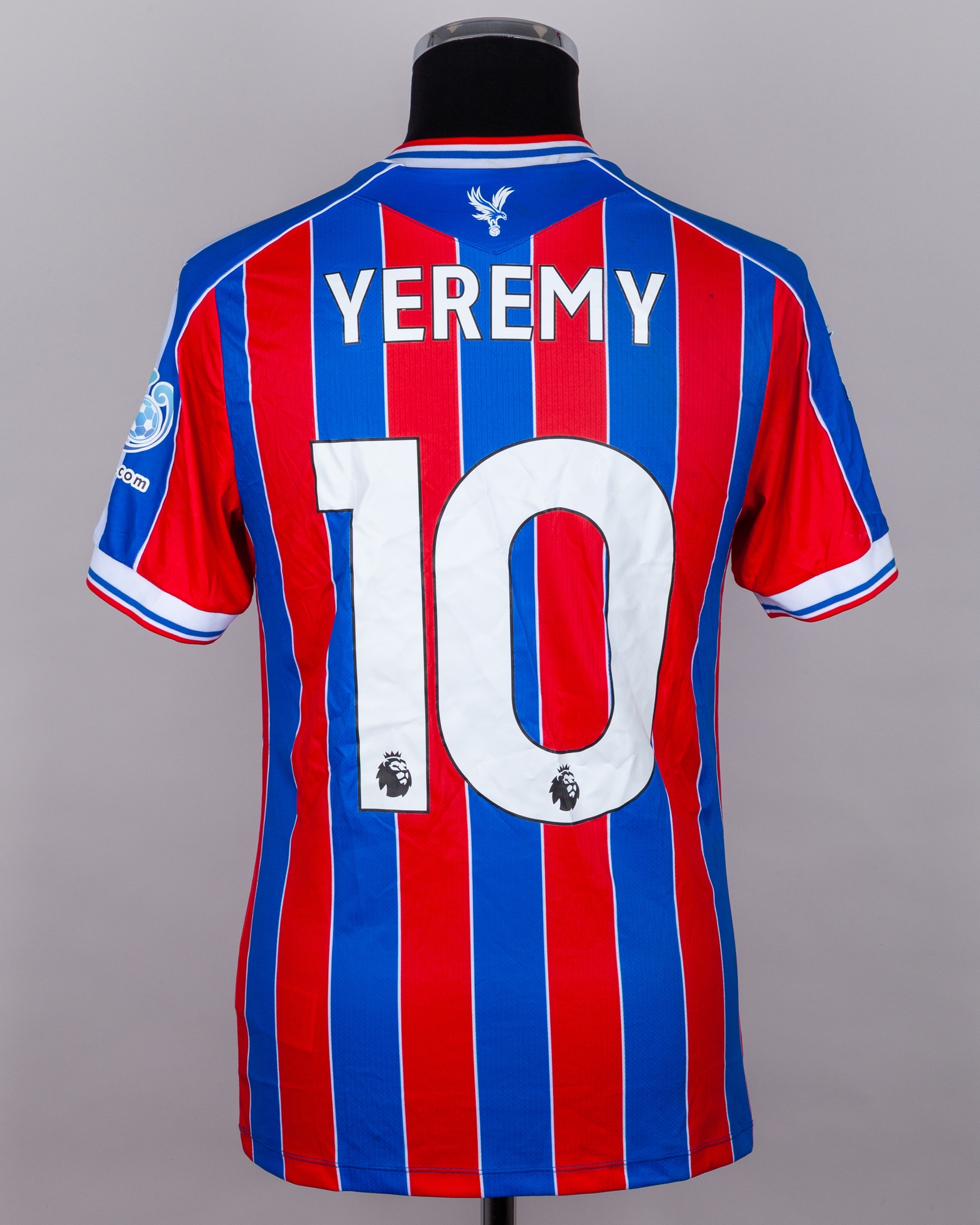 Yeremy Pino red and blue No.10 Crystal Palace v. Liverpool match worn shirt, Premier League 2025, Macron, with crew-neck collar and printed badge, the reverse lettered YEREMY, the right sleeve with Premier League logo