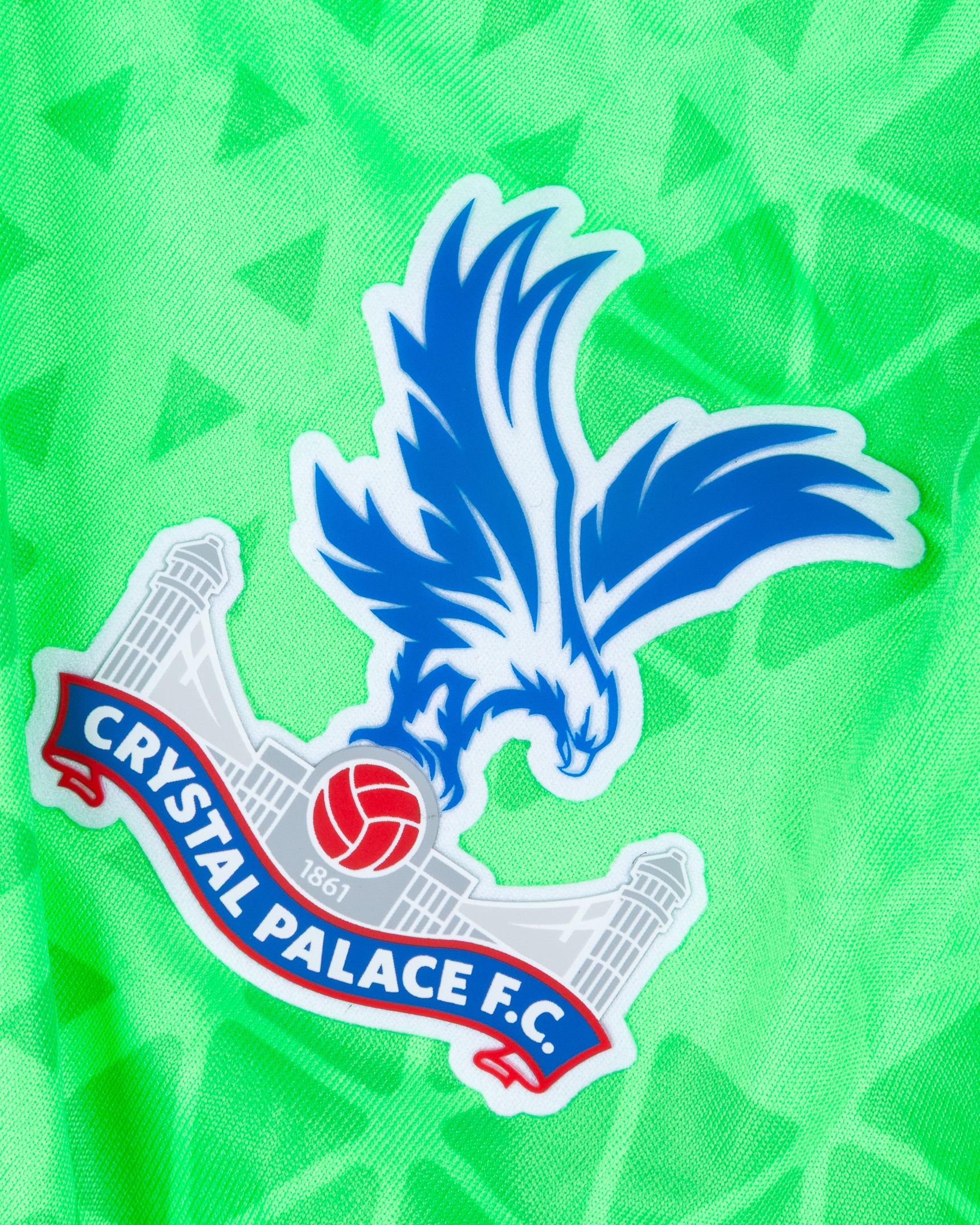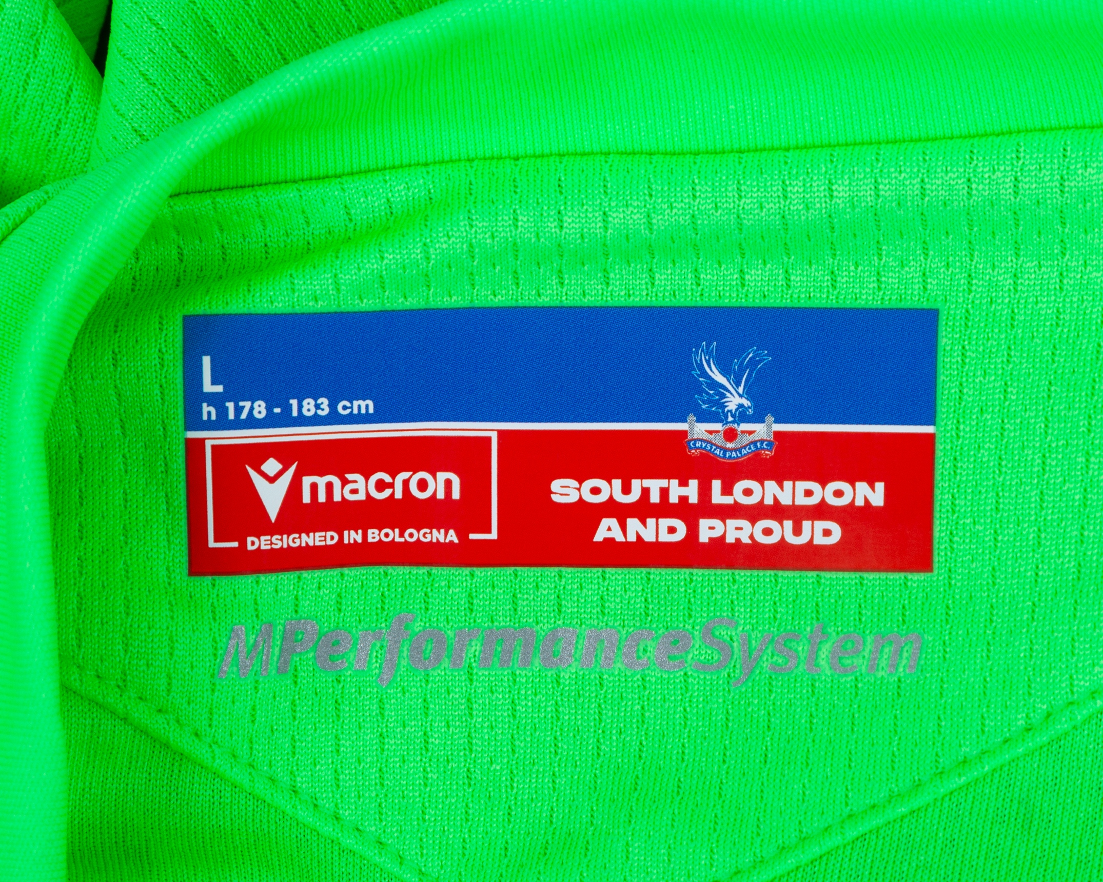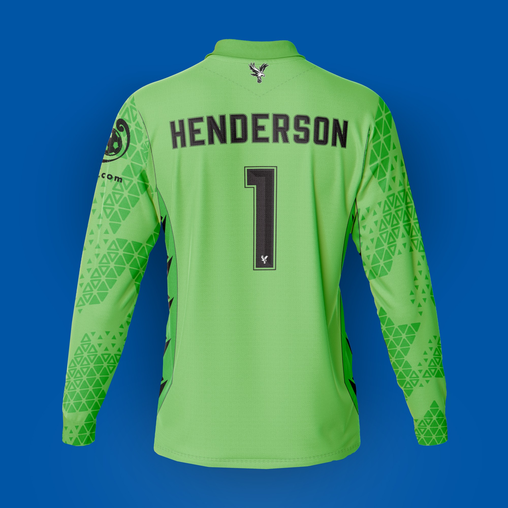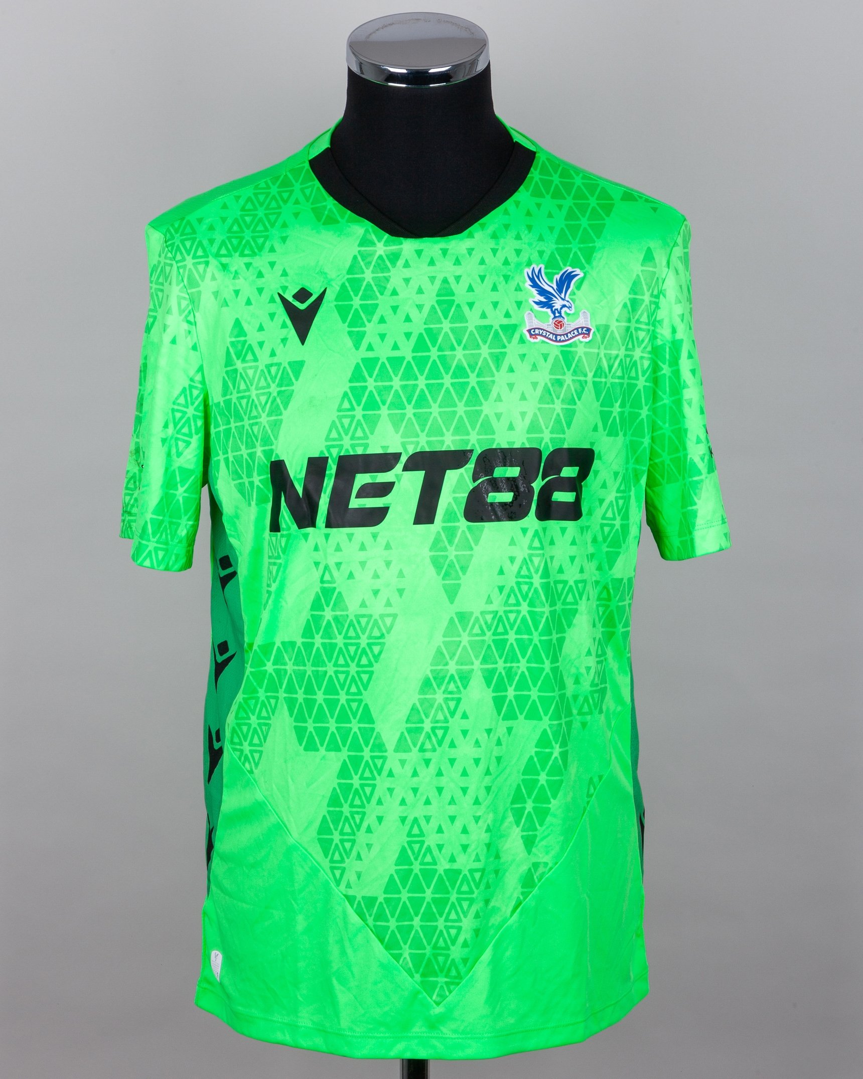 Dean Henderson green No.1 Crystal Palace v. Liverpool match worn shirt, Premier League 2025, Macron, with crew-neck collar and printed badge, the reverse lettered HENDERSON, the right sleeve with Premier League logo