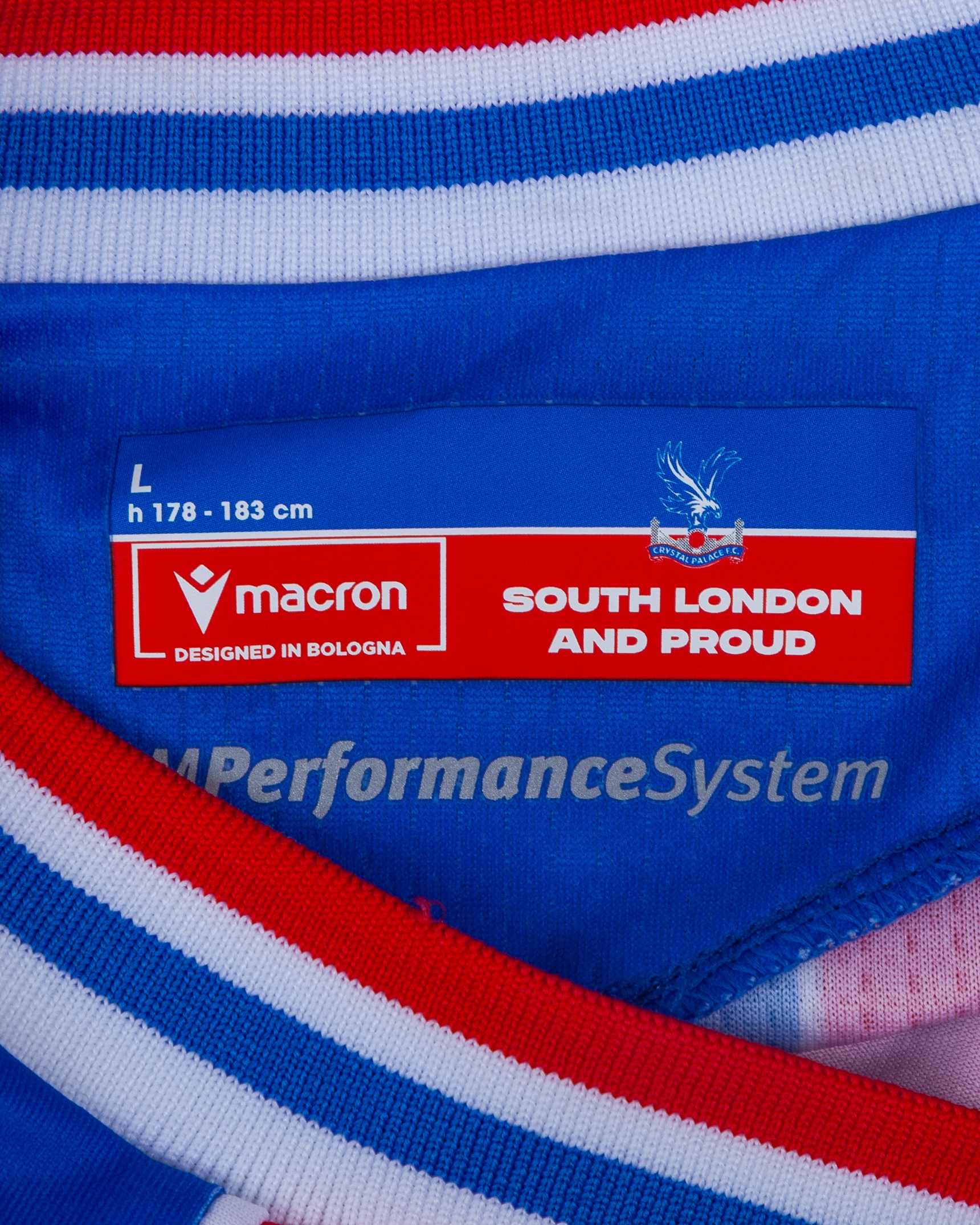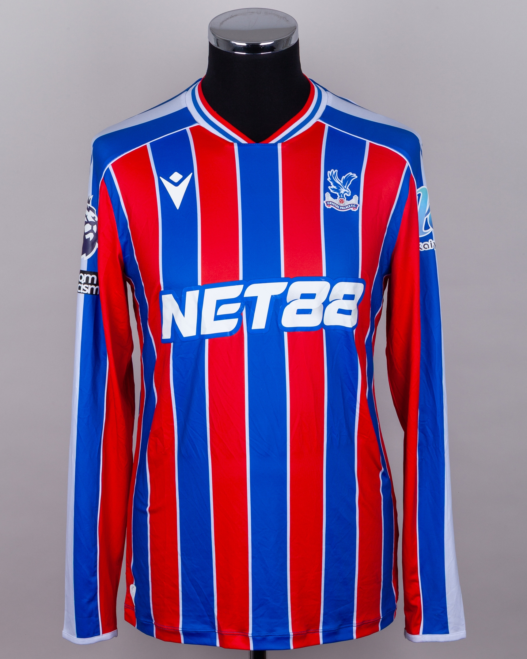 Daichi Kamada red and blue No.18 Crystal Palace v. Liverpool match worn shirt, Premier League 2025, Macron, with crew-neck collar and printed badge, the reverse lettered KAMADA, the right sleeve with Premier League logo