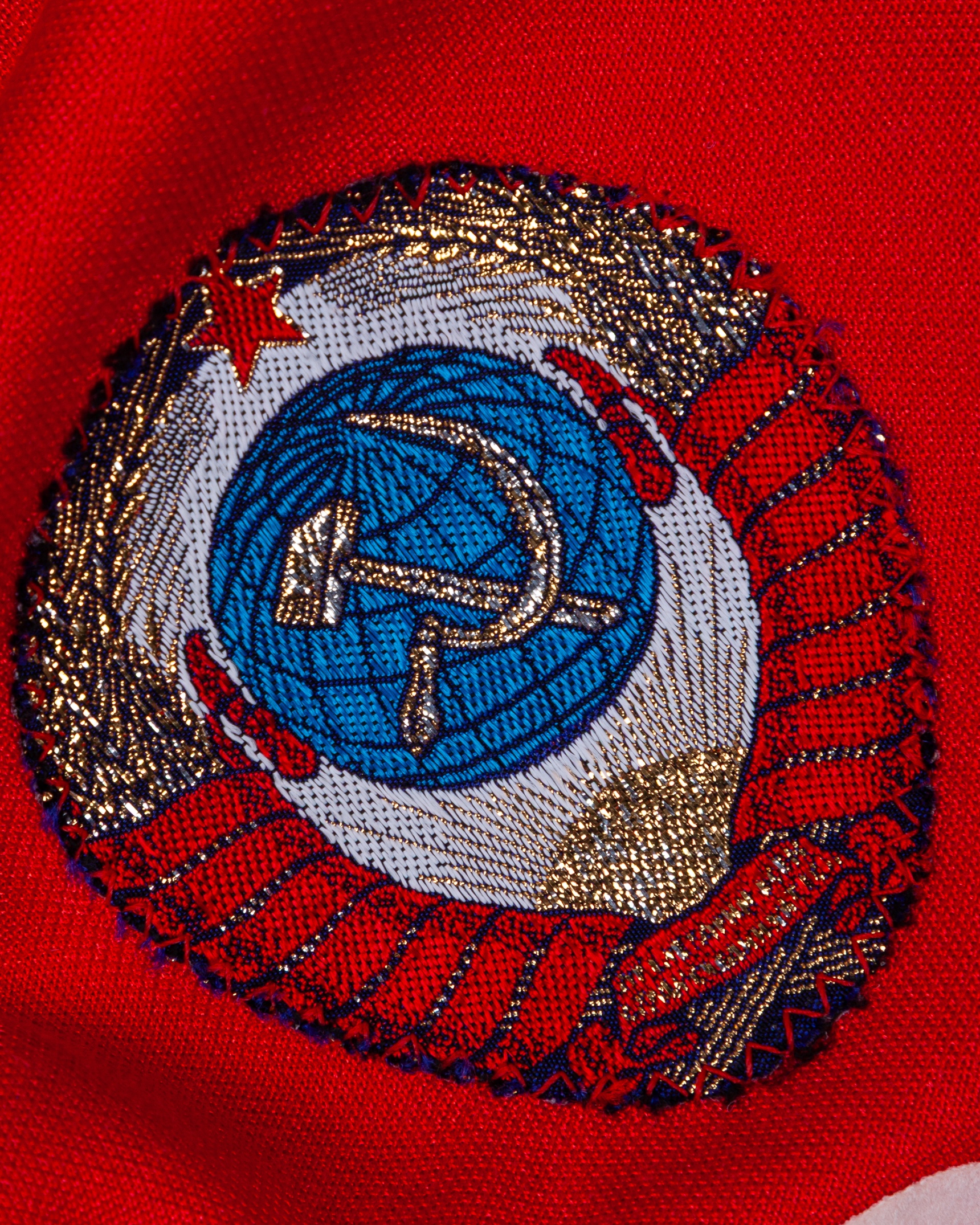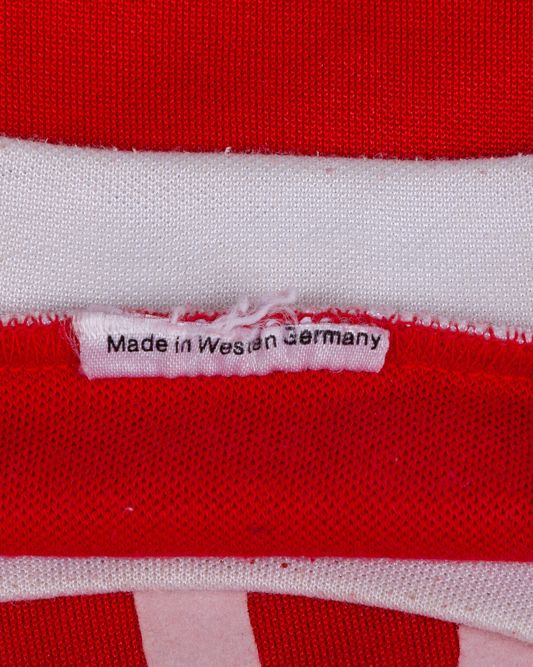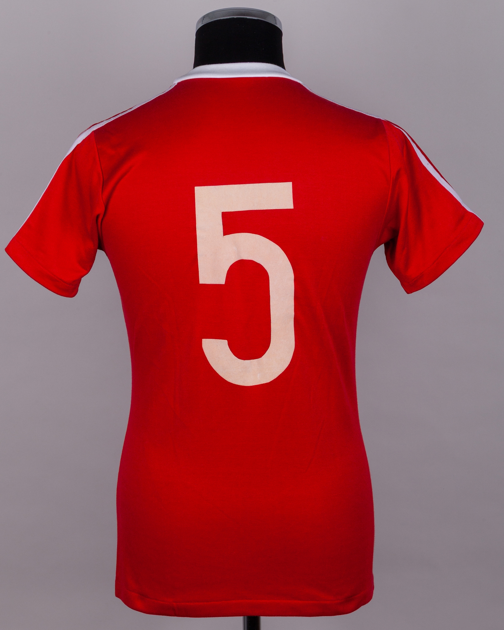 Sergei Baltacha red and white No. 5 USSR v. Austria short-sleeved shirt, 1983, Adidas, with crew-neck collar and embroidered badge
