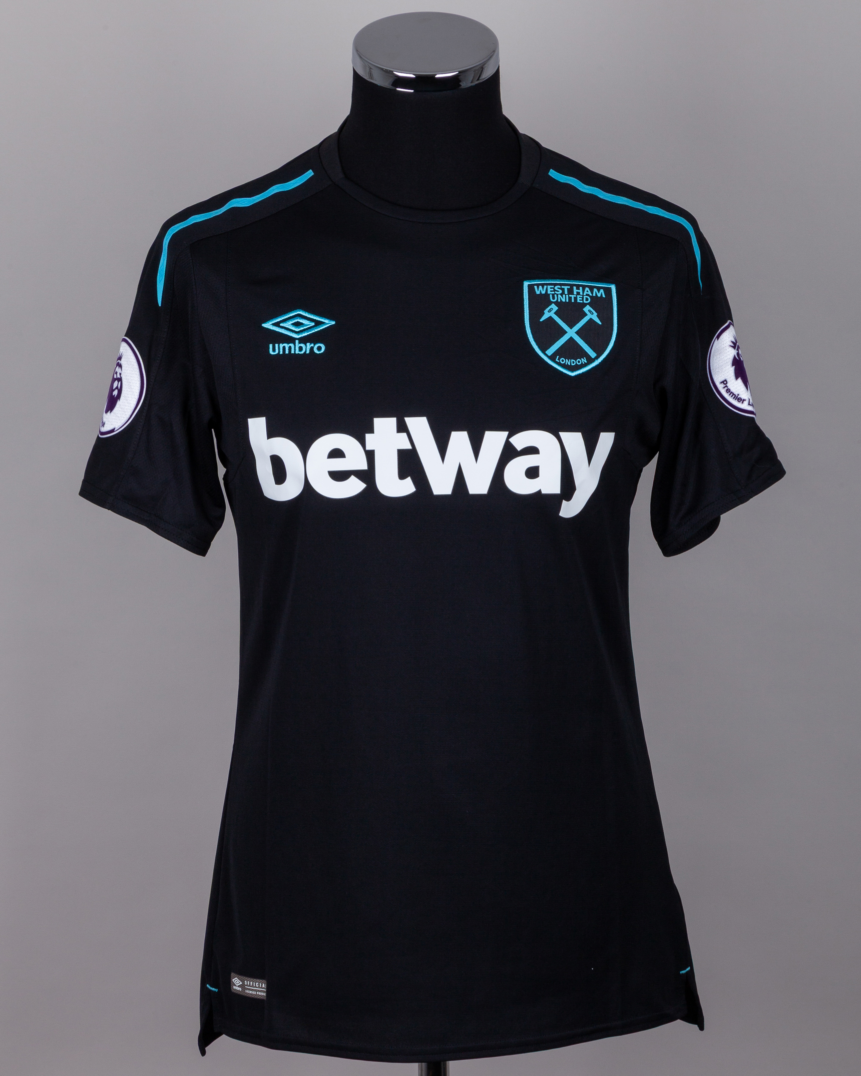 Chicharito black No.17 West Ham United v. Manchester United match worn short-sleeved shirt, 2017, Umbro, M, with crew-neck collar and embroidered cloth badge inscribed WEST HAM UNITED LONDON, the reverse lettered CHICHARITO, the sleeves with Premier League flashes