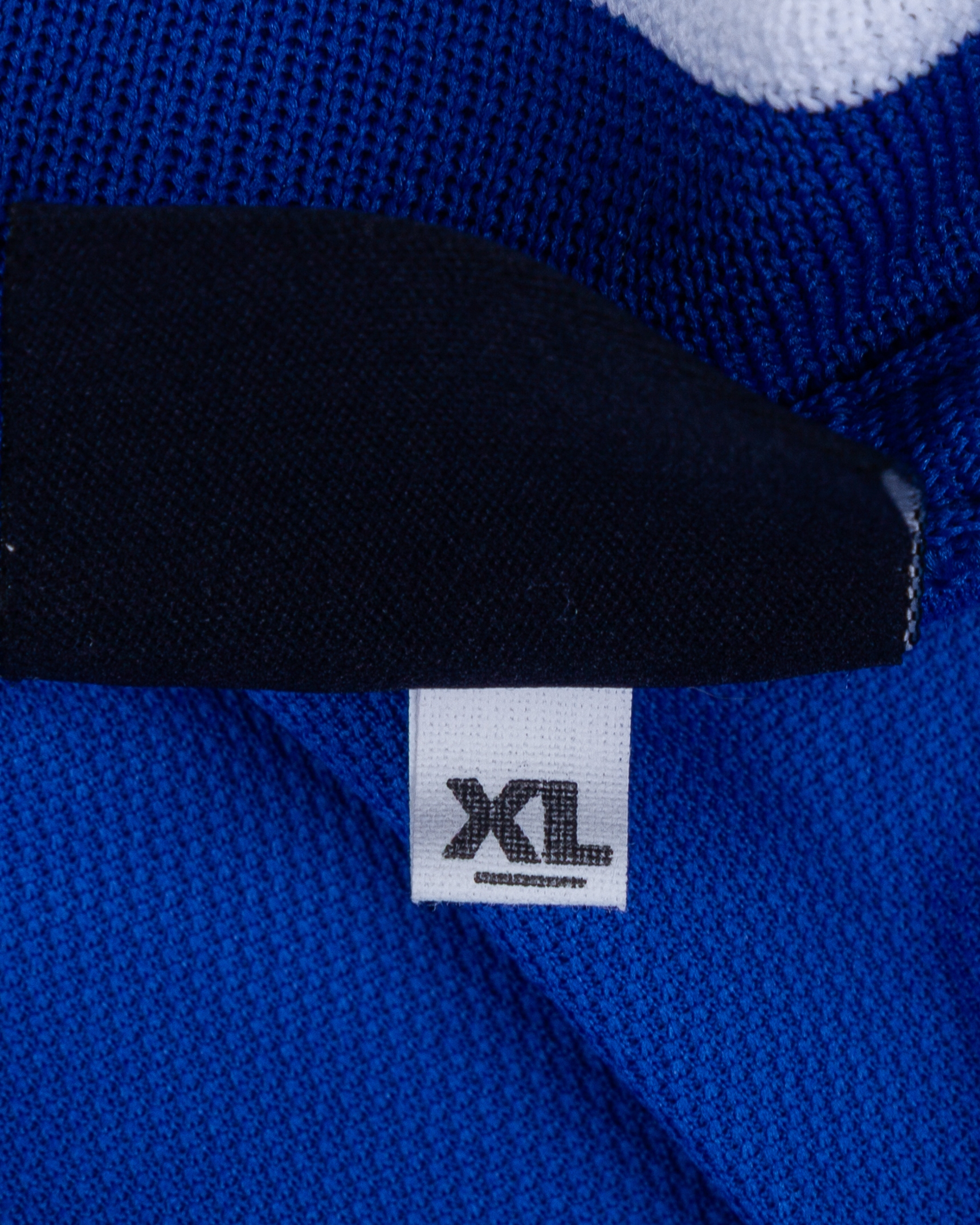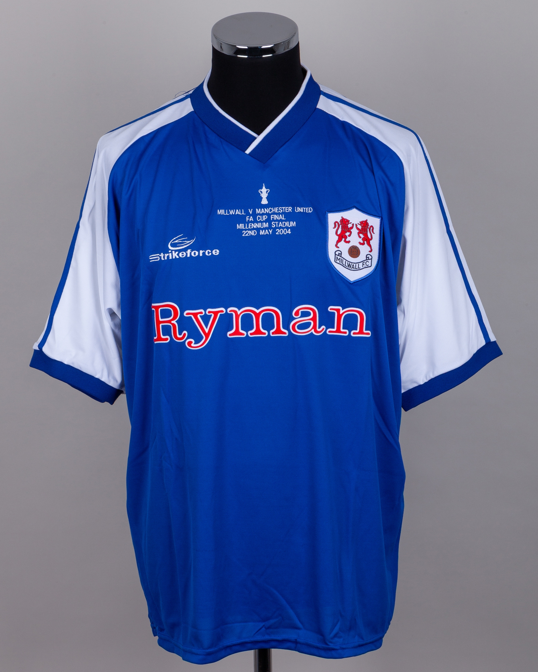 Blue and white Millwall v. Manchester United F.A.Cup Final short-sleeved shirt, 2004, Strikeforce, XL, with v-neck collar and embroidered cloth badge inscribed MILLWALL F.C MILLWALL V MANCHESTER UNITED FA CUP FINAL MILLENNIUM STADIUM 22ND MAY 2004, unnumbered