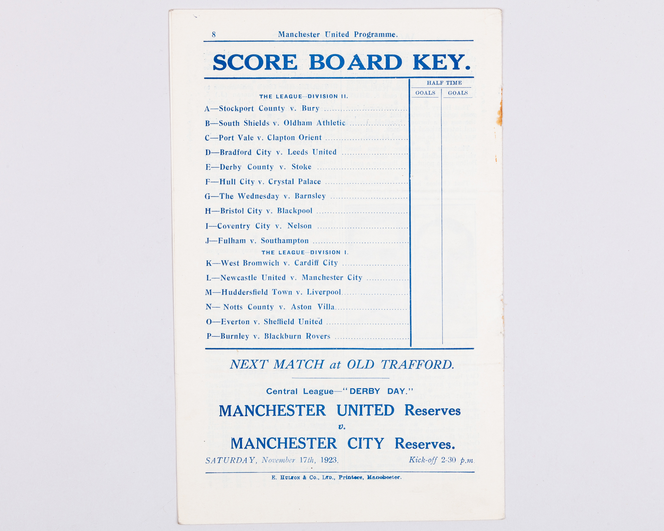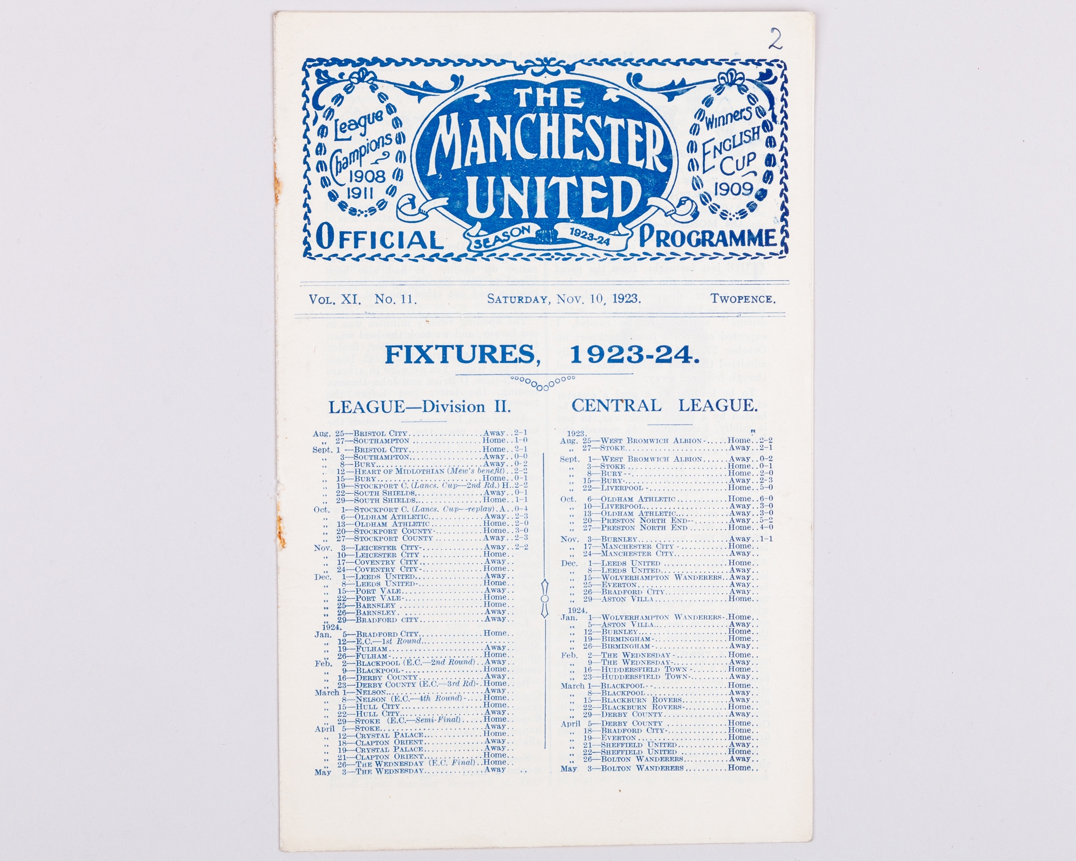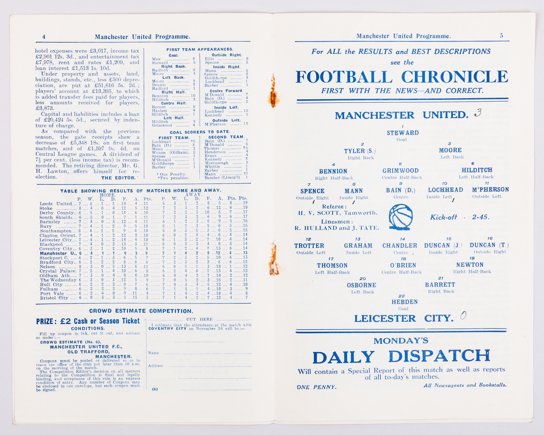 Manchester United v. Leicester City match programme, 10th November 1923, lacking staples, scores on team page