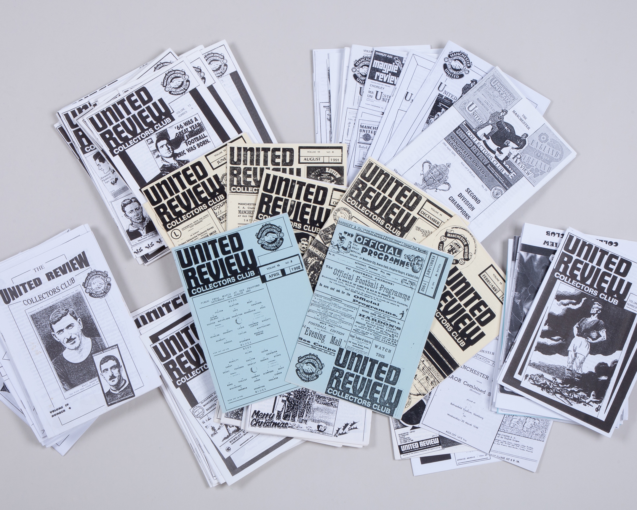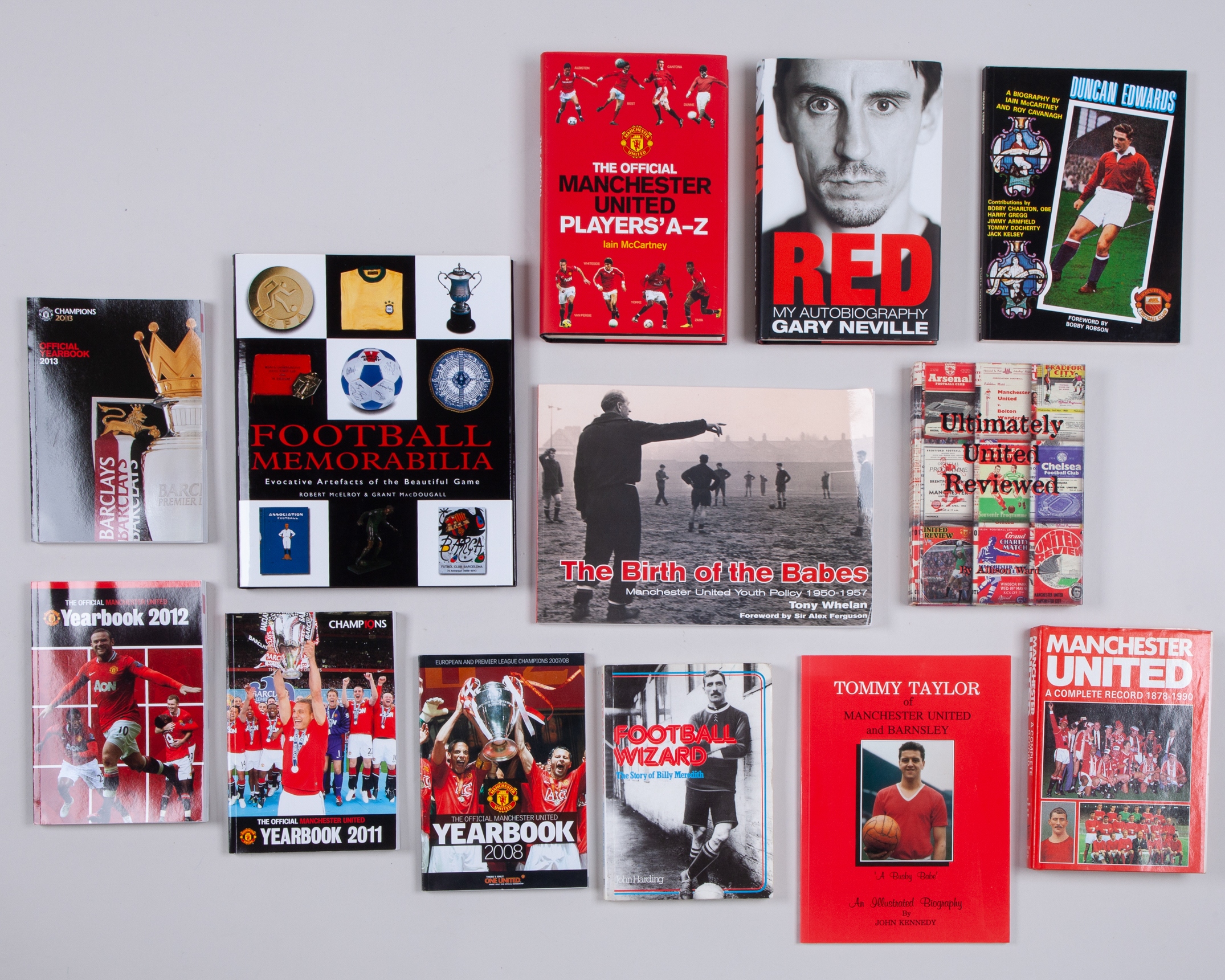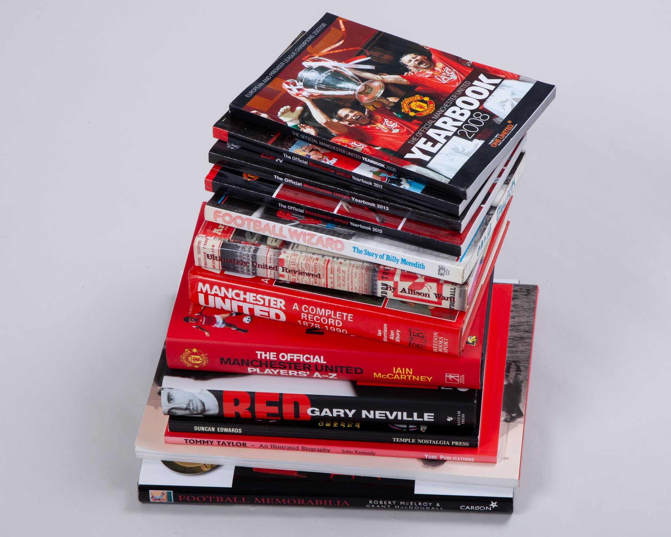 A collection of Manchester United Review Collectors Club booklets, February 1992, Vol 11 to 25 and a collection of Manchester United reference books including Football Wizard, Billy Meredith, Red by Gary Neville, The Official Manchester United A to Z etc.