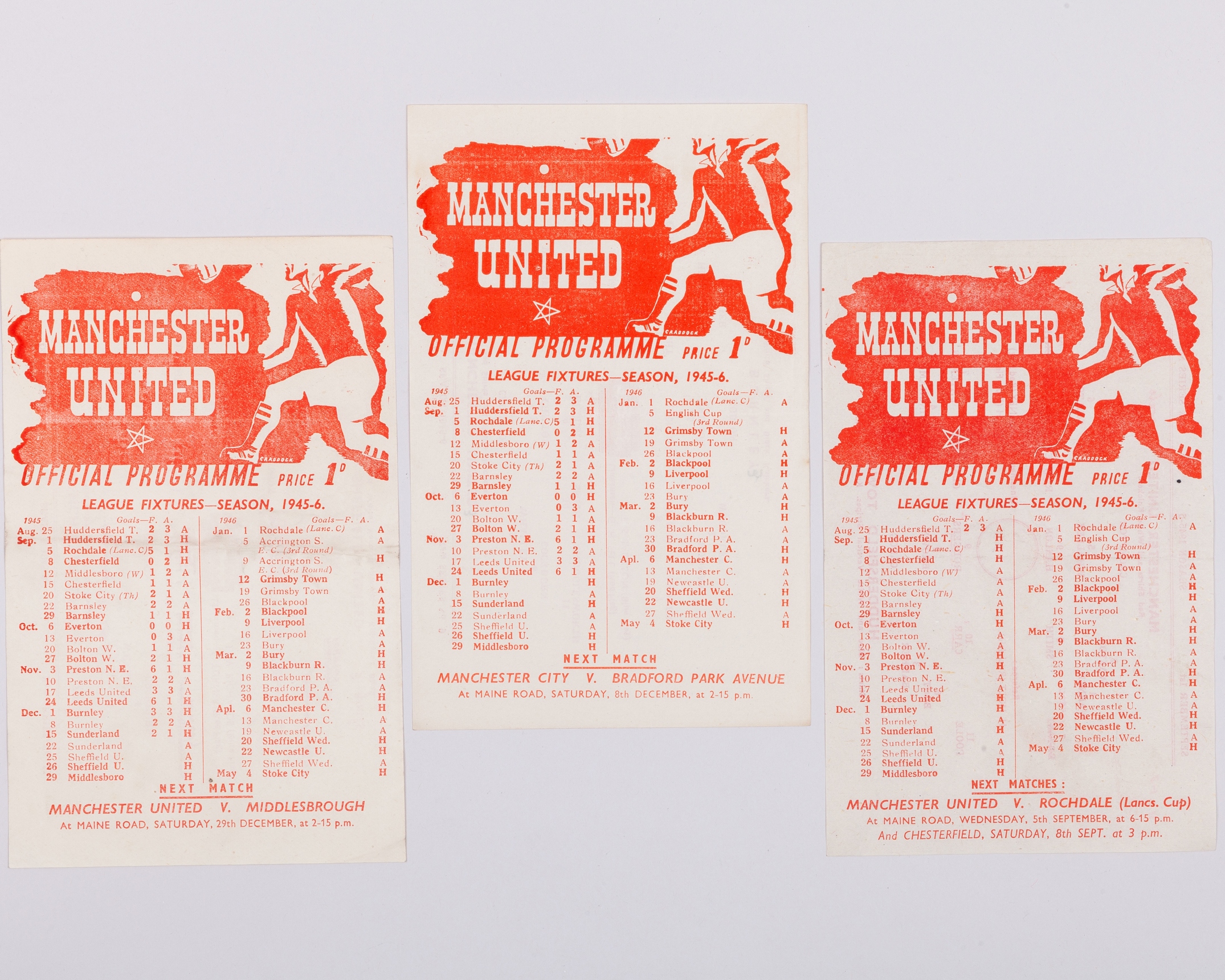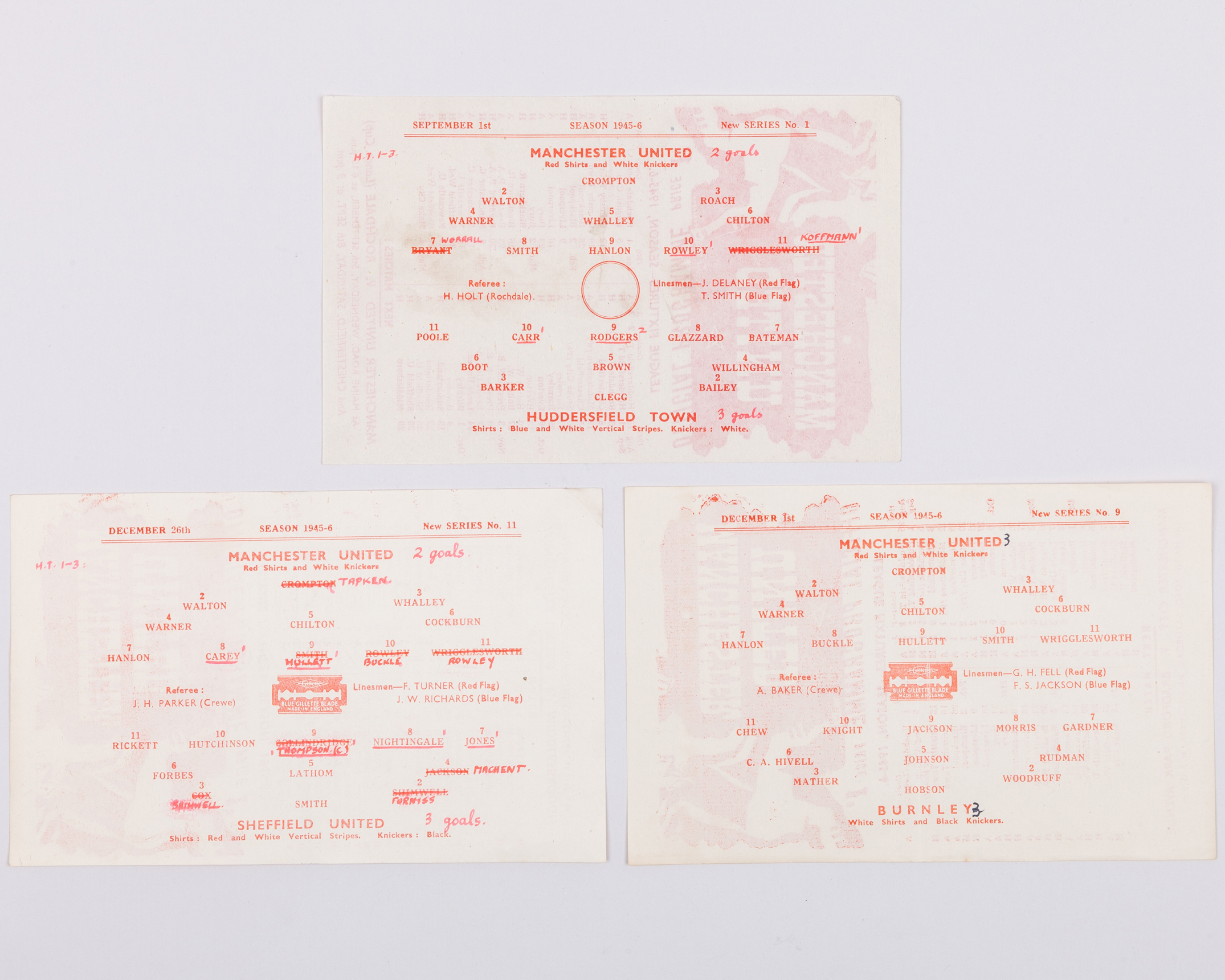 Three Manchester United single-sheet match programmes, 1945, comprising Huddersfield Town, 1st September 1945, Burnley 1st December 1945 and Sheffield United, 26th December 1945, text on team pages, folds (3)
