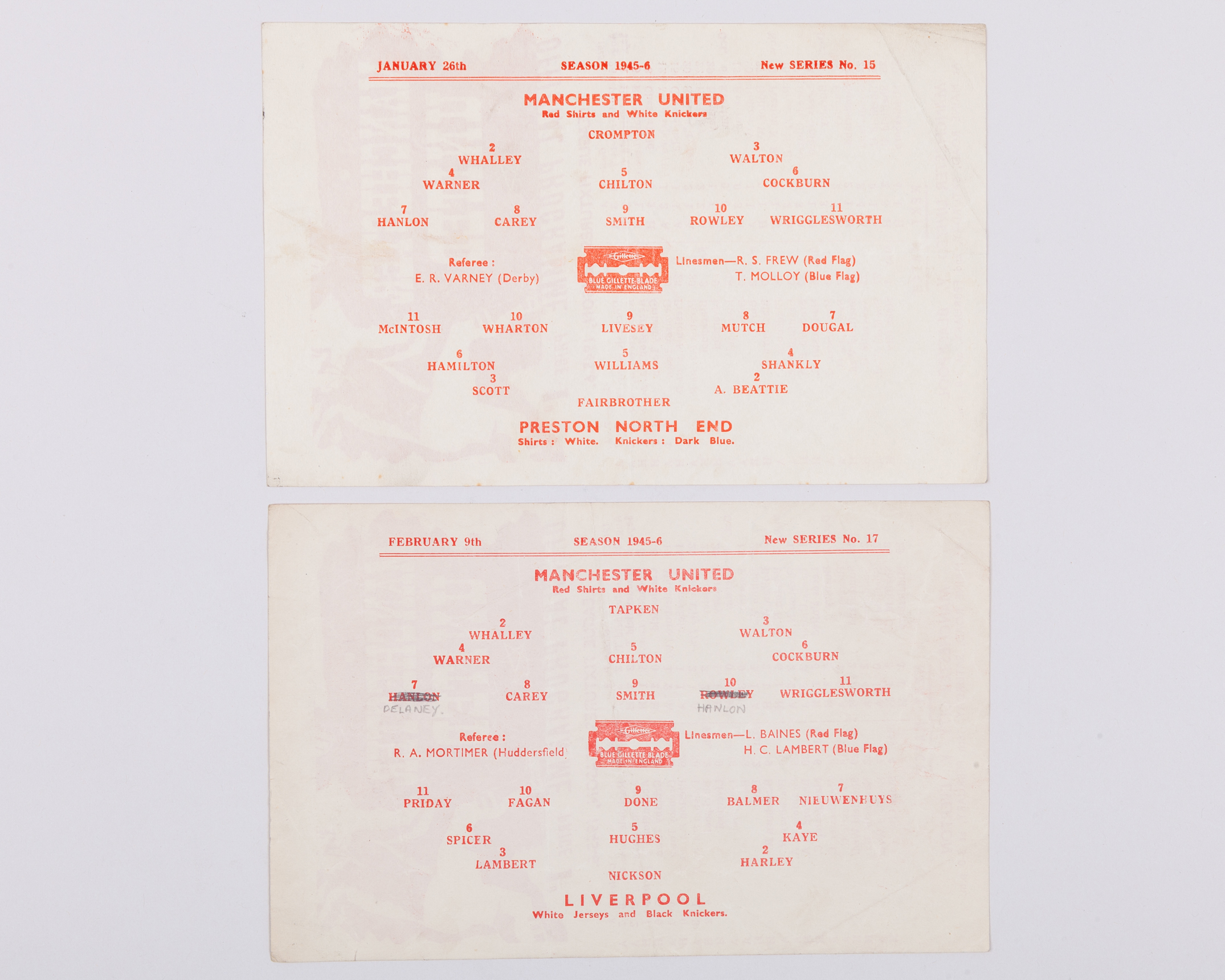 Two Manchester United single-sheet match programmes, 1945, comprising Preston North End, 26th January 1945 and Liverpool, 9th February 1945, text on team page, folds (2)