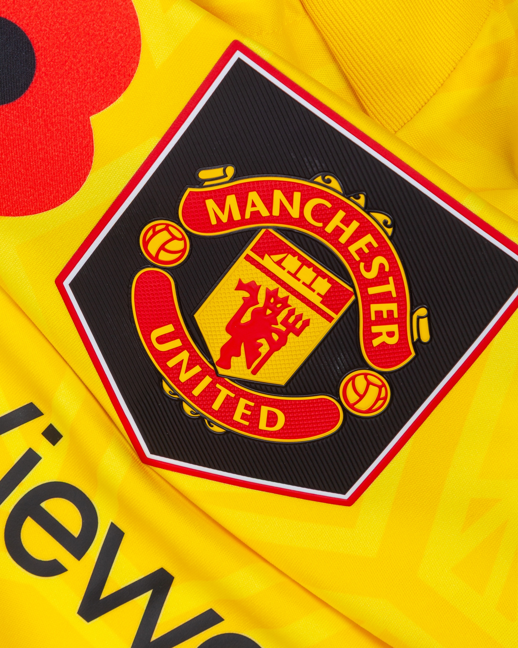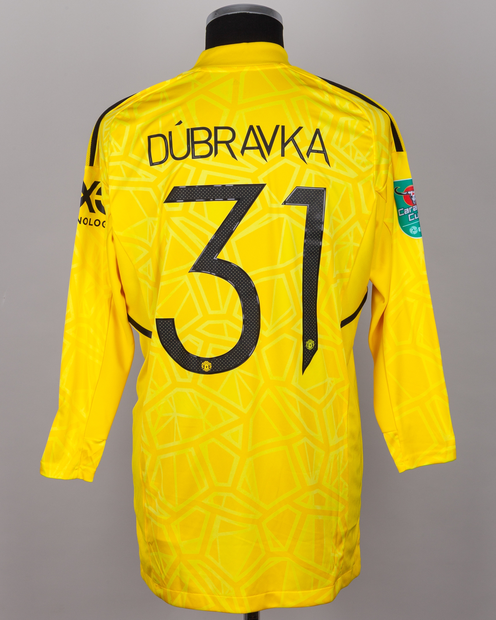 Martin Dubravka yellow No.31 Manchester United v. Aston Villa match issued goalkeeper shirt, 2022, Adidas, M, with v-neck collar and printed badge, with poppy badge, the reverse lettered DUBRAVKA, the right sleeve with Carabao Cup EFL flash