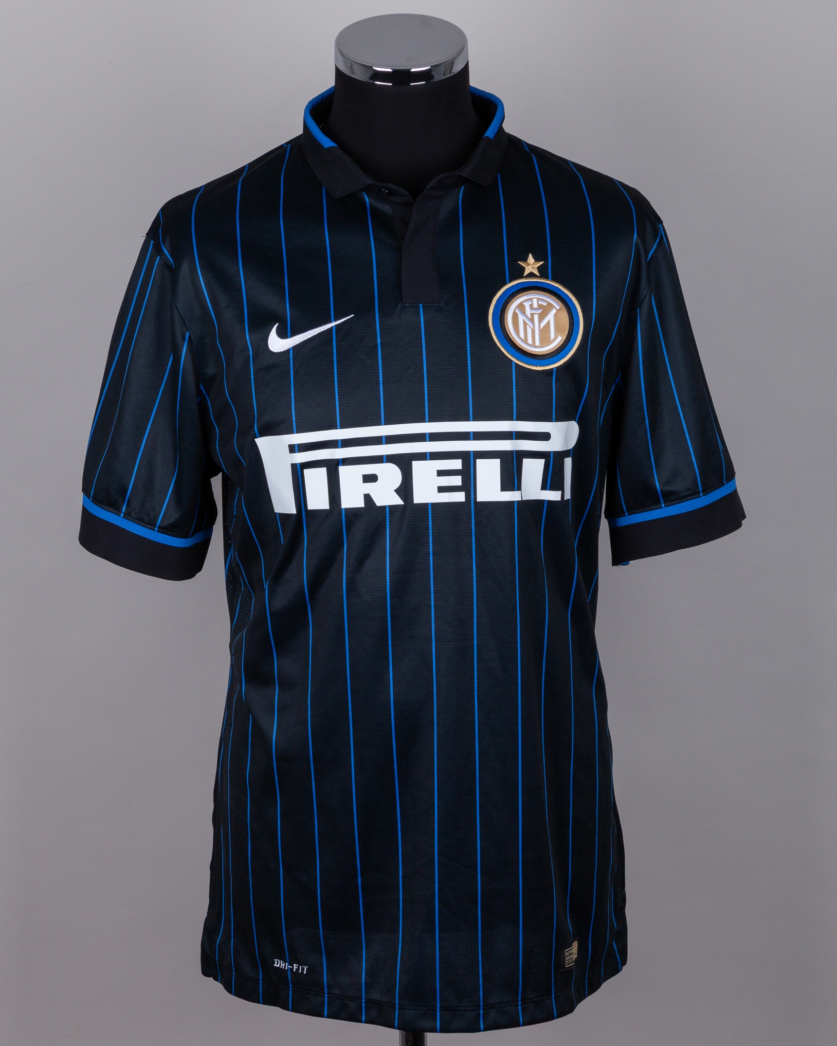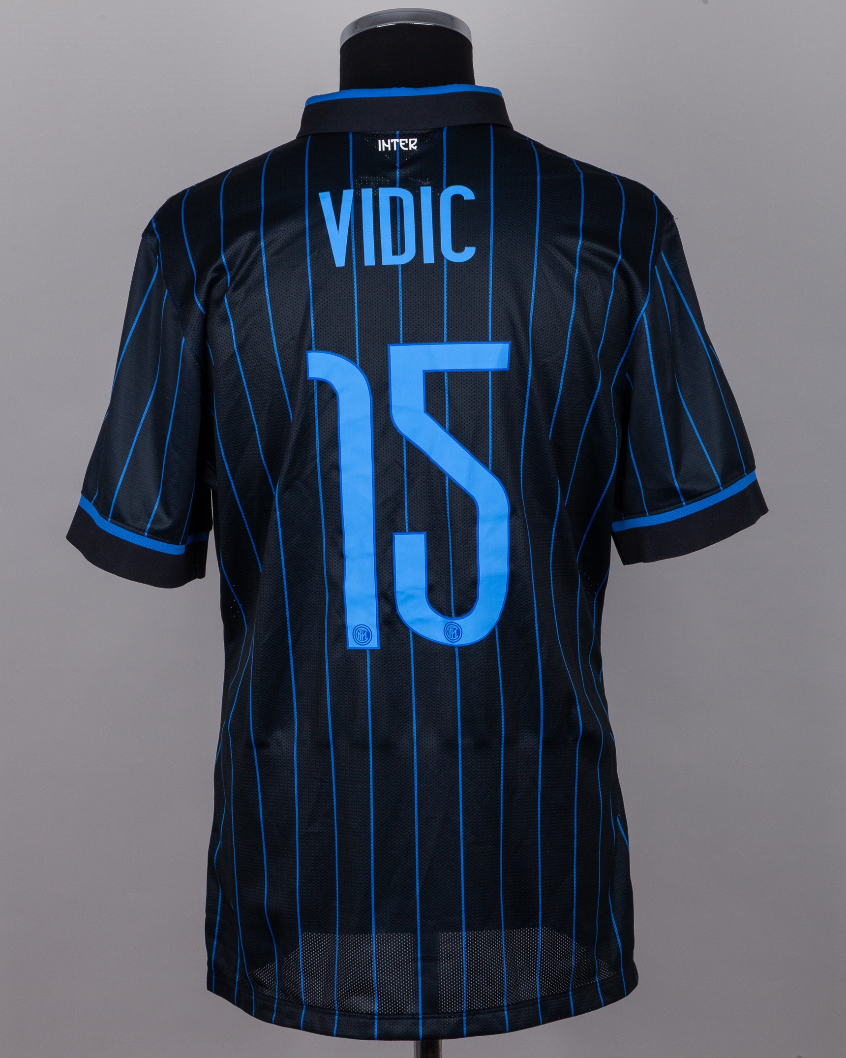 Nemanja Vidic black and blue No.15 Inter Milan v. Manchester United short-sleeved shirt, 2014, Nike, XL, with button-up collar and embroidered cloth badge, the reverse lettered VIDIC