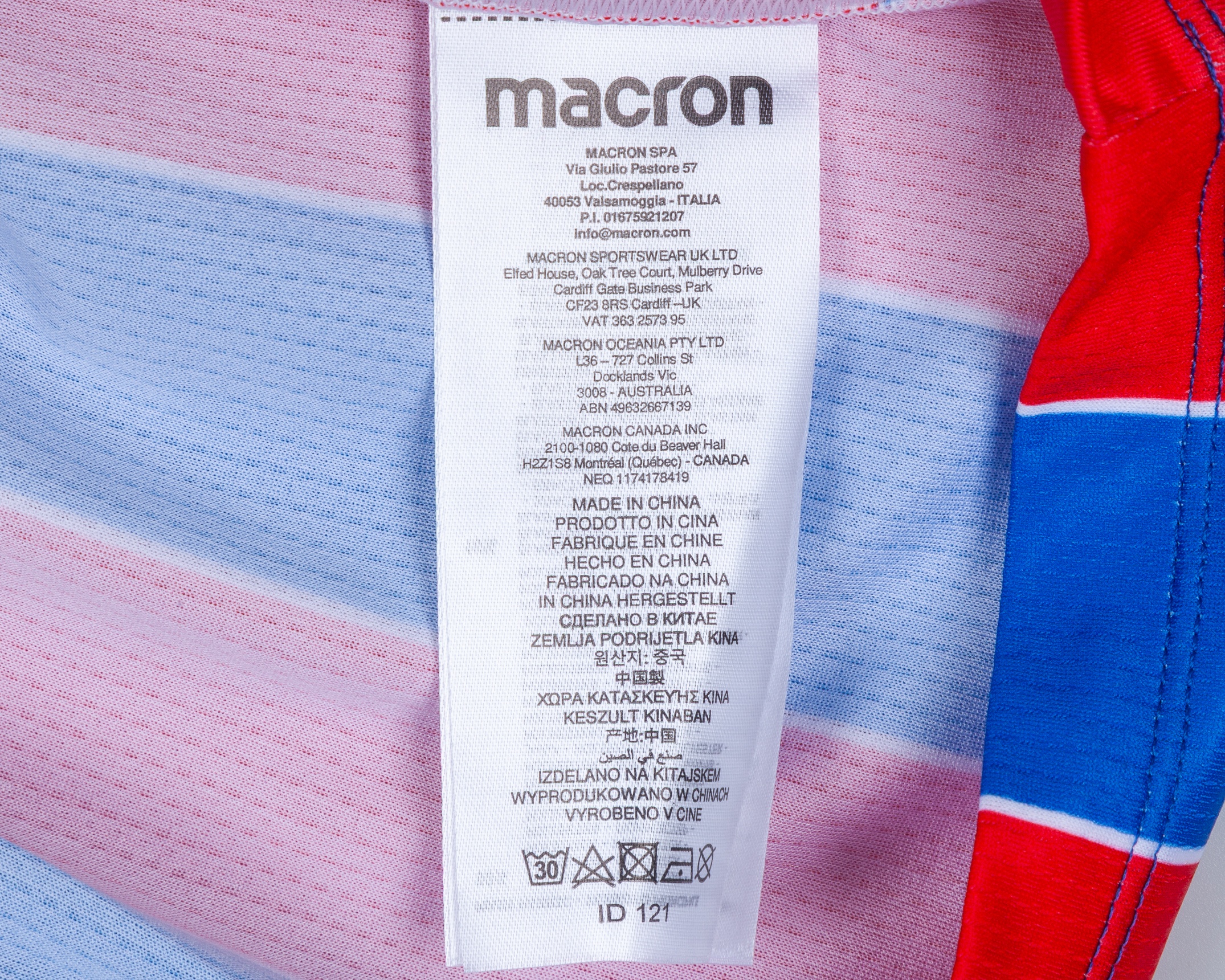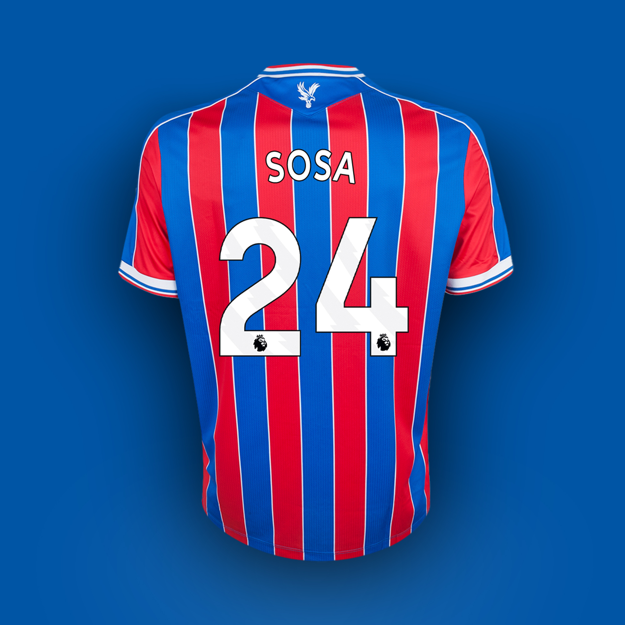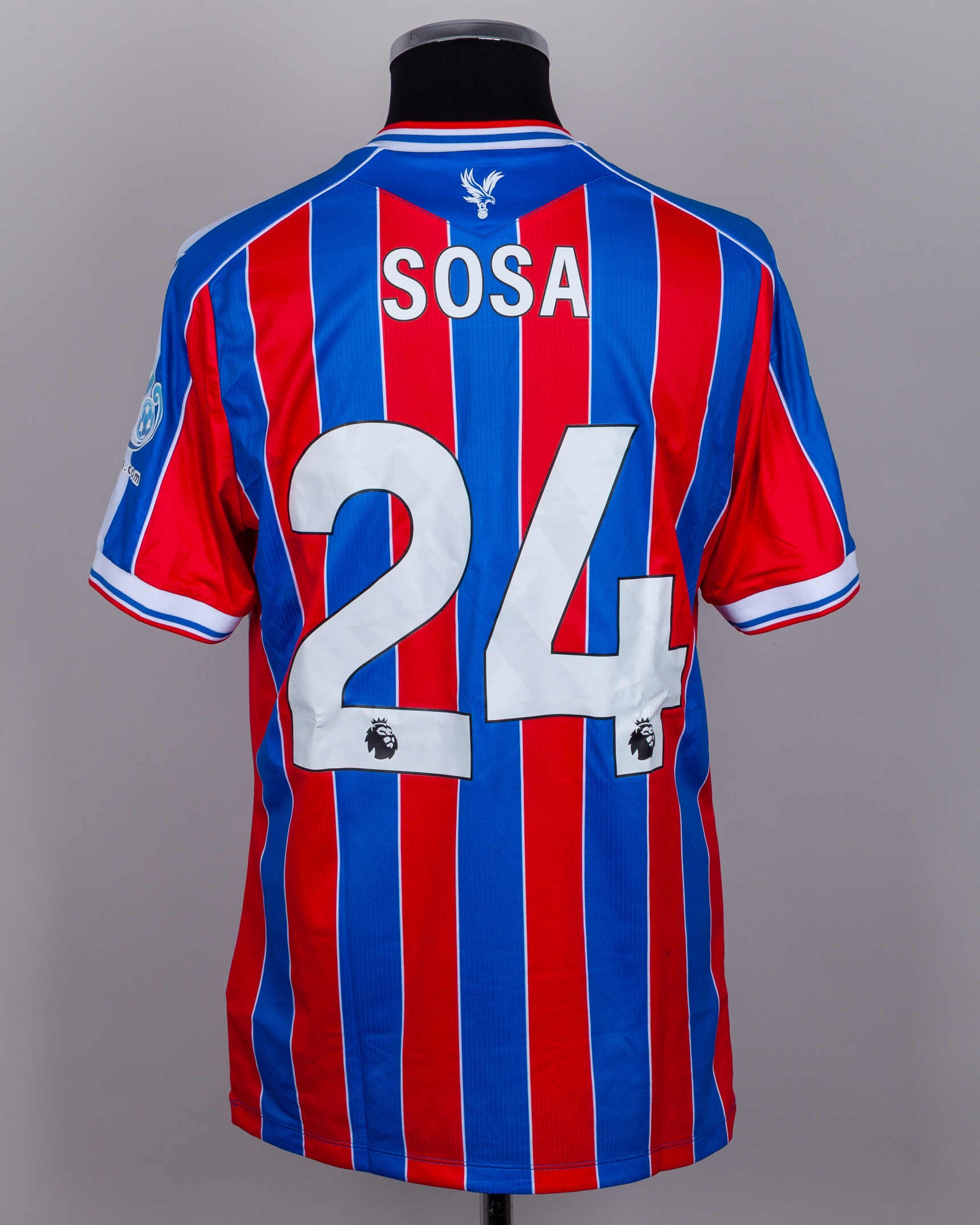Borna Sosa red and blue No.24 Crystal Palace v. Brighton match issued short-sleeved shirt, Premier League 2025, Macron, with crew-neck collar and printed badge with commemorative poppy, the reverse lettered SOSA, the right sleeve with Premier League logo