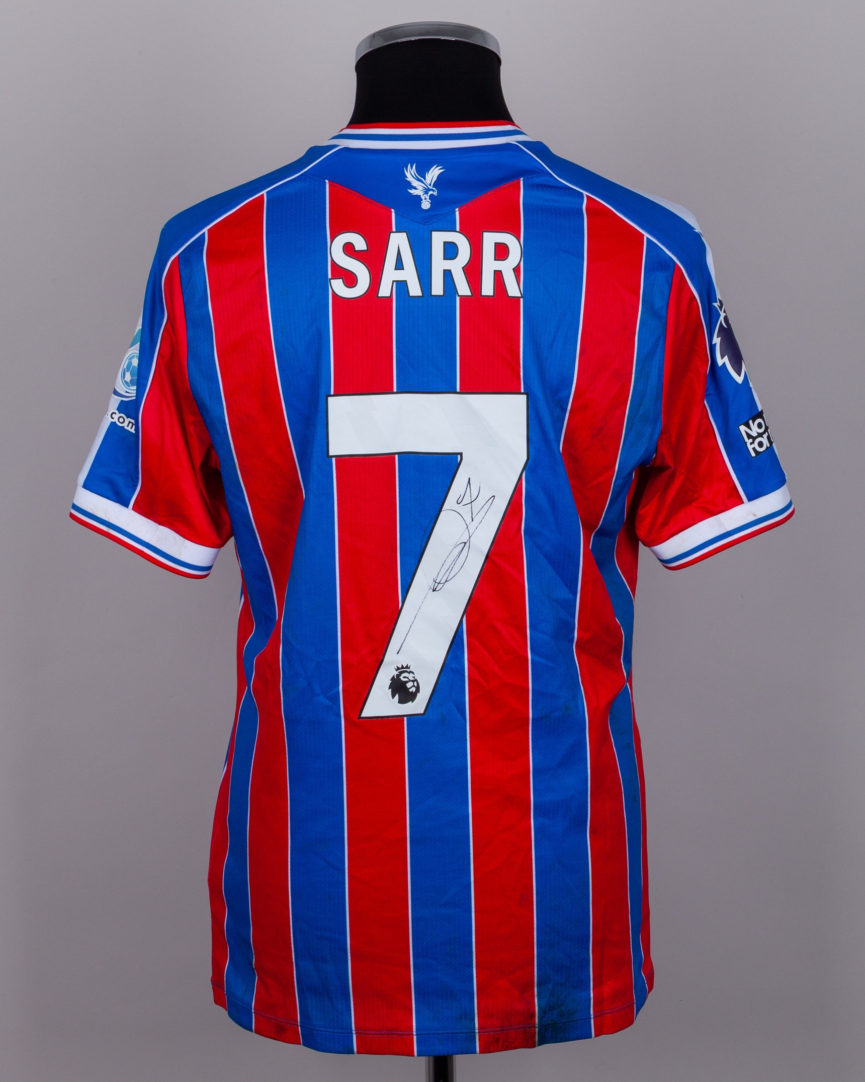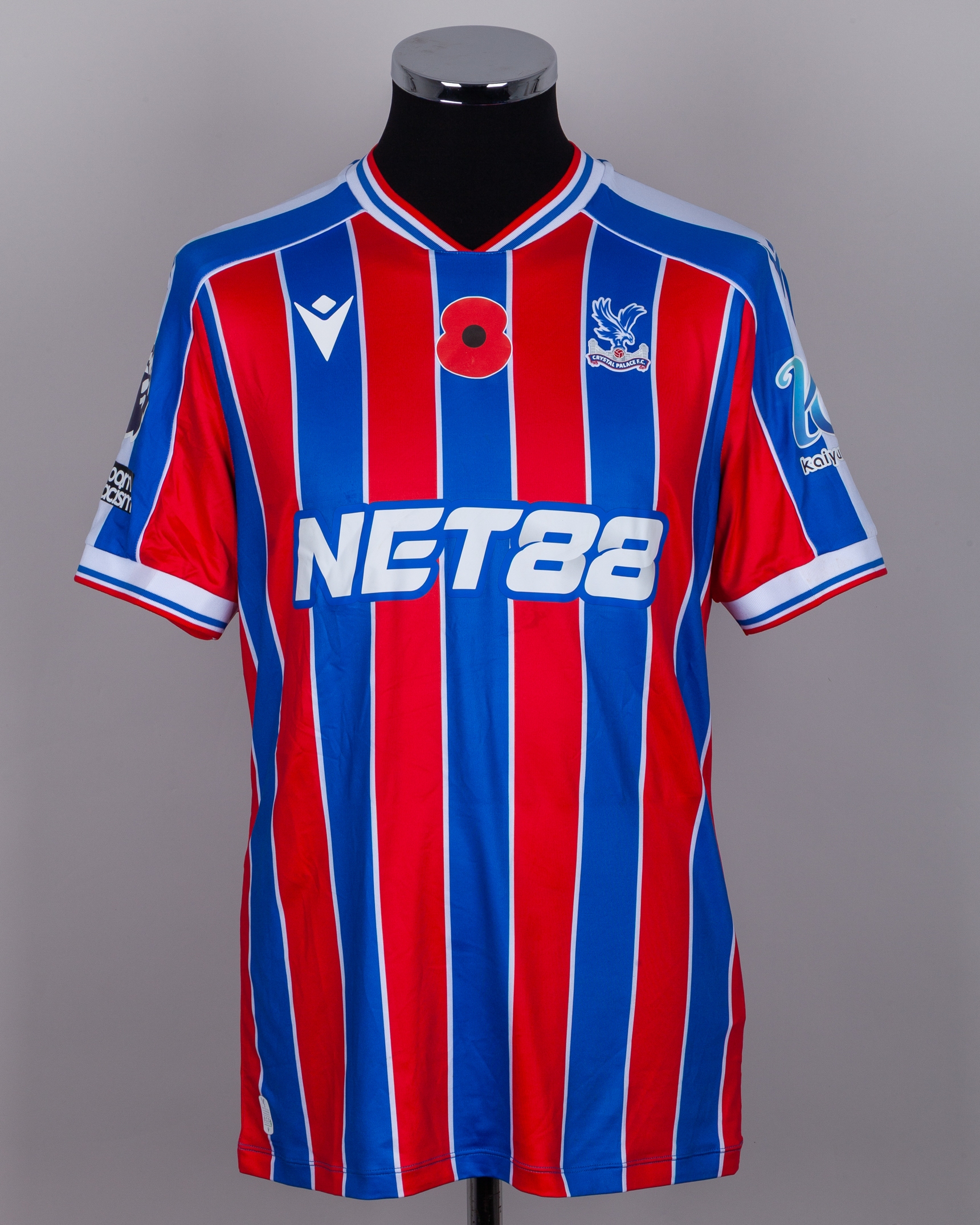 Ismaïla Sarr red and blue No.7 Crystal Palace v. Brighton match worn signed short-sleeved shirt, Premier League 2025, Macron, with crew-neck collar and printed badge with commemorative poppy, the reverse lettered SARR, the right sleeve with Premier League logo