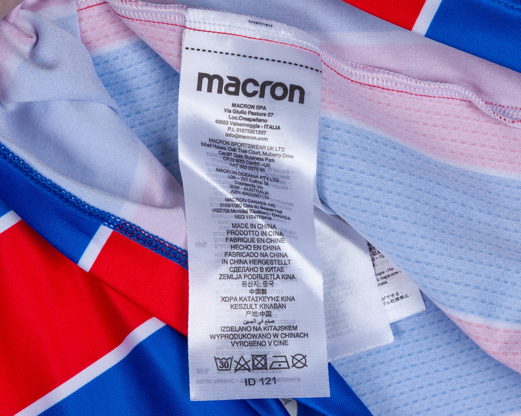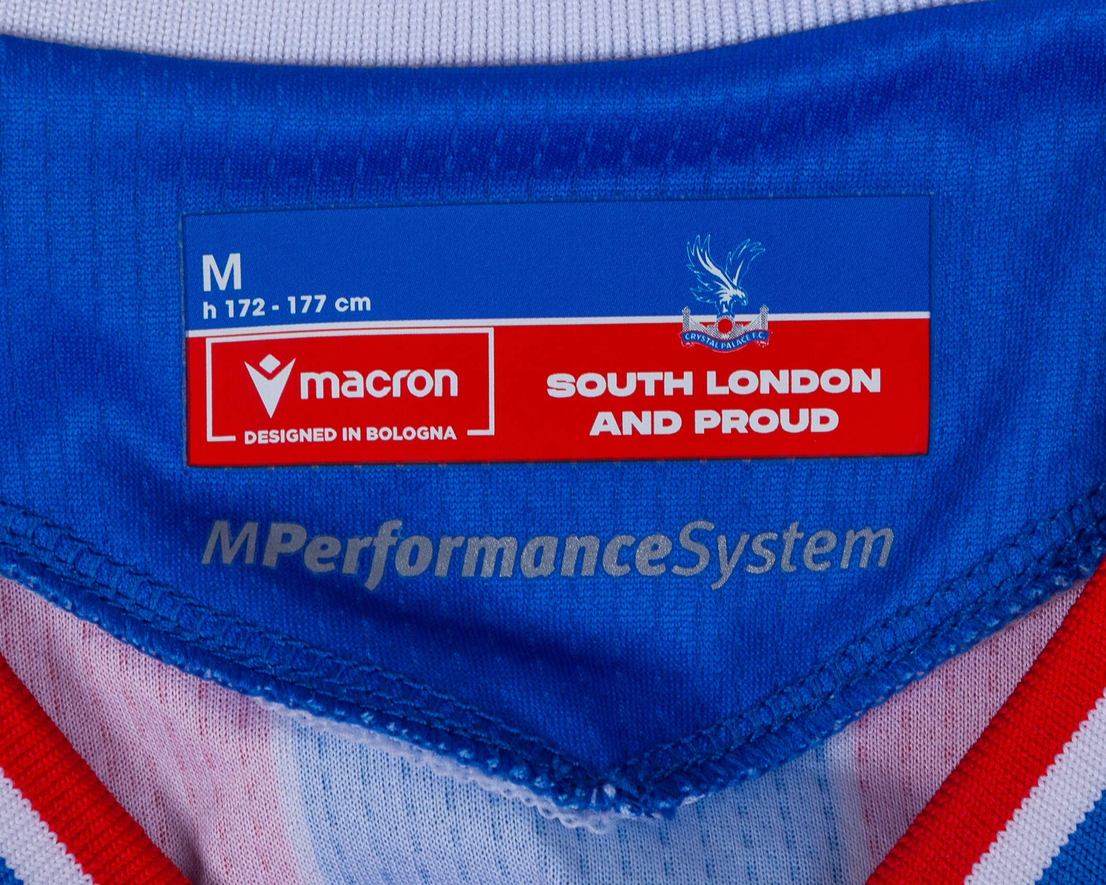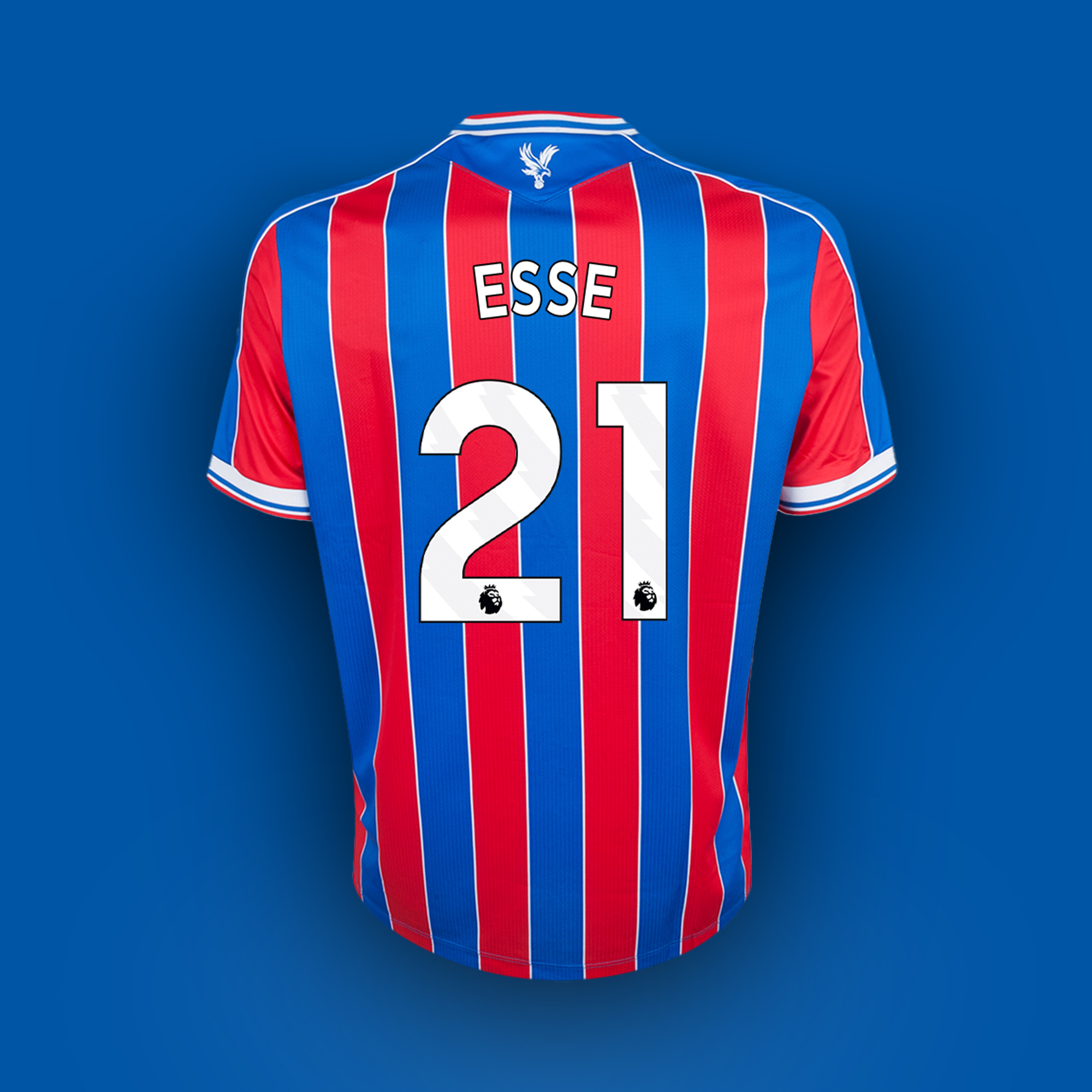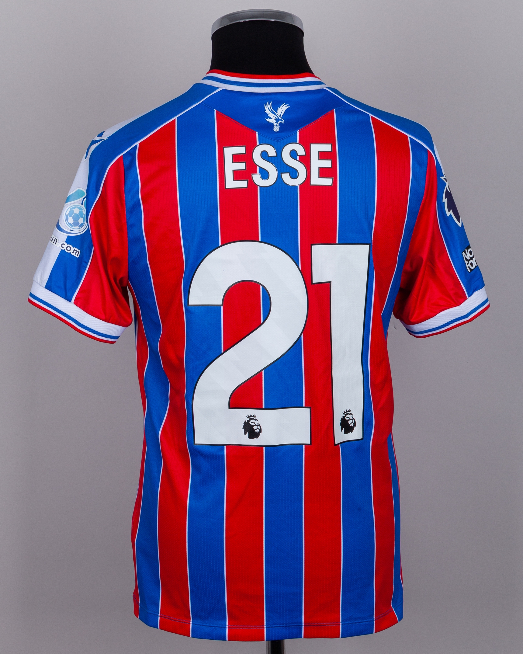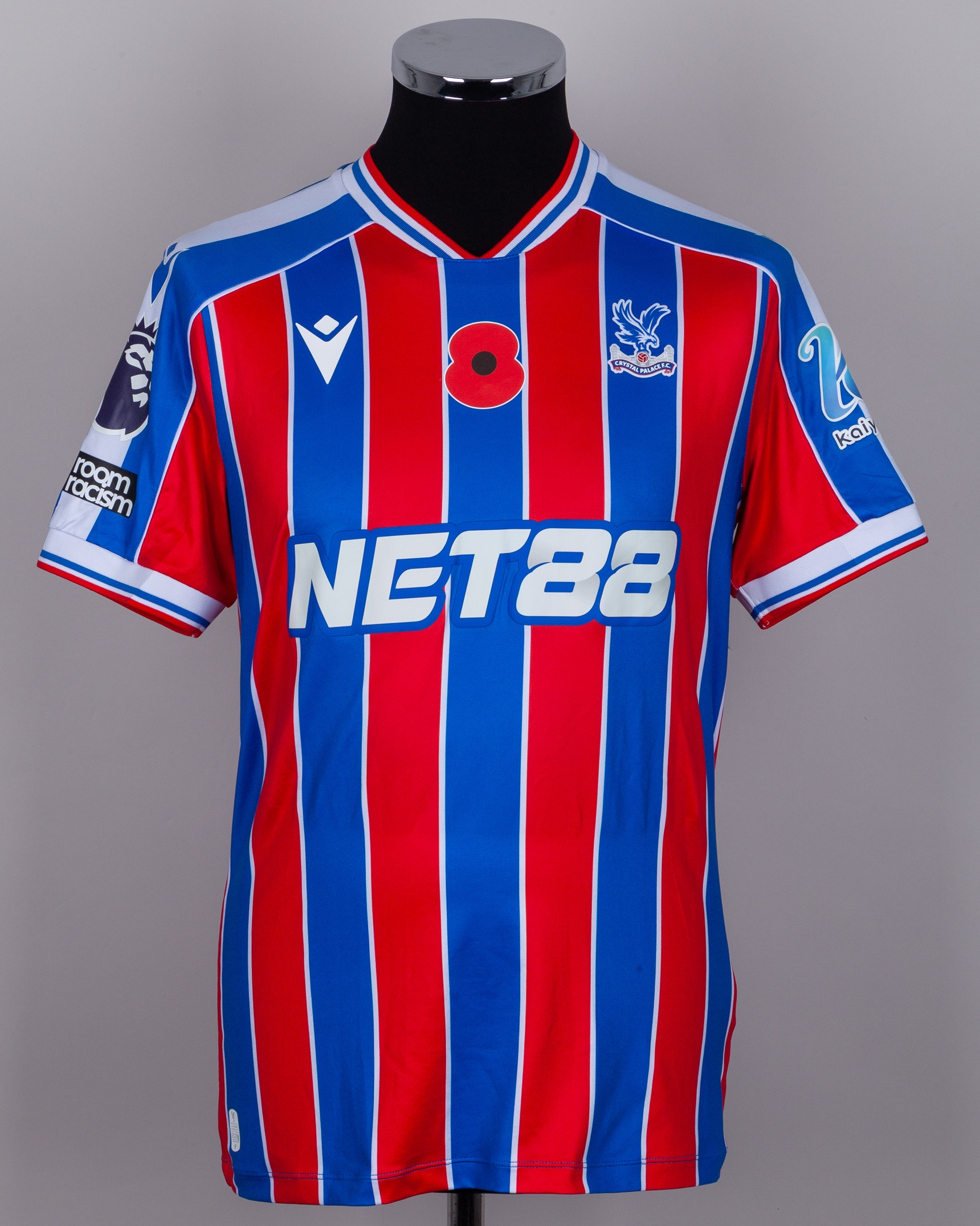 Romain Esse red and blue No.21 Crystal Palace v. Brighton match issued short-sleeved shirt, Premier League 2025, Macron, with crew-neck collar and printed badge with commemorative poppy, the reverse lettered ESSE, the right sleeve with Premier League logo