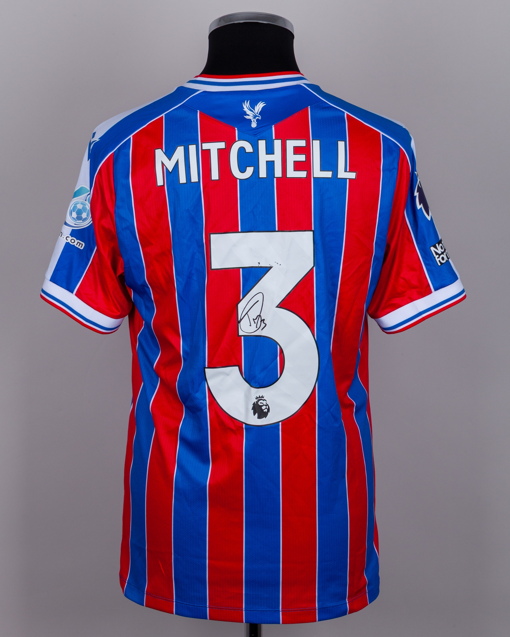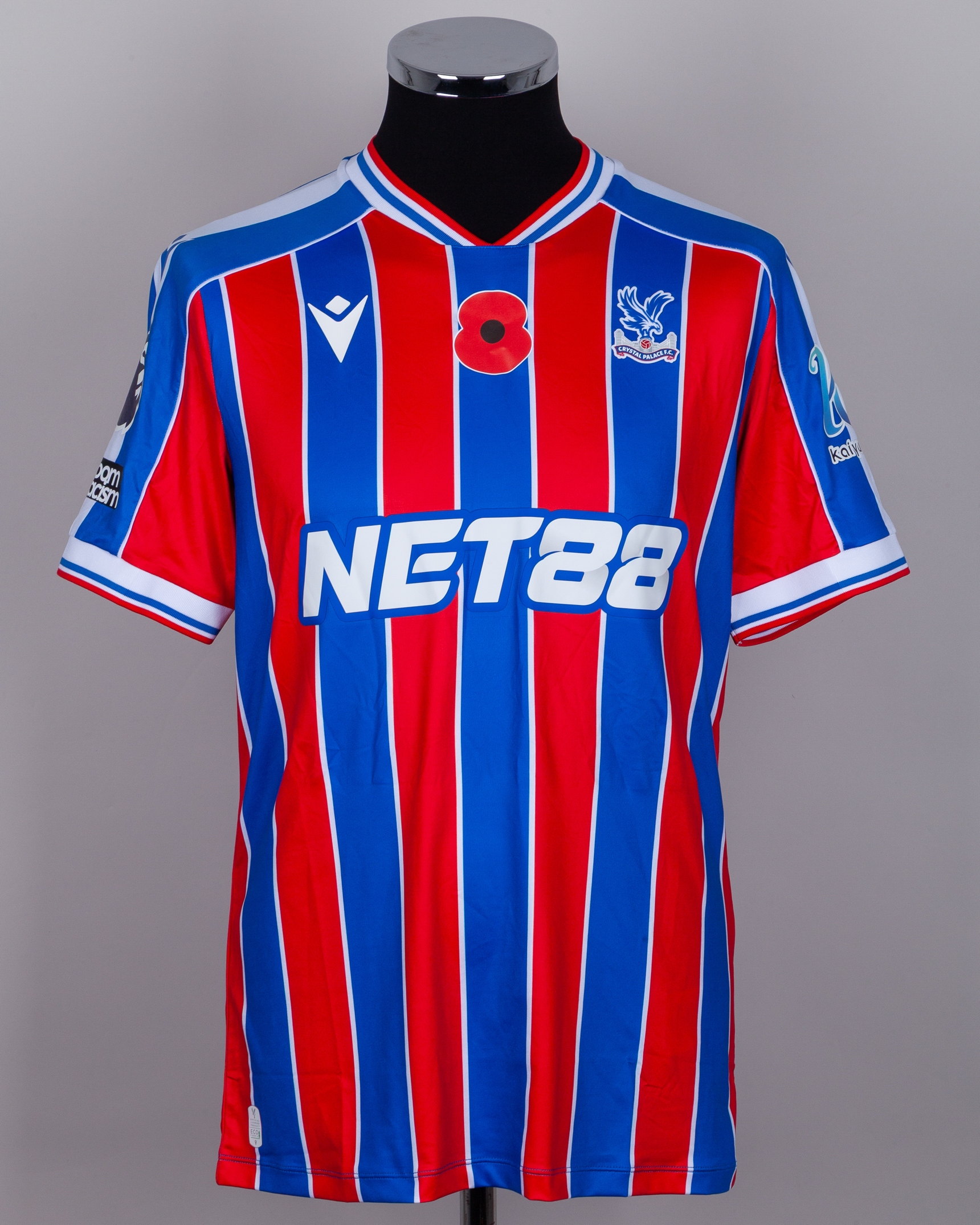 Tyrick Mitchell red and blue No.3 Crystal Palace v. Brighton match worn signed short-sleeved shirt, Premier League 2025, Macron, with crew-neck collar and printed badge with commemorative poppy, the reverse lettered MITCHELL, the right sleeve with Premier League logo