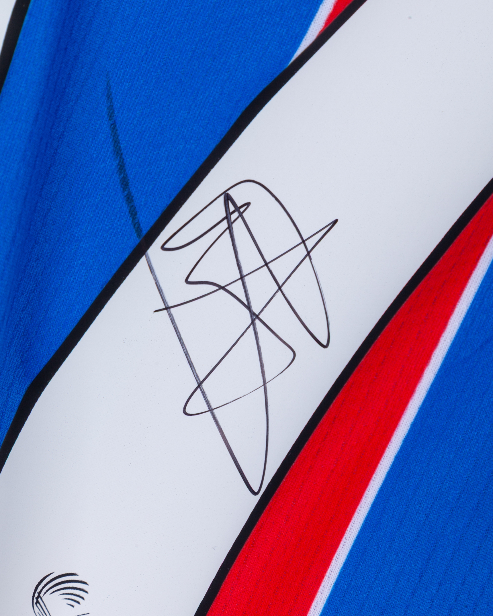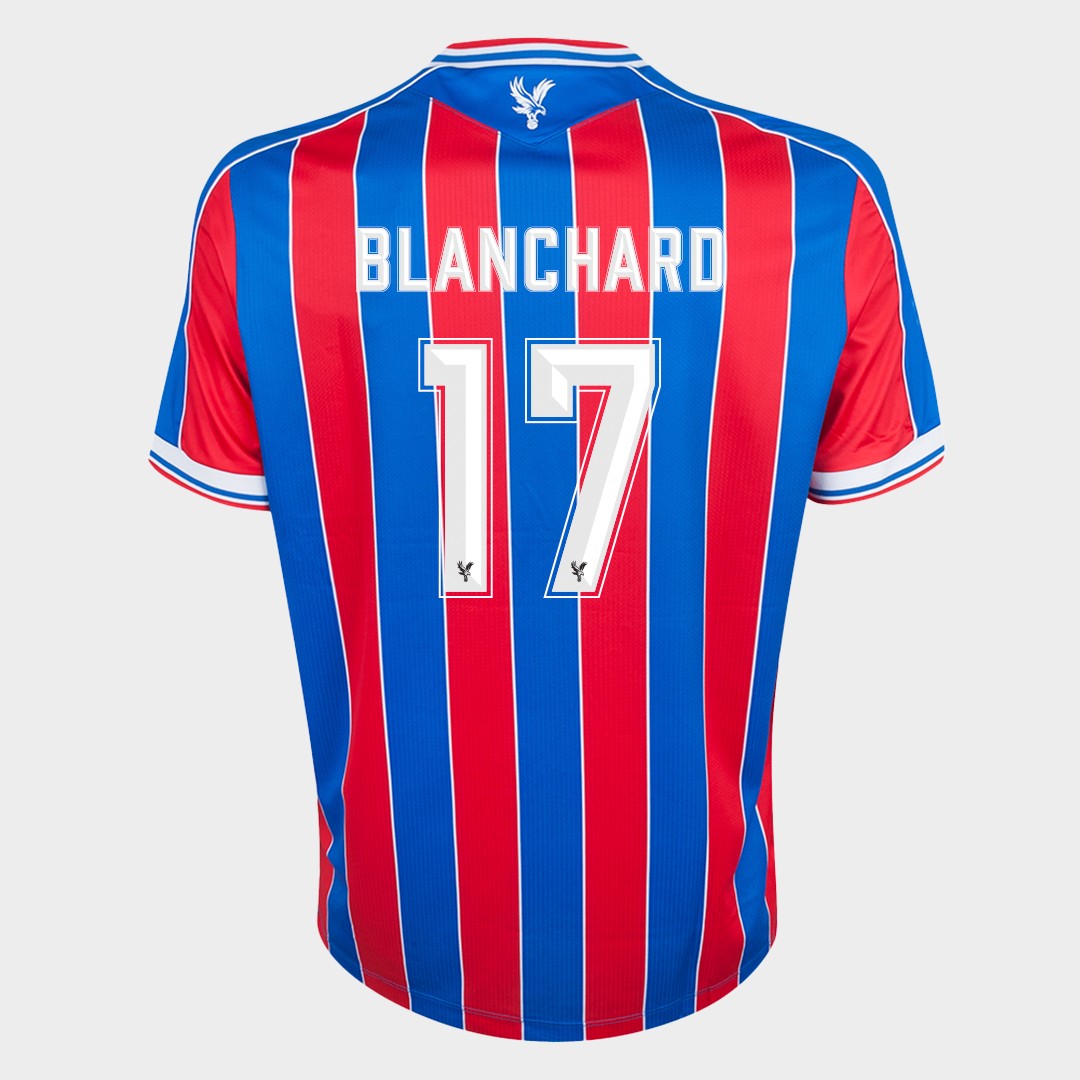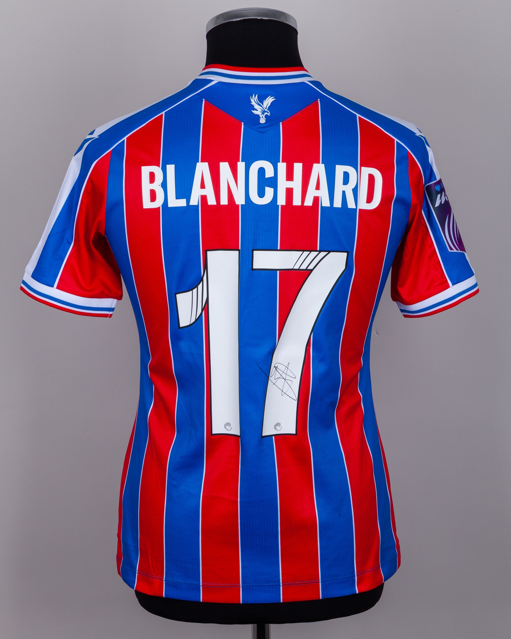 Annabel Blanchard red and blue No.17 Crystal Palace v. Sheffield United match worn signed short-sleeved shirt, Women's Super League 2 2025, Macron, with crew-neck collar and printed badge with commemorative poppy, the reverse lettered BLANCHARD, the right sleeve with WSL 2 logo