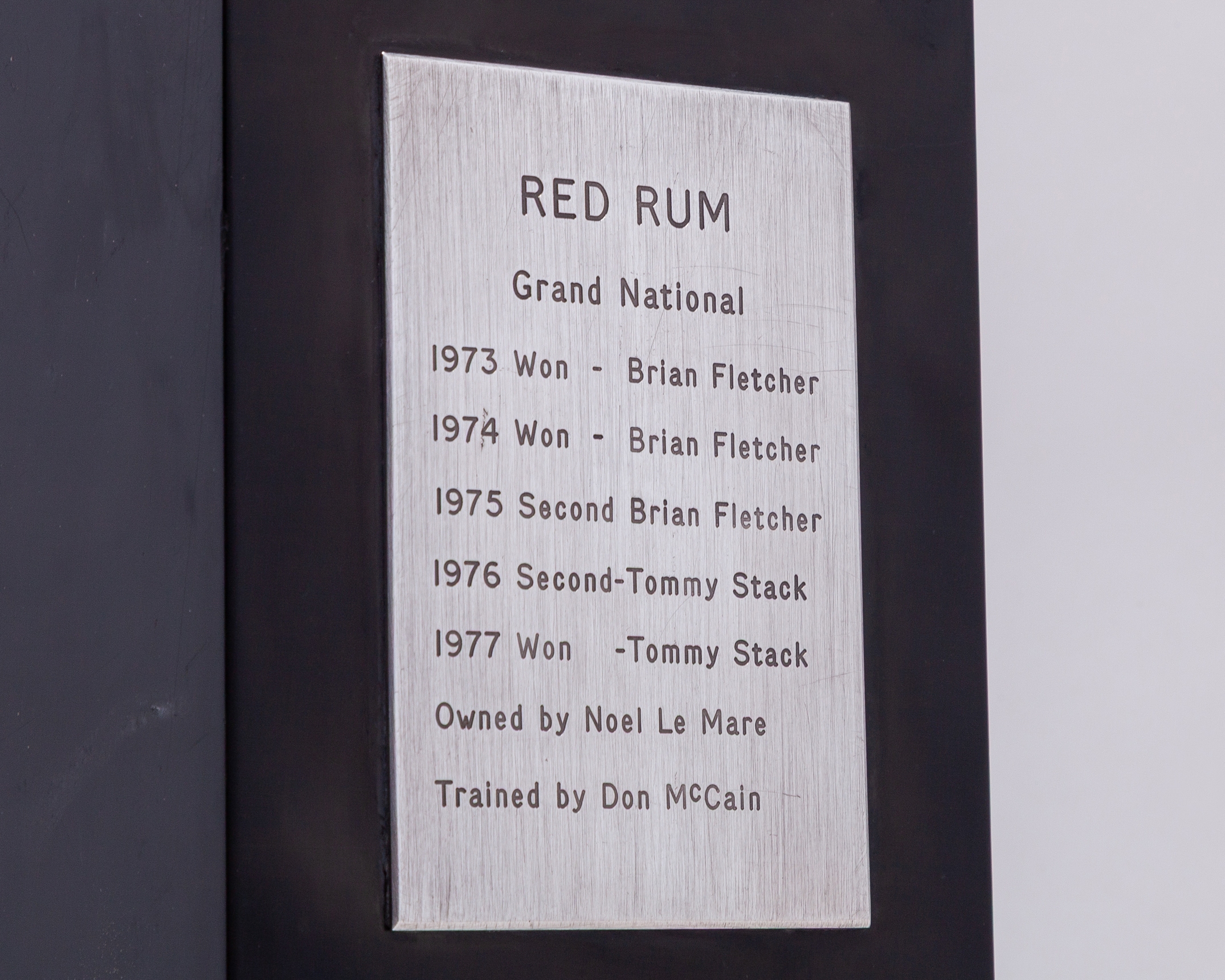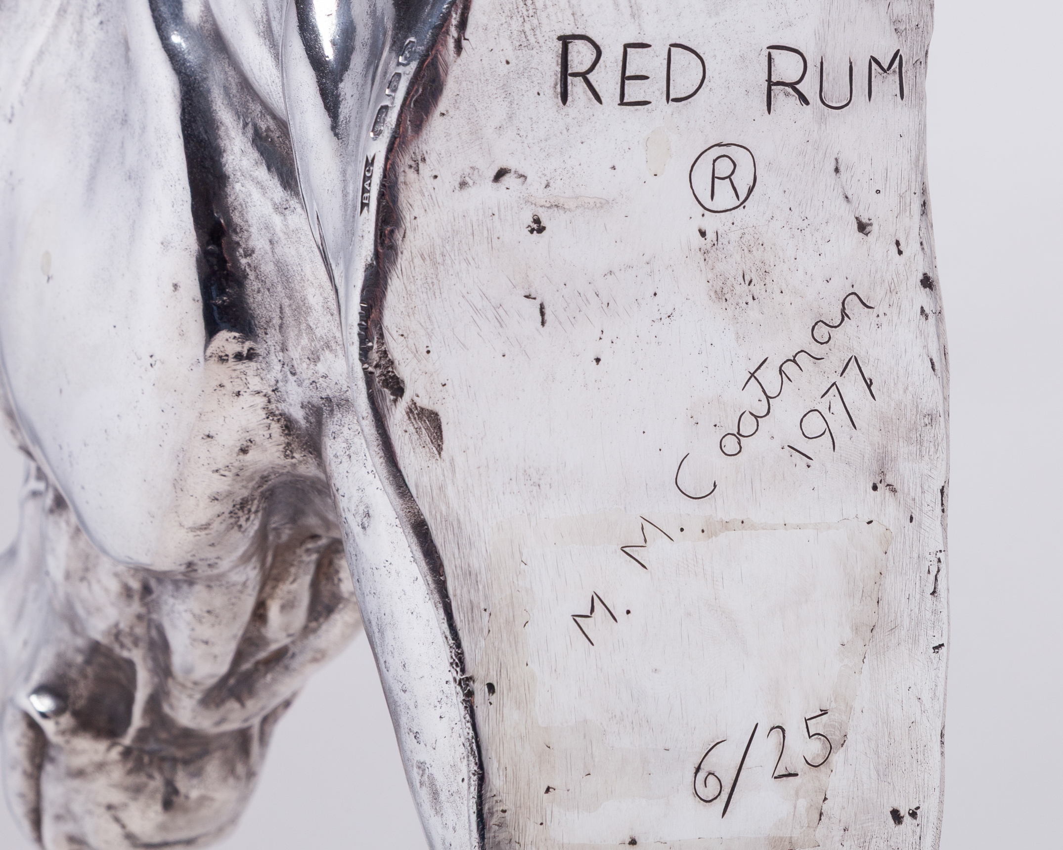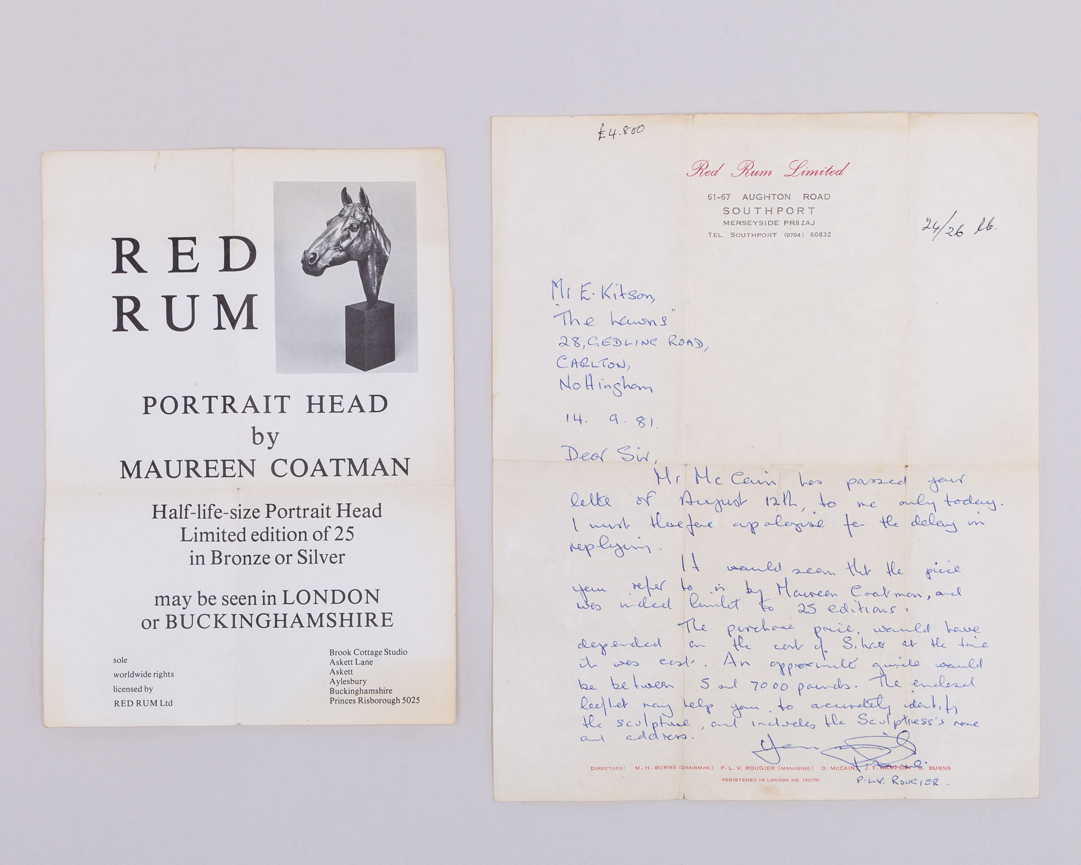 hallmarked BAC, London, 1979, weight approx. 12.7kg. of solid silver, sculpted by Maureen Coatman (British, 1919-2005), a half-life size portrait head, 42 by 38cm., produced as a limited edition of 25 in bronze or silver, this example numbered 6/25, the silver version being very scarce and the first one seen by the auctioneer, only bronze examples having appeared previously on the auction market, the underside signed by the sculptor M M Coatman, dated 1977 and titled RED RUM, originally licensed by Red Rum Limited, screw mounted on a black marble plinth, 20 by 10cm., the front titled RED RUM, the reverse set with a plaque inscribed, RED RUM, GRAND NATIONAL, 1973 WON - BRIAN FLETCHER, 1974 WON - BRIAN FLETCHER, 1975 SECOND - BRIAN FLETCHER, 1976 SECOND - TOMMY STACK, 1977 WON - TOMMY STACK, OWNED BY NOEL LE MARE, TRAINED BY DON McCAIN; offered with original sales flyer; and a related letter from Red Rum Limited