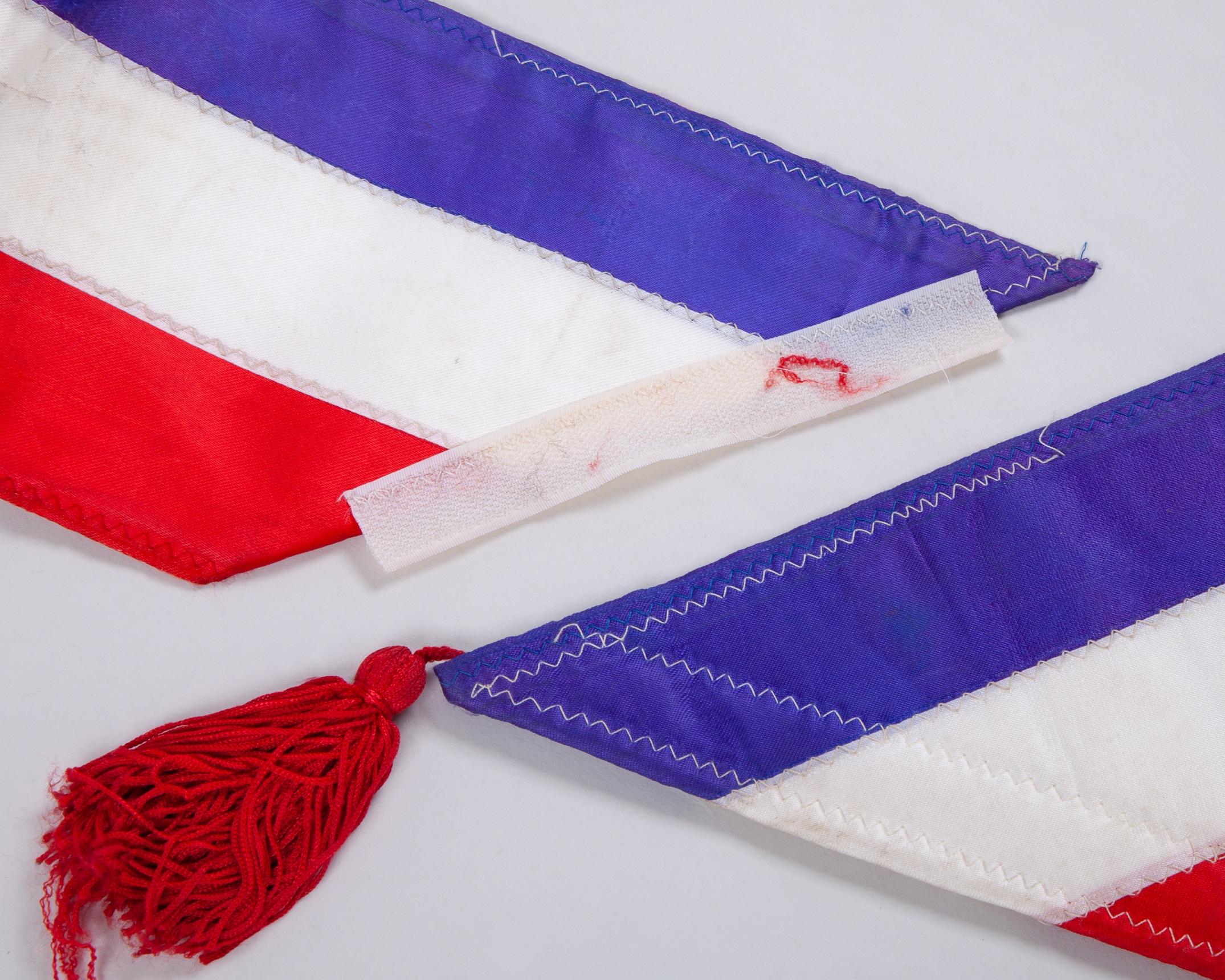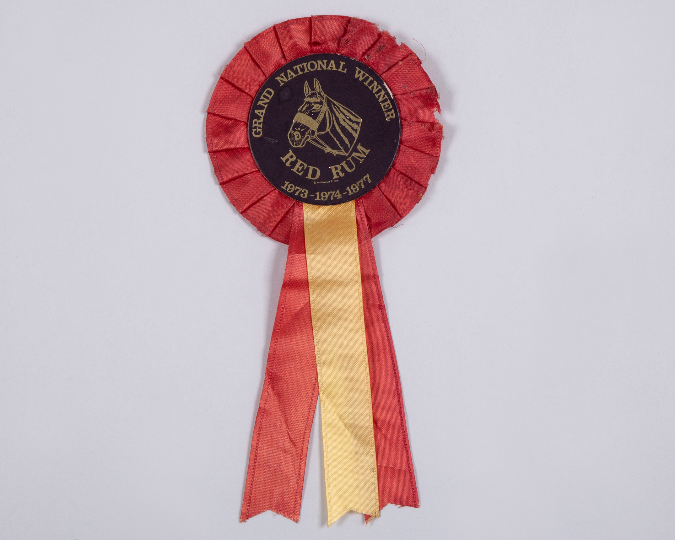 in red white and blue, inscribed gold TRIPLE GRAND NATIONAL WINNER, 1973, 1974, 1977; sold together with a Red Rum rosette (2)