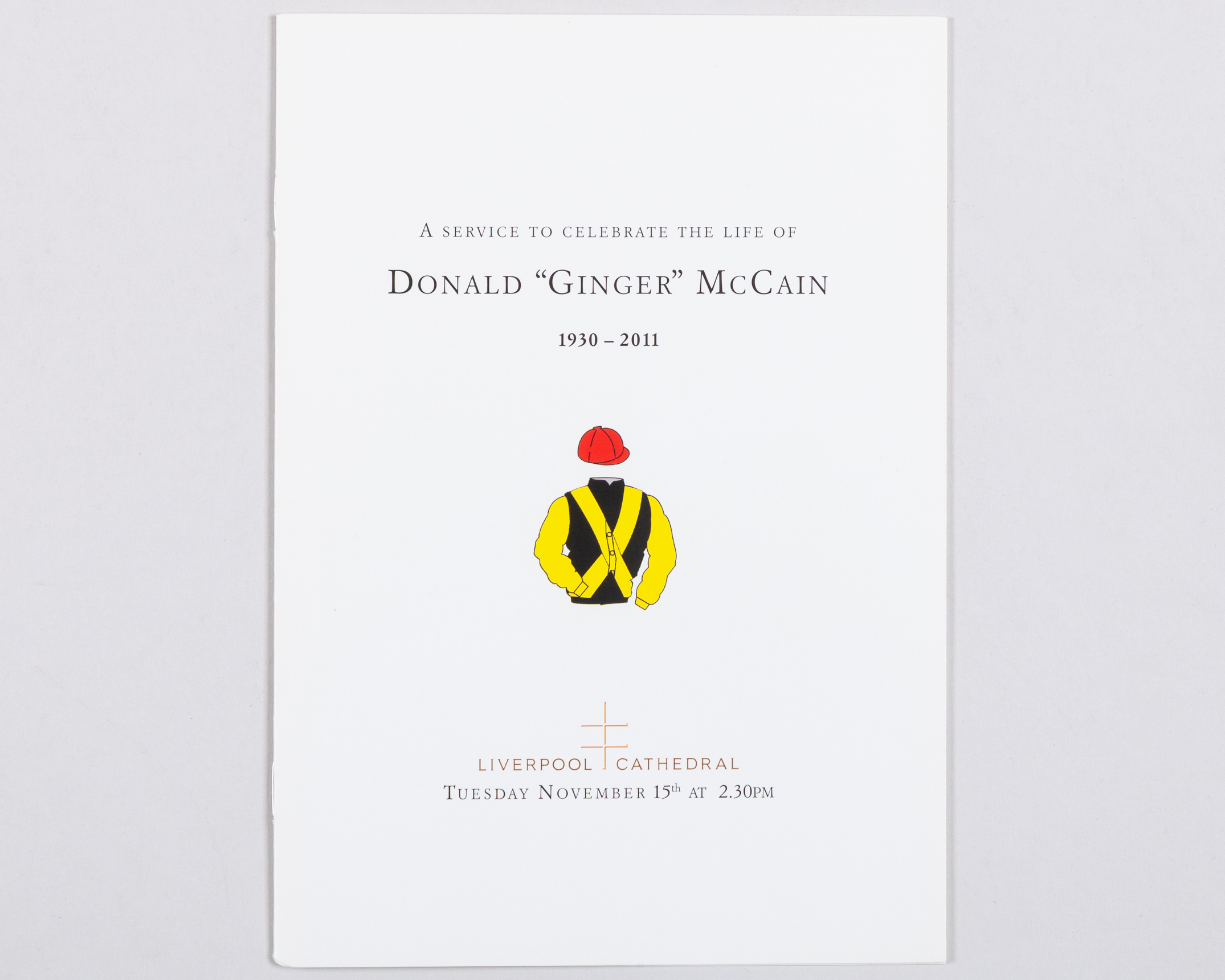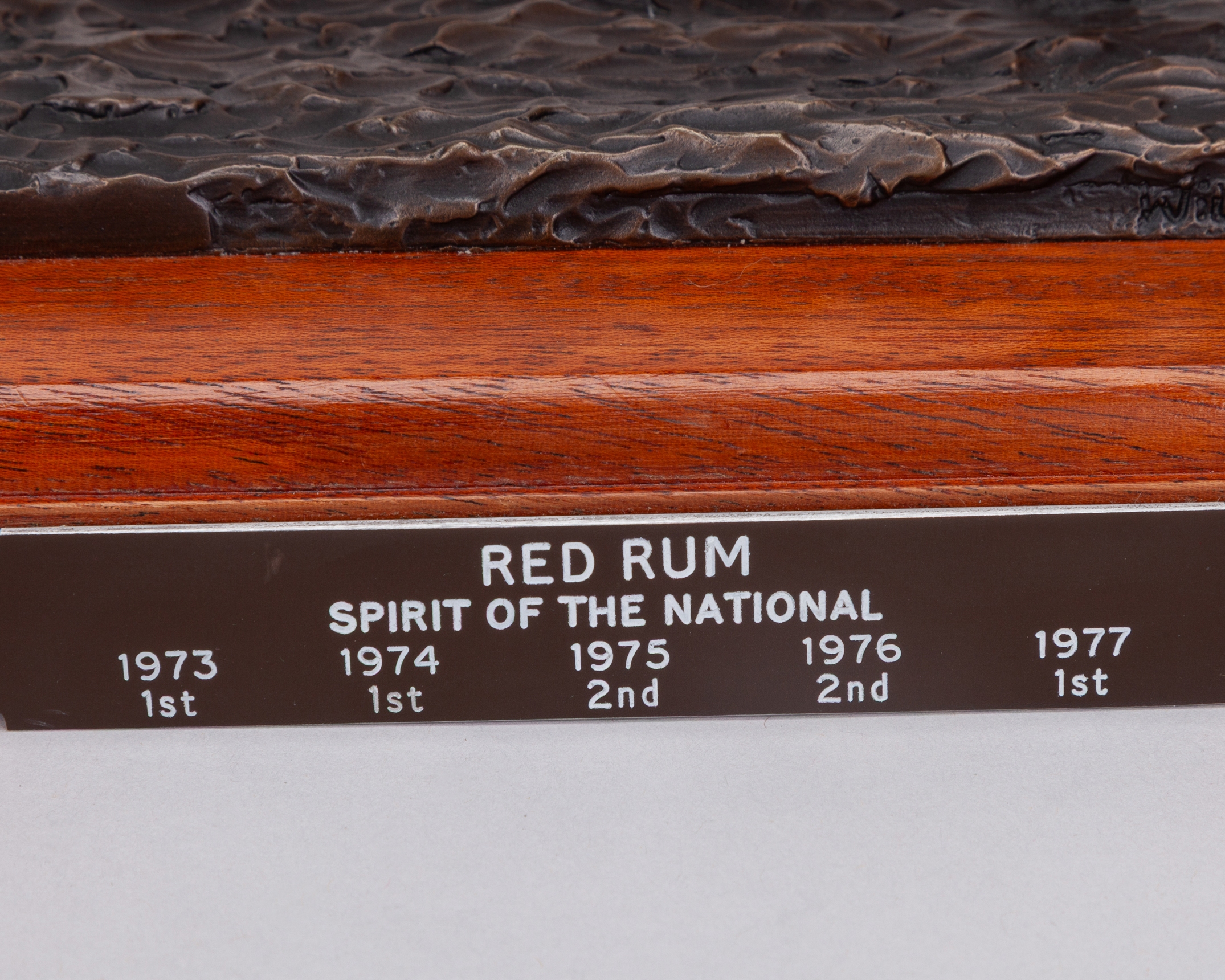 numbered 92, published by Aintree Racecouse, modelled in take-off to jump a fence, the wooden base set with a plaque inscribed with title and Red Rum's Grand National record 1973 to 1977, 25 by 33cm.; sold with a Ginger McCain Memorial Order of Service (2)