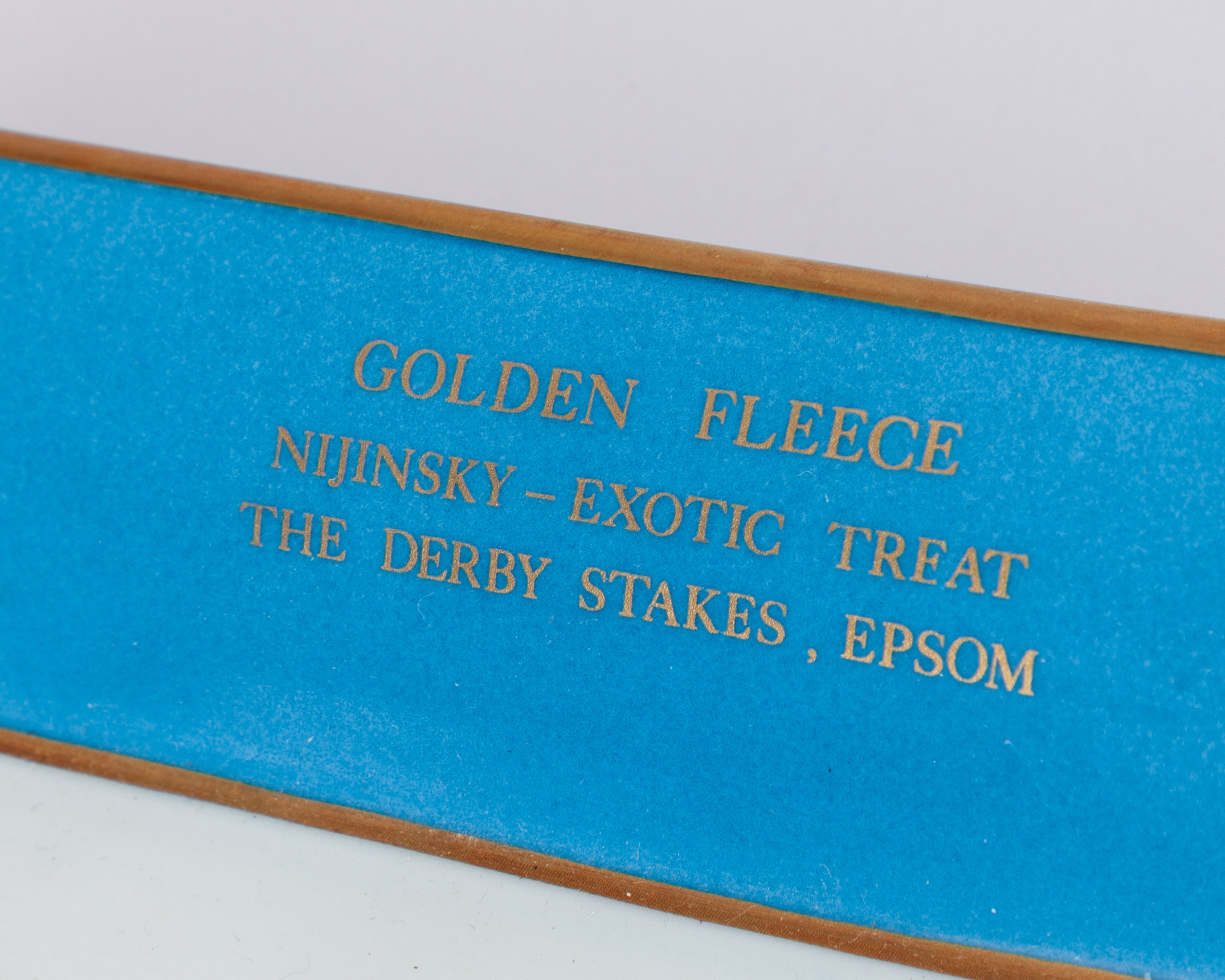 featuring a jockey cap in the Sangster colours, turquoise border with gilt inscription, gilded details, 15 by 19cm.