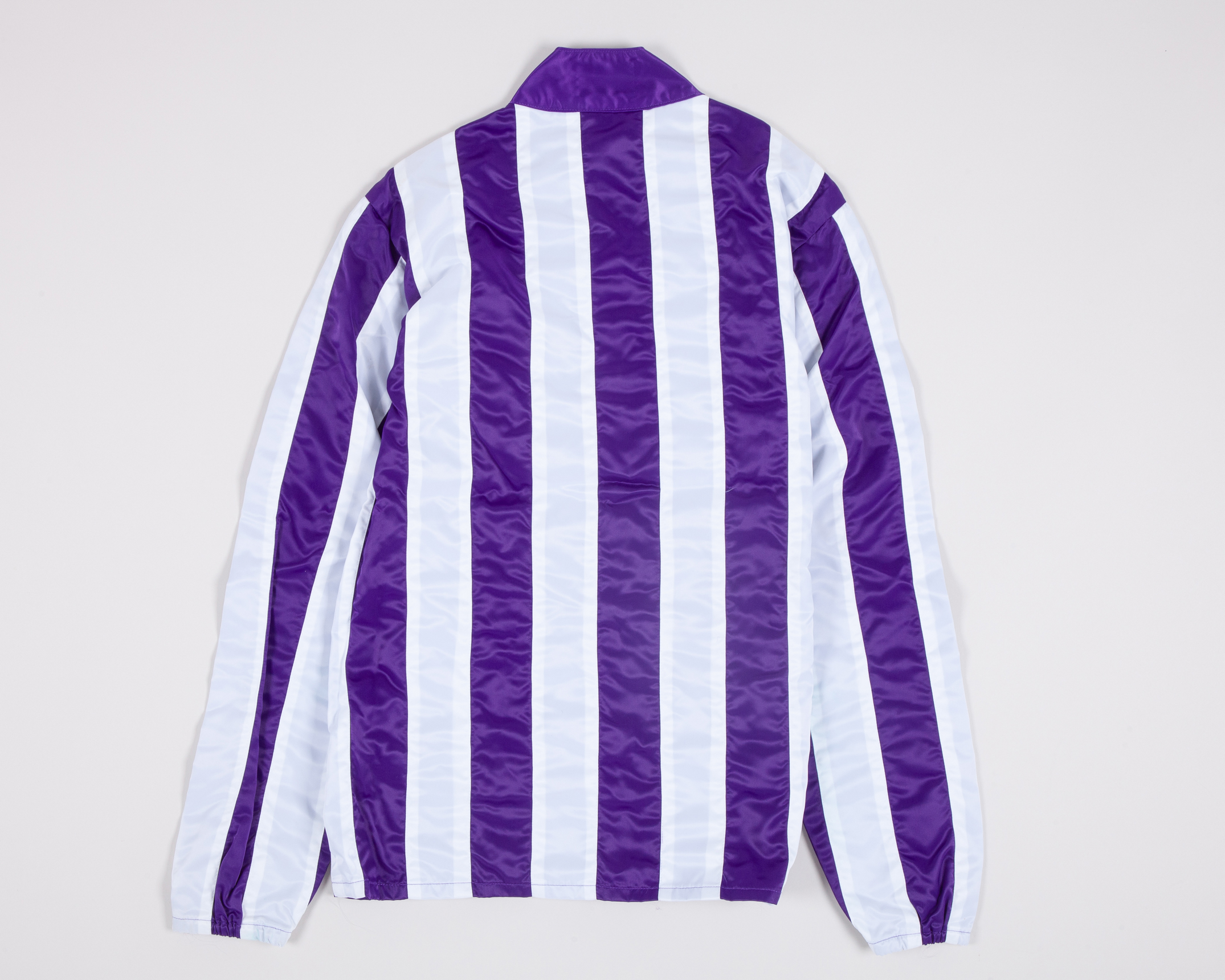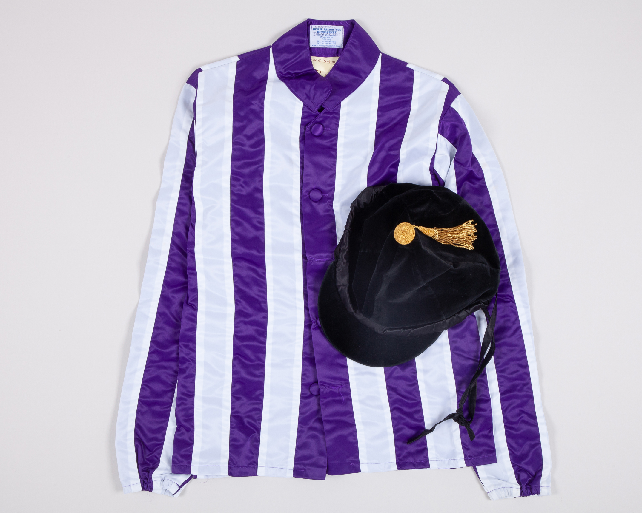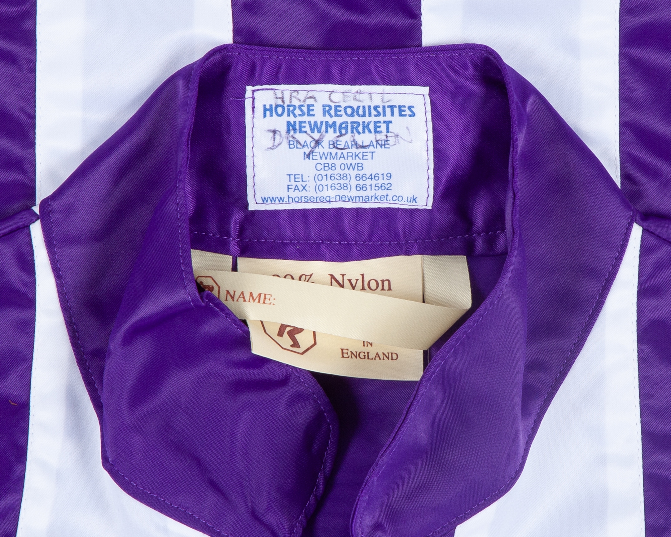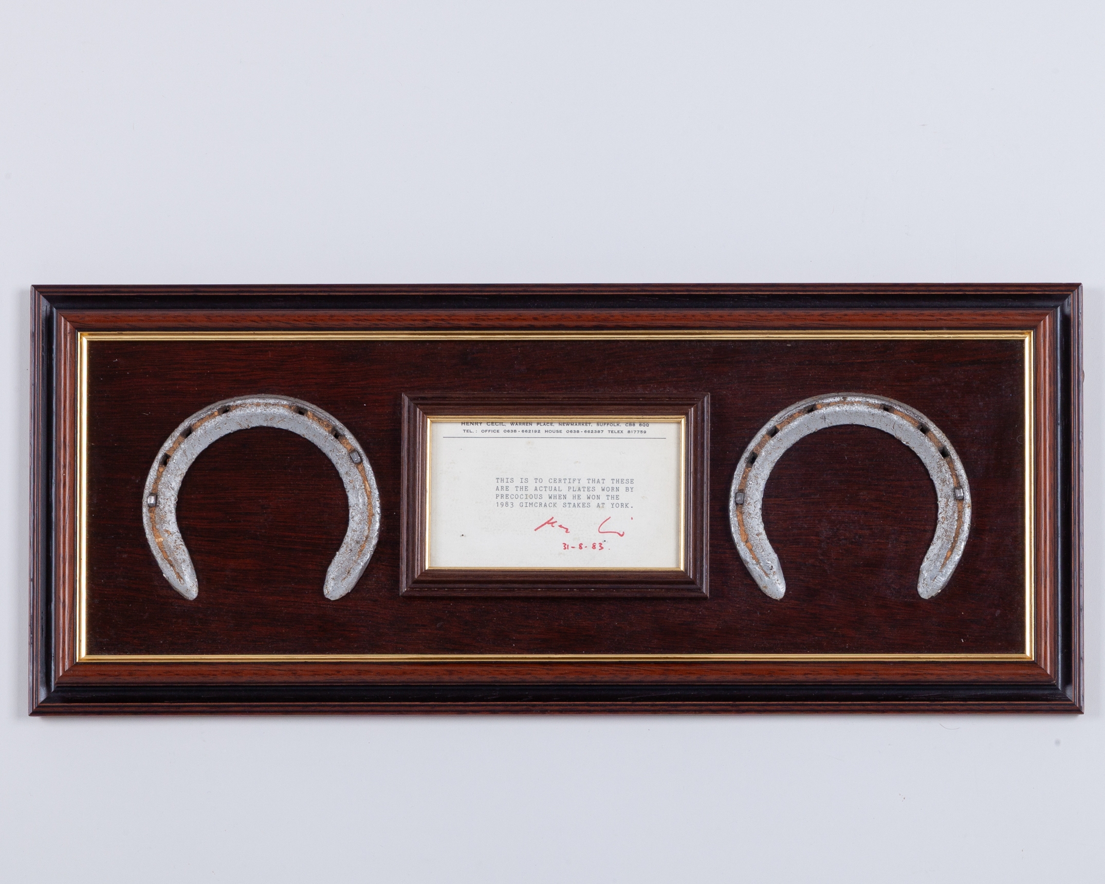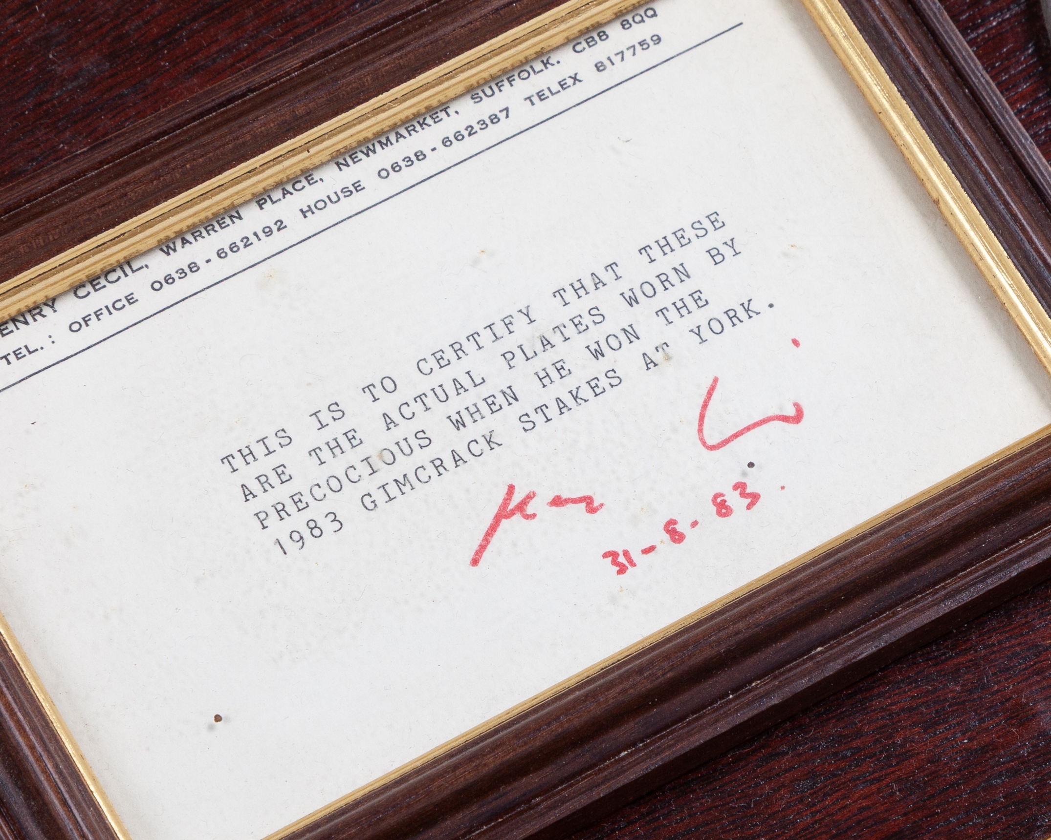 set on a wooden backboard/frame with a signed note from the racehorse trainer Henry Cecil on Warren Place headed stationery, reading THIS IS TO CERTIFY THAT THESE ARE THE ACTUAL PLATES WORN BY PRECOCIOUS WHEN HE WON THE 1983 GIMCRACK STAKES AT YORK, signed in red ink and dated 31.8.83, 23 by 56cm; sold with a set of the Marquess of Tavistock's racing colours from Warren Place that were used in races for the horses Precocious, Pushy etc., by Horse Requisites, Newmarket, purple & white stripes, black velvet cap with gold tassel