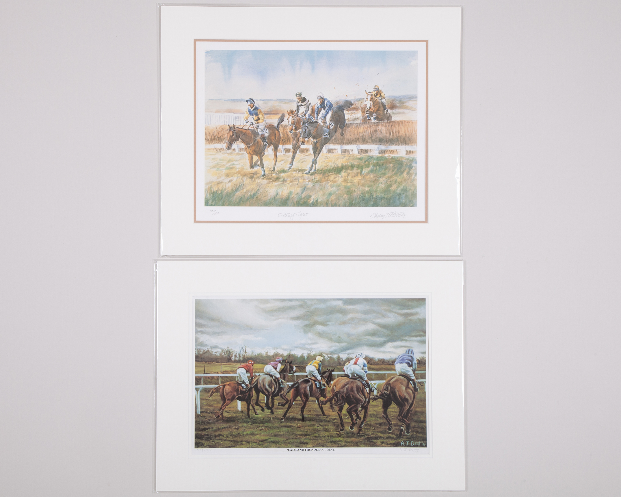 402/700, mounted, 74 by 68cm with the rest smaller, with fold crease, with two limited edition prints, the signed by Adrian Dent (British, 1966) titled; Calm and Thunder, 435/500, mounted, the second signed by an artist surname Hobson titled; Sitting Tight, 78/500, mounted (3)