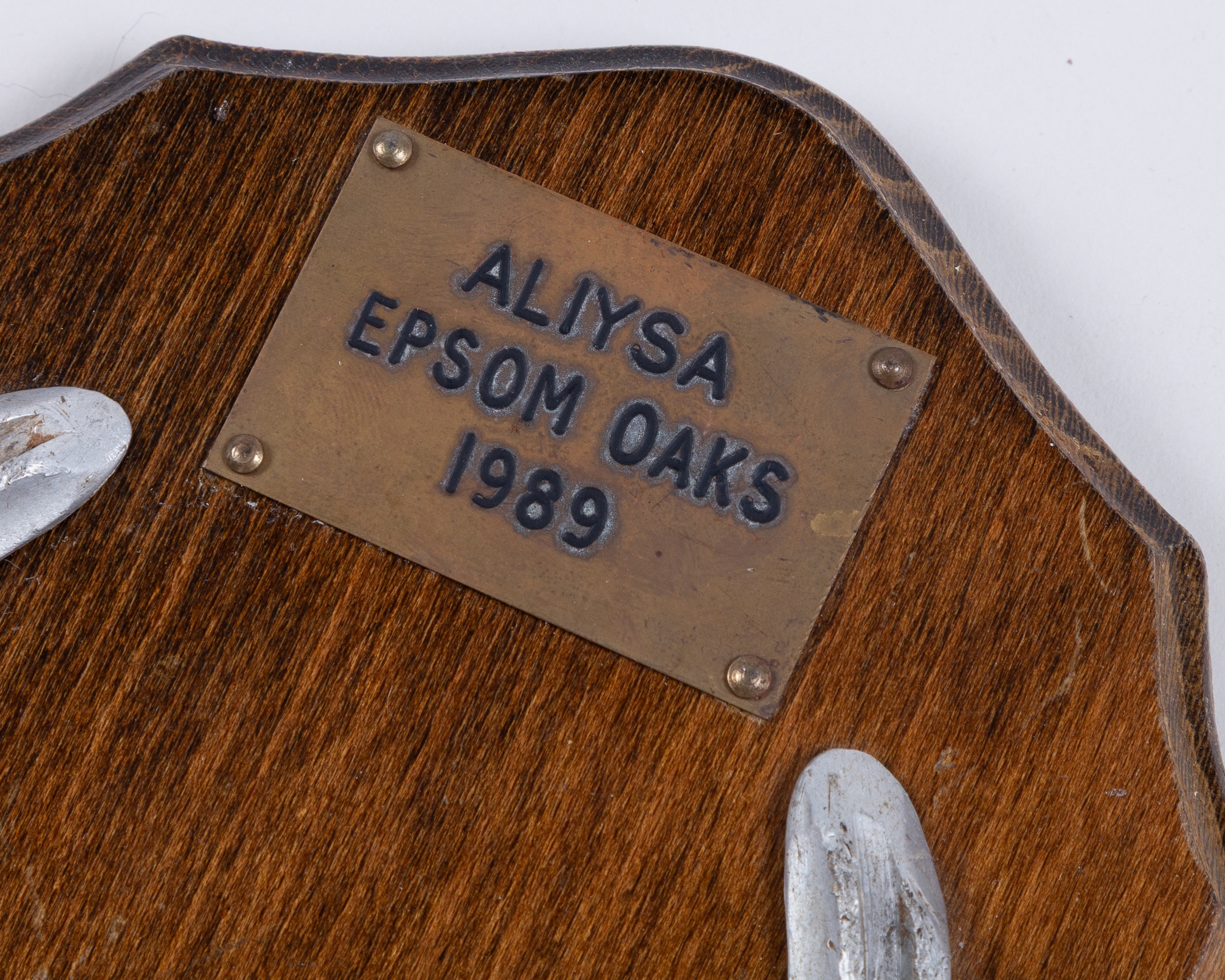 mounted on a wooden shield with brass plaque inscribed ALIYSA, EPSOM OAKS, 1989