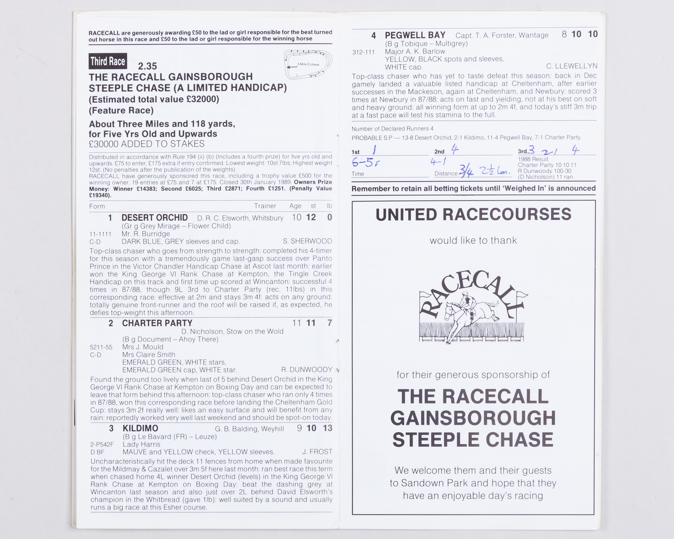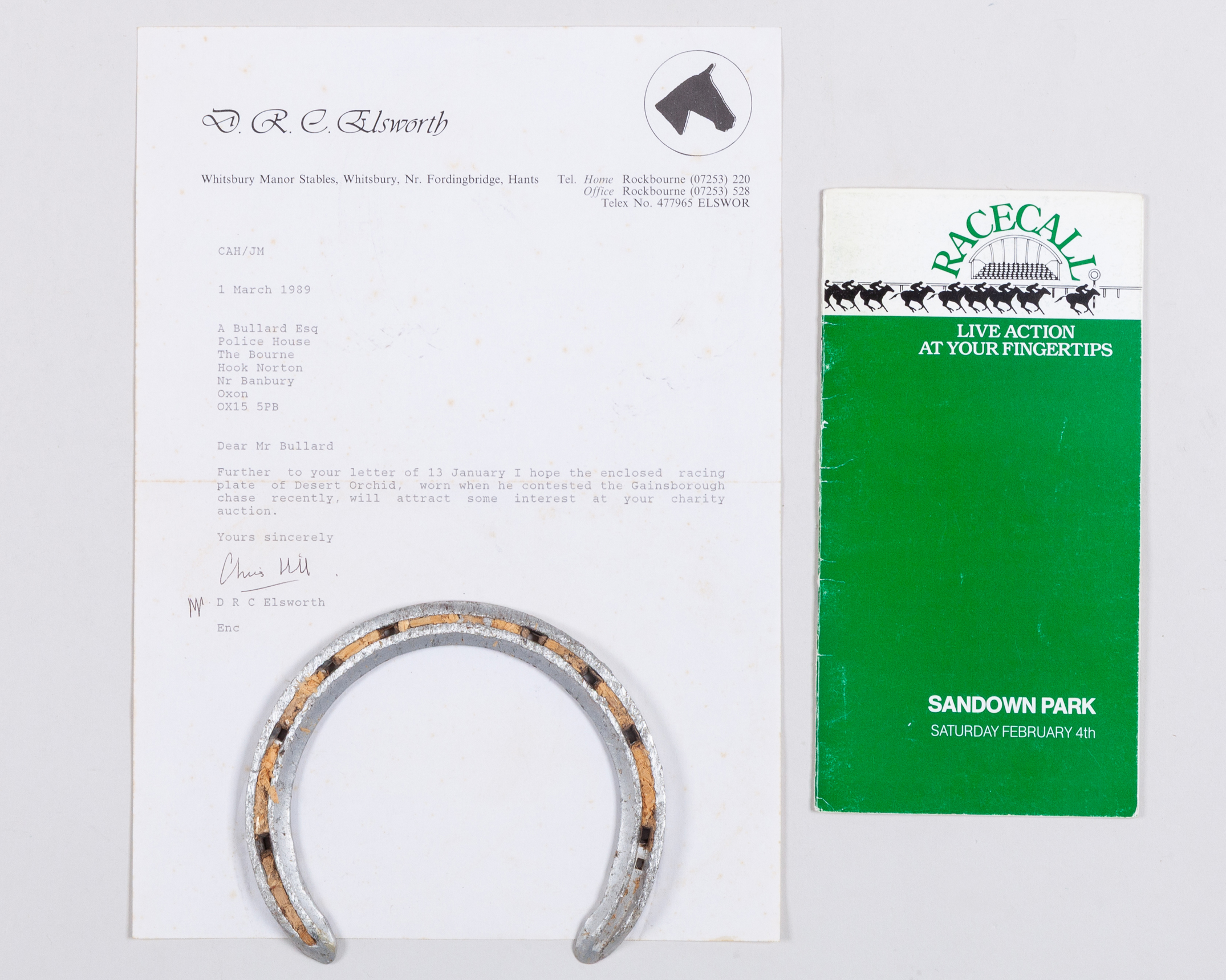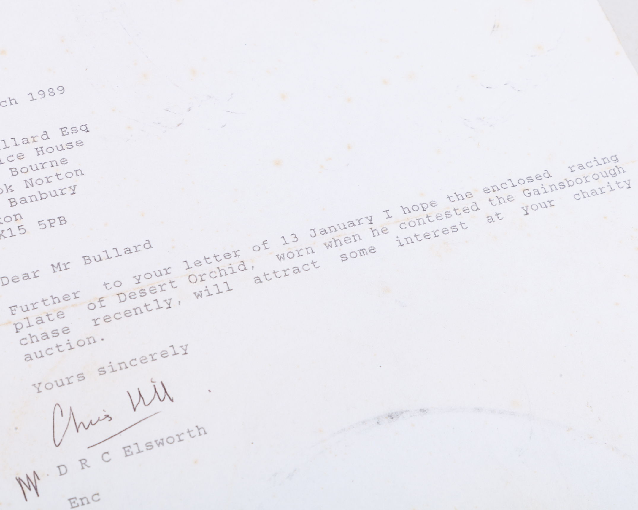 sold with a signed letter of authenticity from Chris Hill on behalf of David Eslworth on Whitsbury Manor Stables stationery dated 1st March 1989; the lot also including a racecard for the day 4th February 1989 (3)