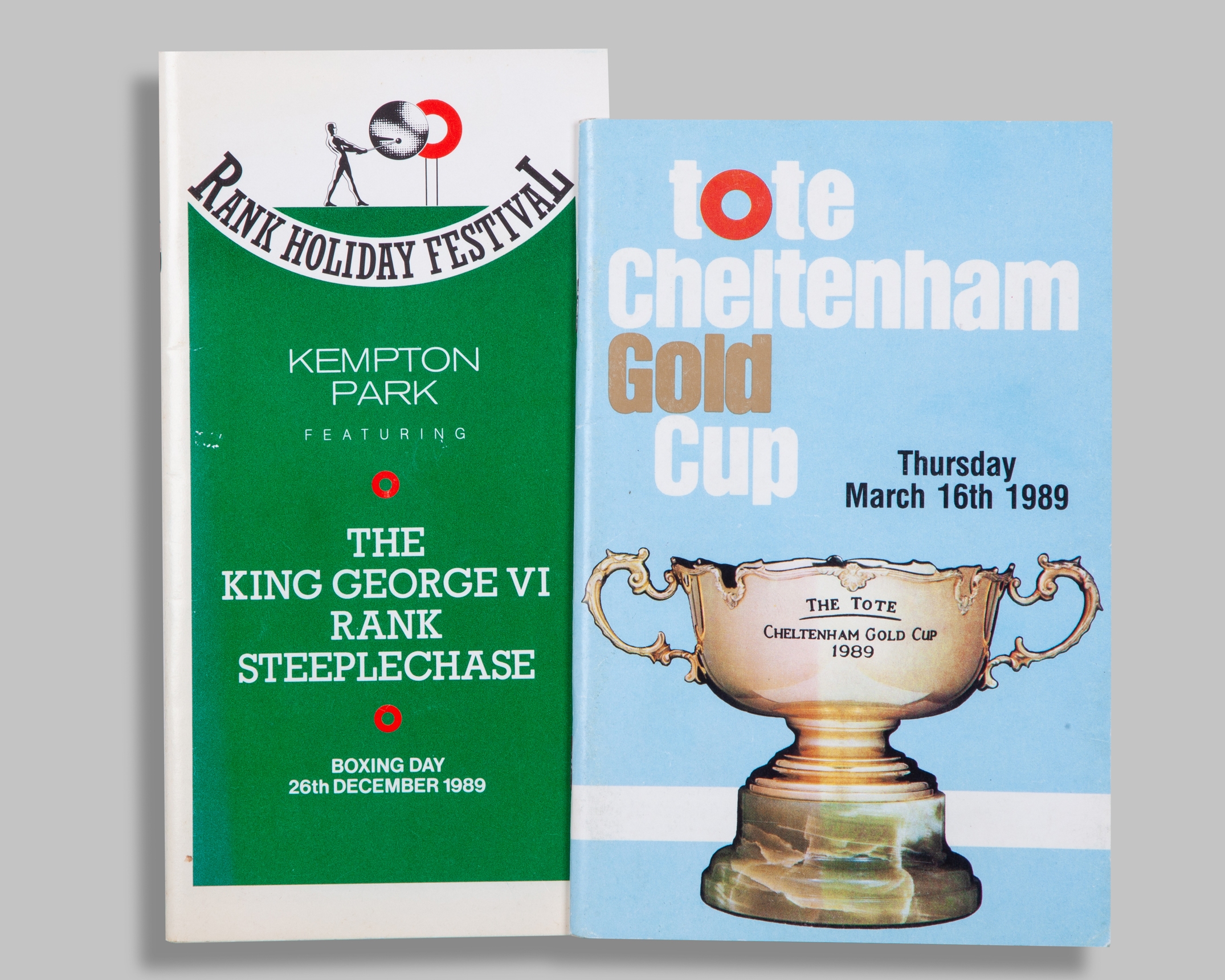 from a limited edition of 50 created to support a charity, signed by the horse's owner Richard Burridge and trainer David Elsworth, mounted, framed & glazed, 38 by 30cm.; offered with racecards for the 1989 Cheltenham Gold Cup and King George VI Chase (3)