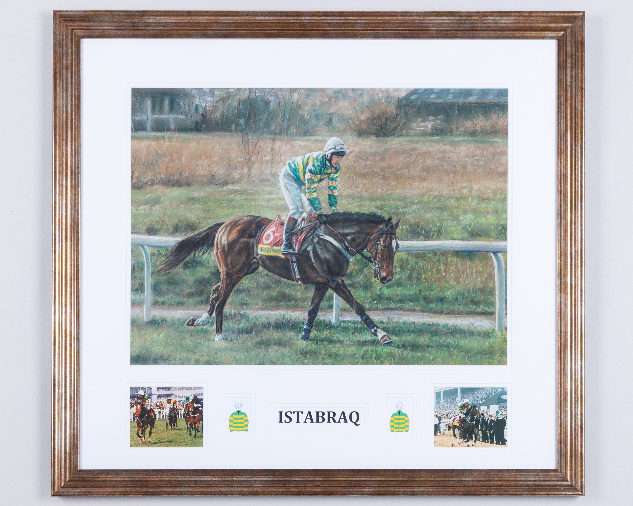 Adrian Dent (British, 1966) pastel drawing of Istabraq with Charlie Swan up