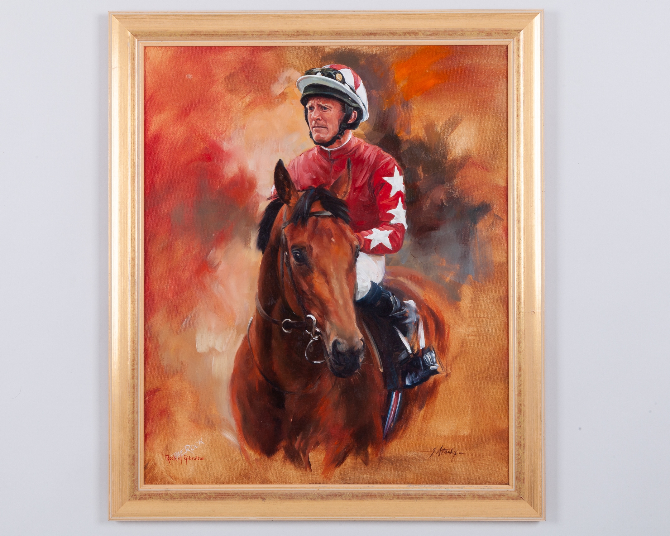 Jacqueline Stanhope (British, contemporary) oil painting of the racehorse Rock Of Gibraltar with Mick Kinane up,