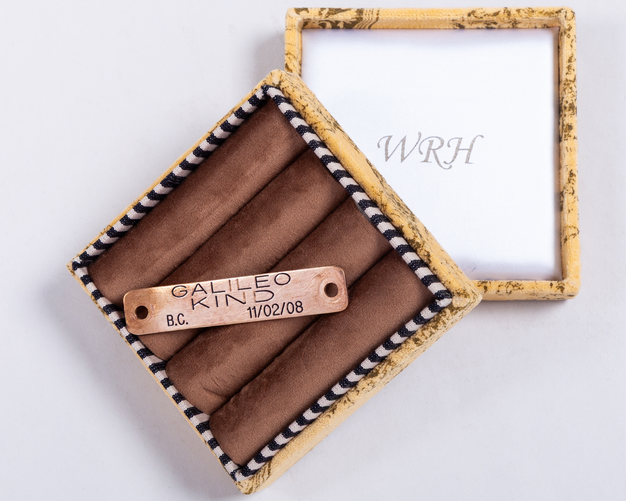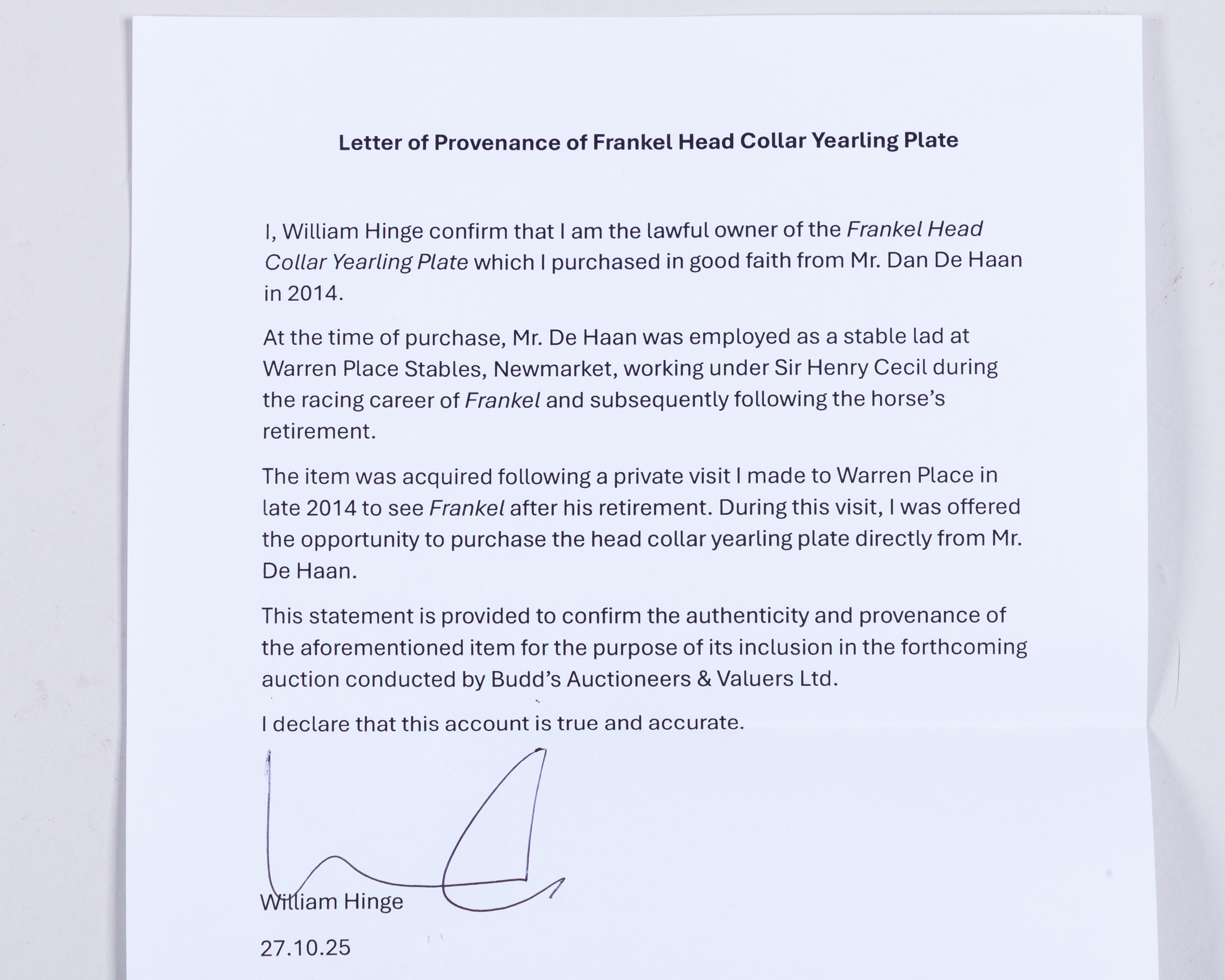 a completely unique piece of racing memorabilia used when the future superstar of the Turf was still an unnamed yearling, the brass plate inscribed with pedigree, colour & sex and foaling date GALILEO, KIND, B.C., 11/02/08; sold with a signed letter of provenance from the vendor confirming that he acquired the nameplate from Dan De Haan, Frankel’s work rider during the colt’s formative years.