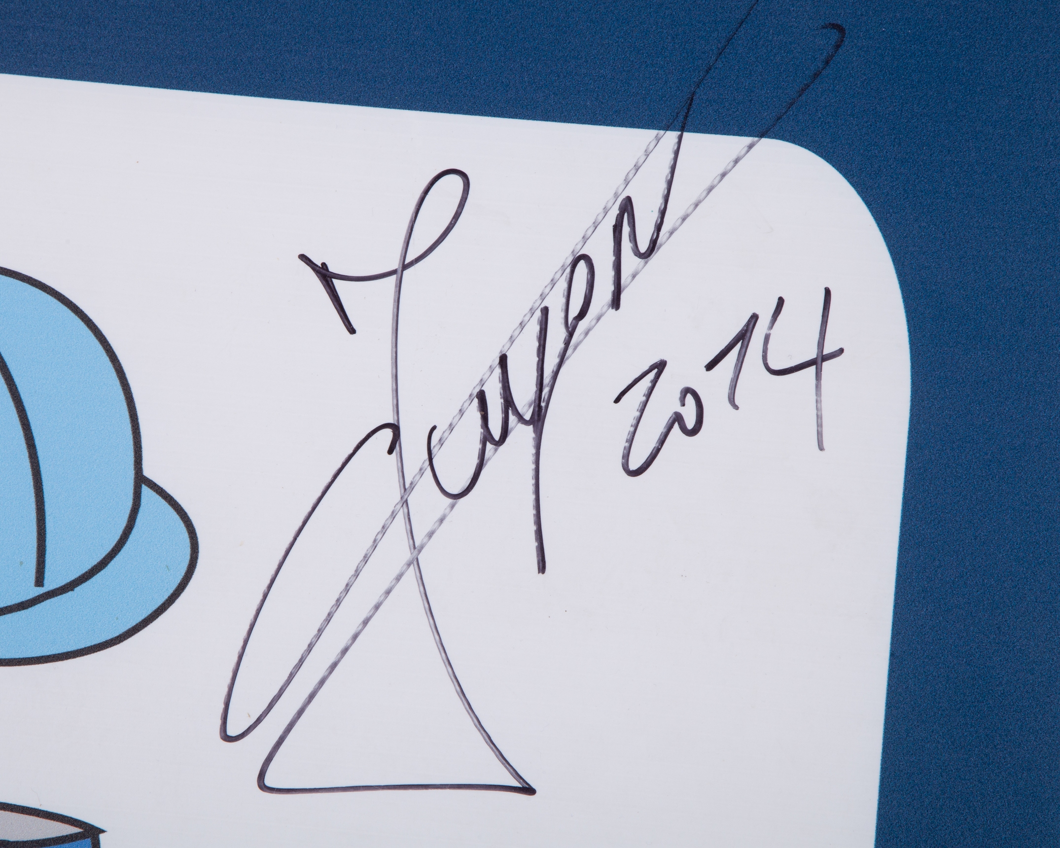 signed in black marker, the dark blue and white artboard sign printed with the QIPCO British Champions Series details, an owner's colours graphic and the names of the horse, jockey, trainer & owner, 122 by 46cm., good condition