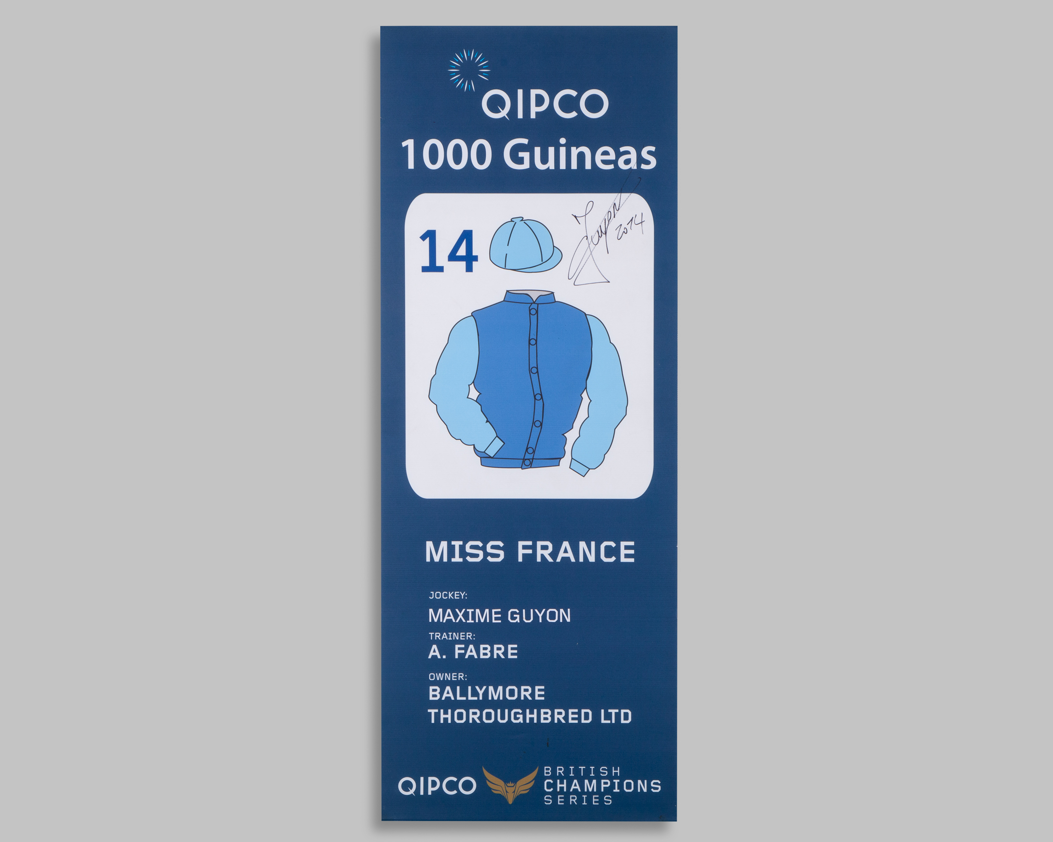 QIPCO British Champions Series 2014 1000 Guineas paddock parade pennant for the winning horse Miss France signed by jockey Maxime Guyon,