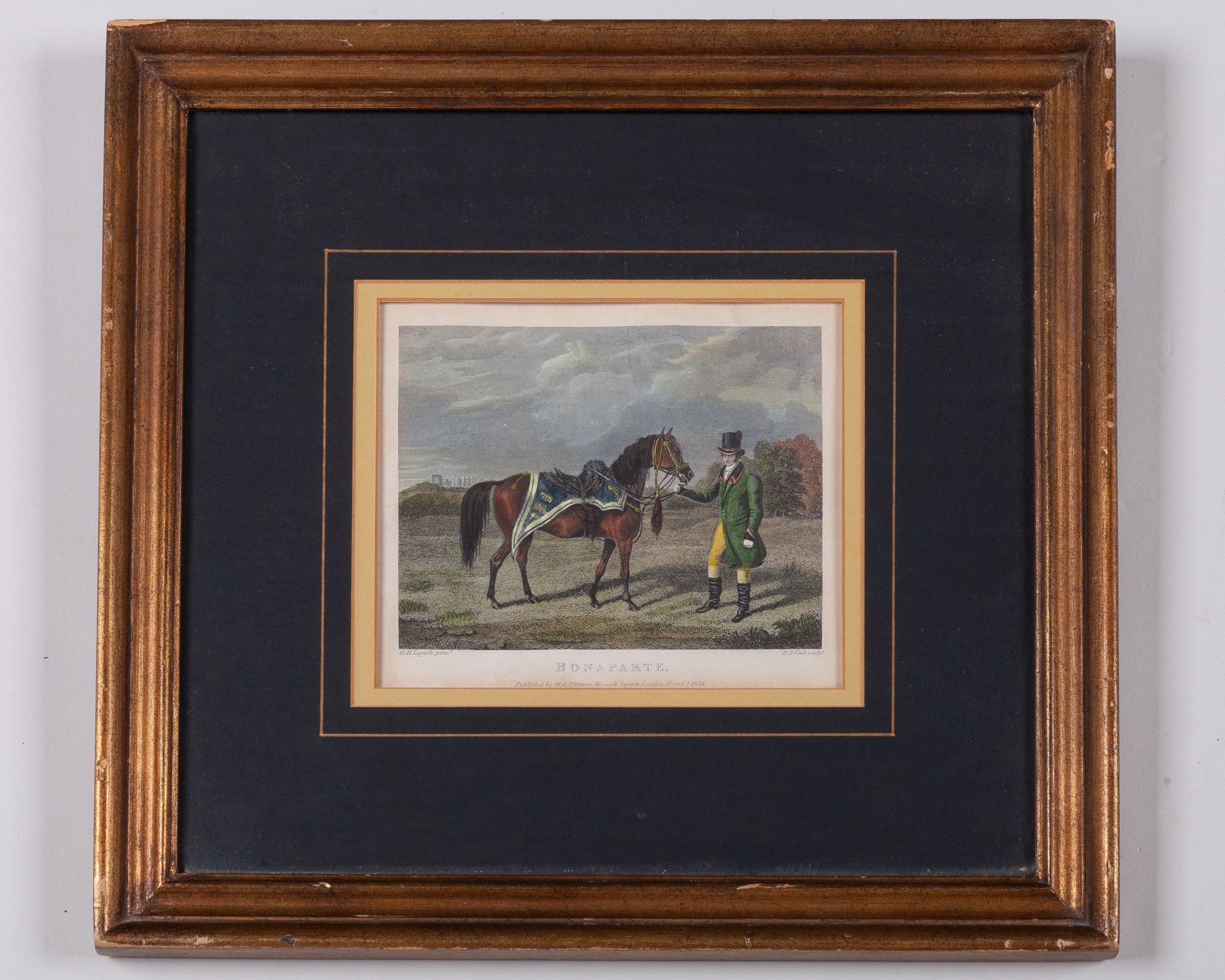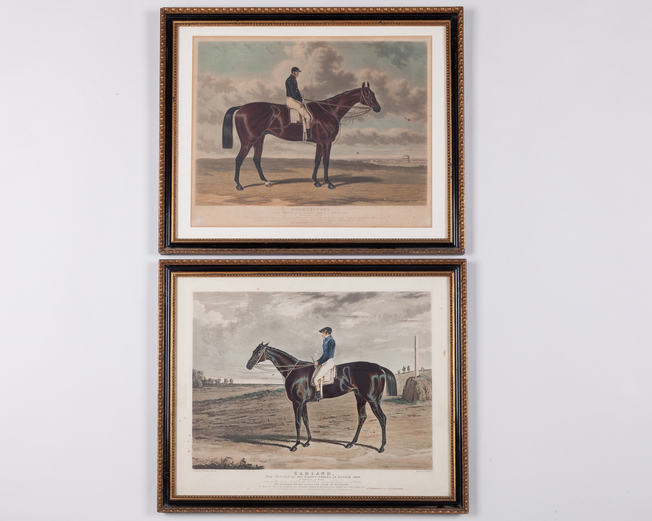 a John Frederick Herring Sr. (British, 1795-1865) portrait of CADLAND (1828); and a Harry Hall (British, c.1814-1882) portait of COTHERSTONE (1843) engraved by Charles Hunt, both published by S & J Fuller, Sporting Gallery, London, uniformly mounted, framed & glazed, 46 by 56cm.; sold together with a smaller frame containing a colour bookplate by George Herny Laporte (British, 1799-1873) of a horse named ‘Bonaparte’ being held by a groom (3 items)